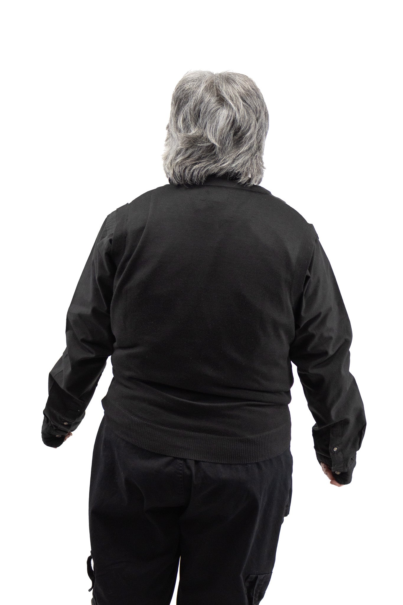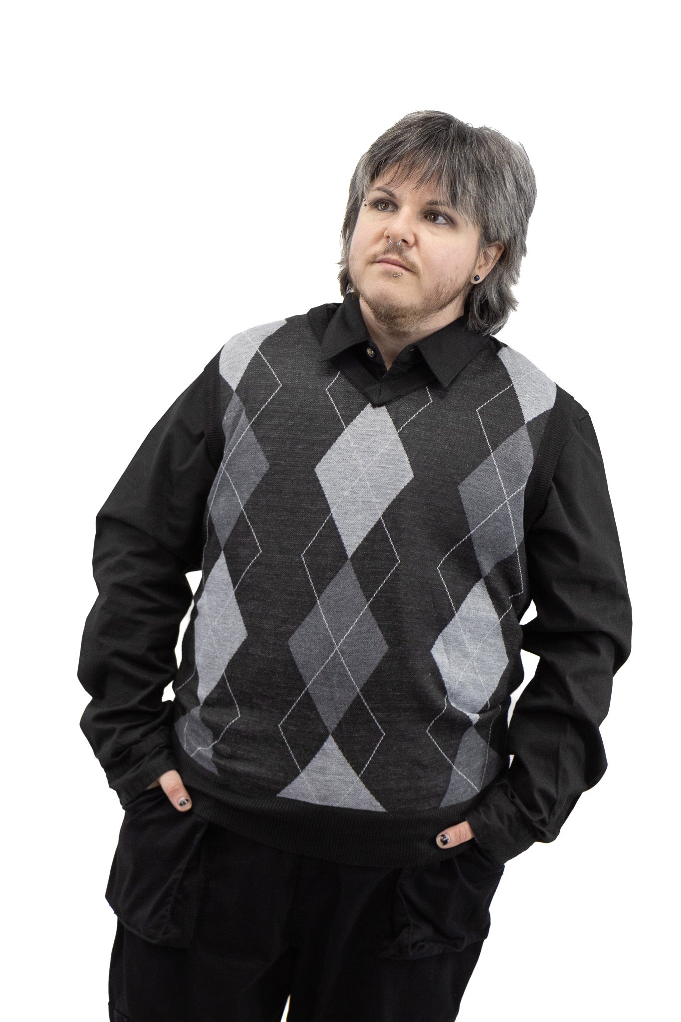This knit sweater vest features a greyscale diamond argyle print on the front and a solid back. Perfect for distinguished layering on a cold day!