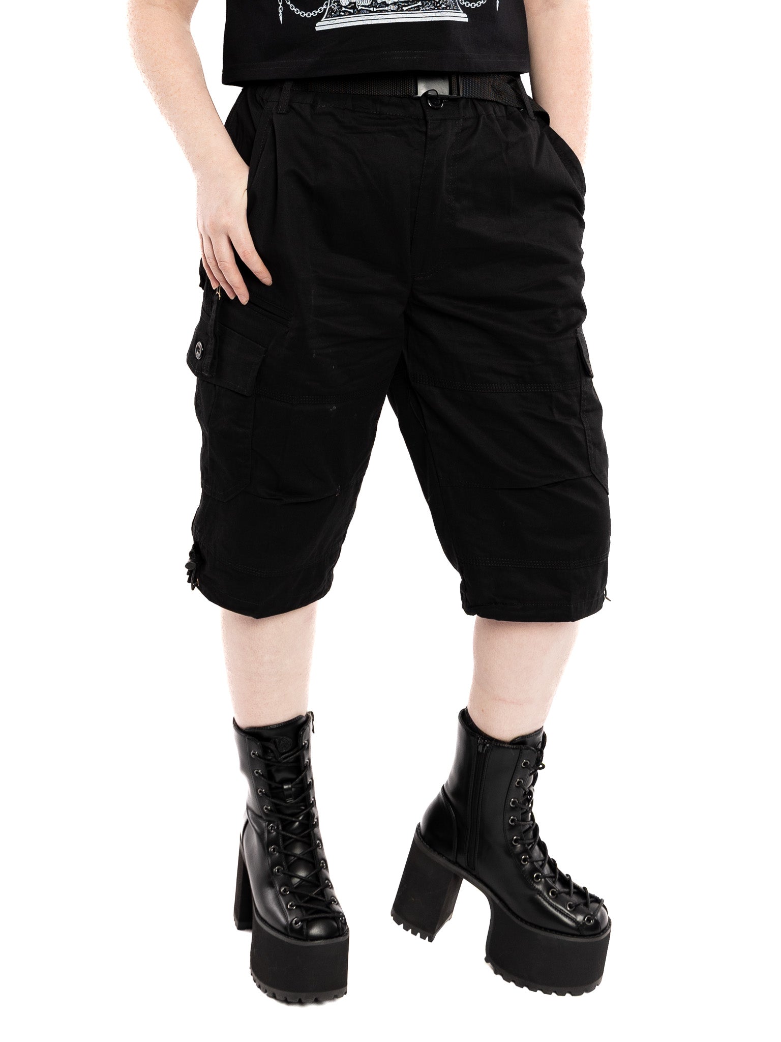 Their versatile side button cargo pockets plus 4 standard front and back pockets leave plenty of space for anything you need, and the knee length fit and woven buckle belt make them easy to pair with a button front shirt for a classier look.