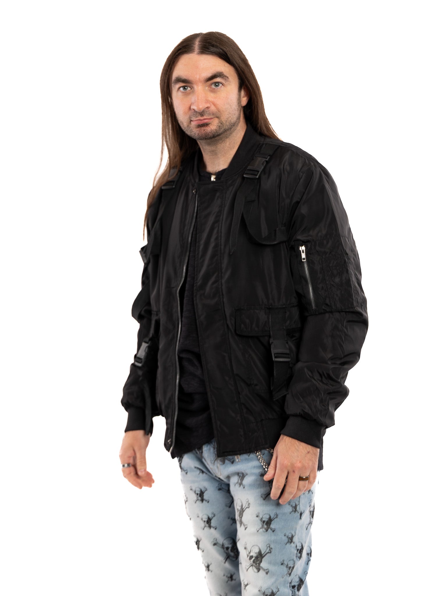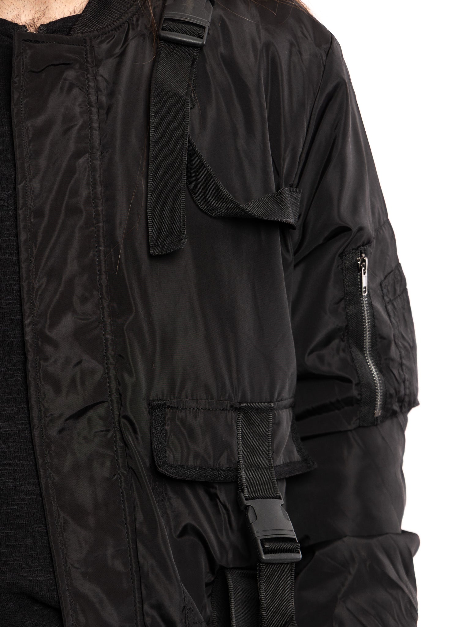 Need to take it with you? This jacket can carry it! This bomber features tactical straps on the shoulders, arm pocket and straps, strap closures on the front pockets, and a back pocket pouch with strap closures. Ribbed cuff and collar, metal zipper closure.