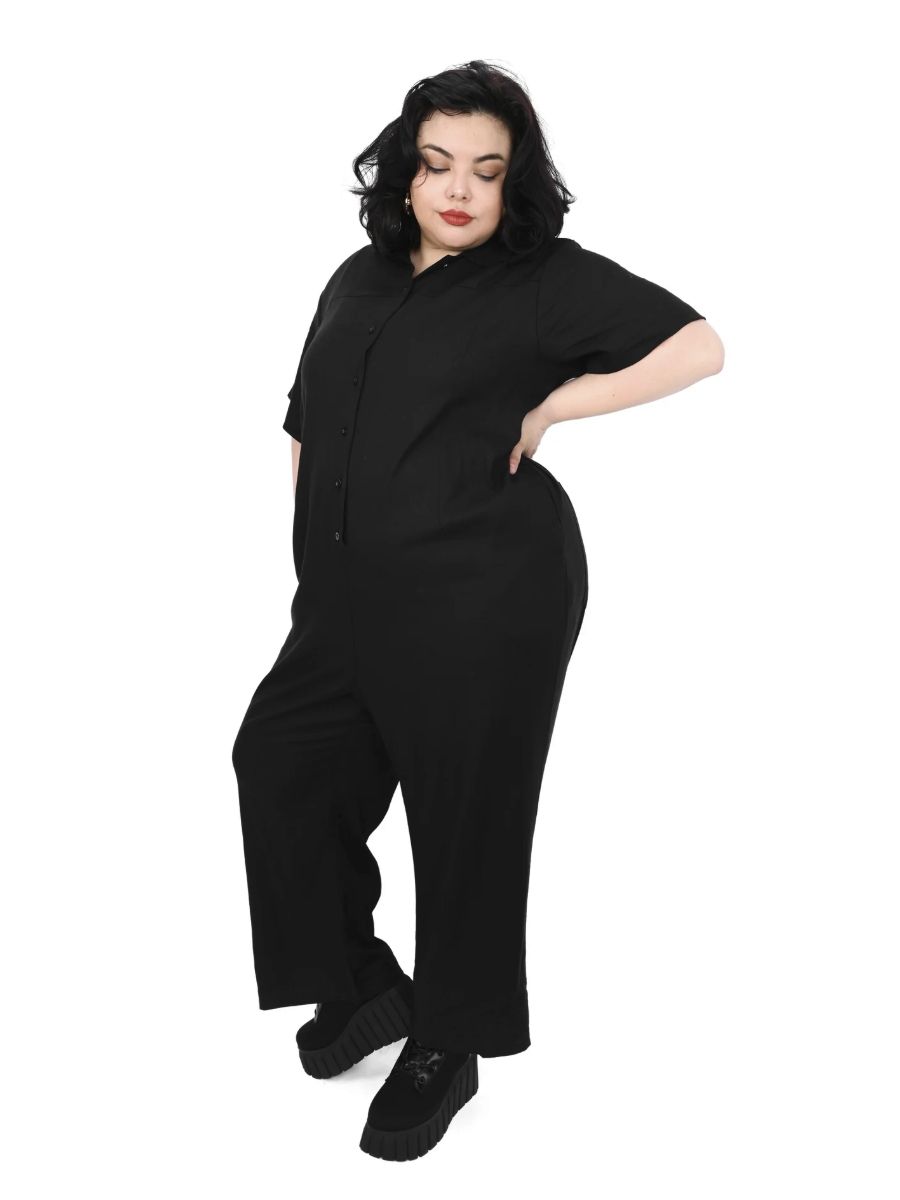 Button up short sleeve jumpsuit made out of a lightweight linen blend, the same as the Riley Babydoll Dress.