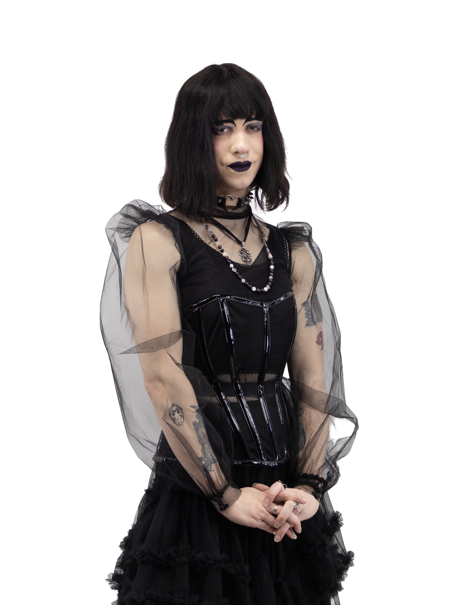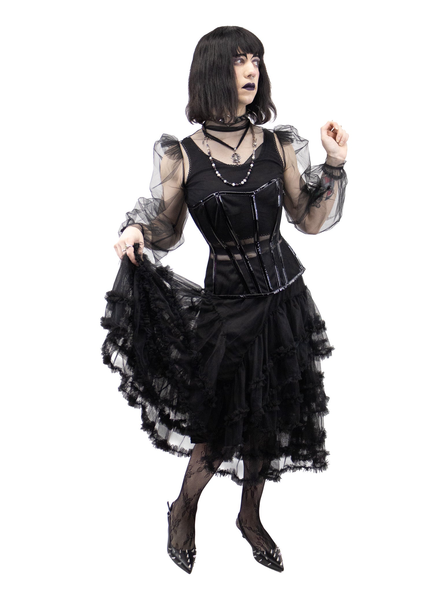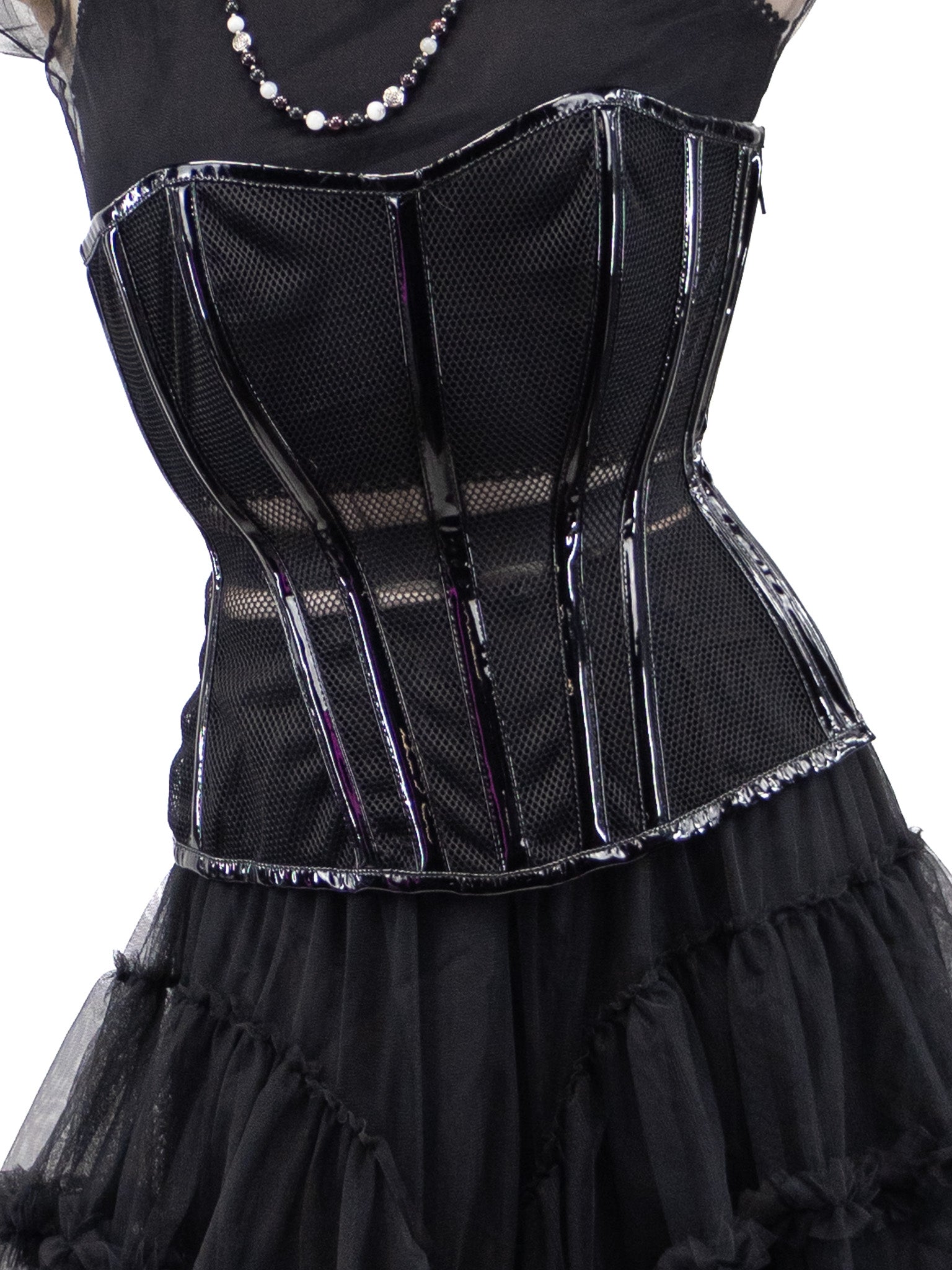 This fullbust corset with a sweetheart necklace is made of premium fishnet & patent fabric trim. Side zipper closure and ribbon lace-up back for cinching.