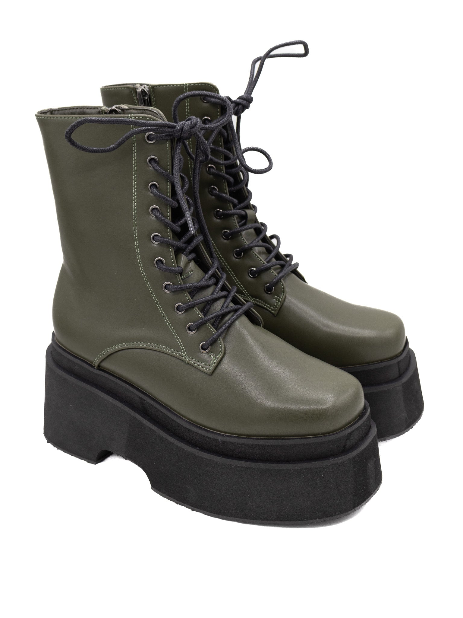 The perfect swampy green color! These lace-up platform combat booties have a 7" shaft height with an inside zip closure. 2.5" lightweight platform sole with 3" heel.