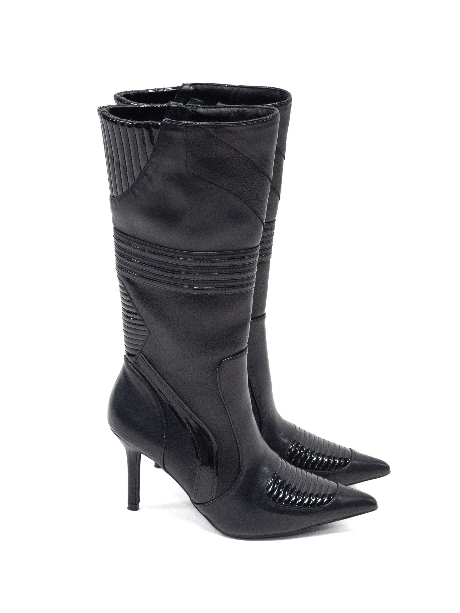 Yes, stiletto boots! These mid-calf faux leather pointed toe stilettos have eye catching motocross details and an inside zip closure.