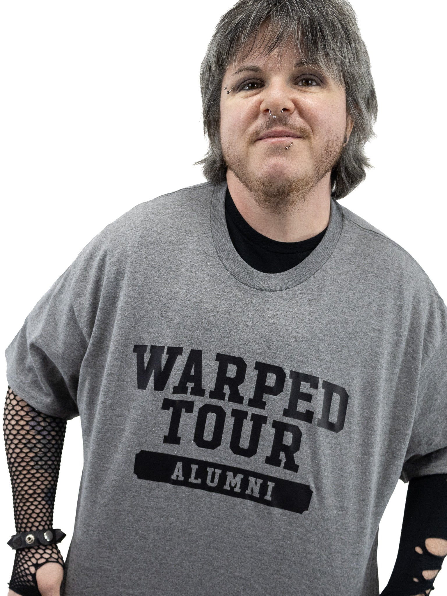 Rep your Warped Tour memories on this comfy grey heather tee. Featuring a classic black collegiate design that reads "Warped Tour Alumni," this shirt is perfect for reliving the nostalgia of those epic summer concerts.