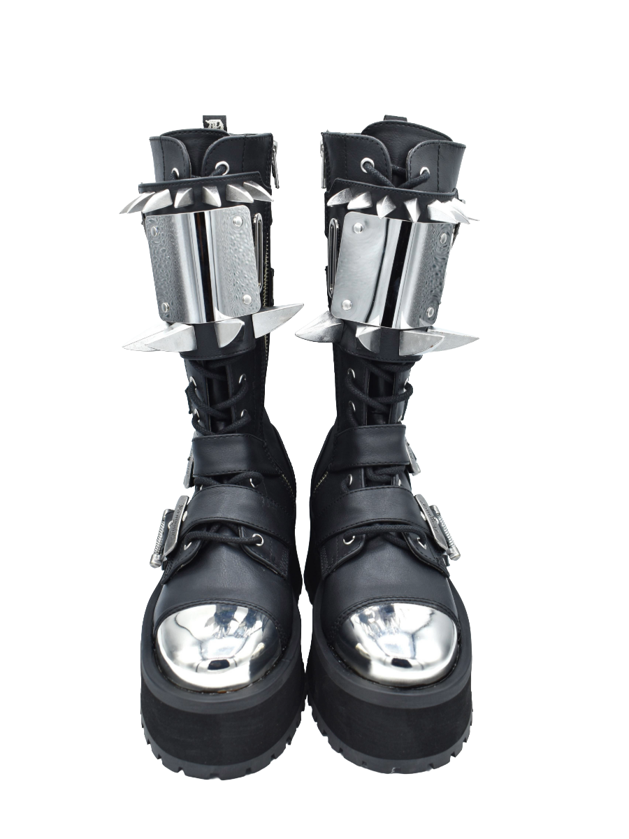 2 3/4" (70mm) Platform Silver Chrome Plated Metal Toe Cap Lace-Up Mid-Calf Boot W/ Buckle Straps & Cuff Featuring Large Silver Chrome Plate & Large and Small Claw Spikes, Inside Metal Zip Closure