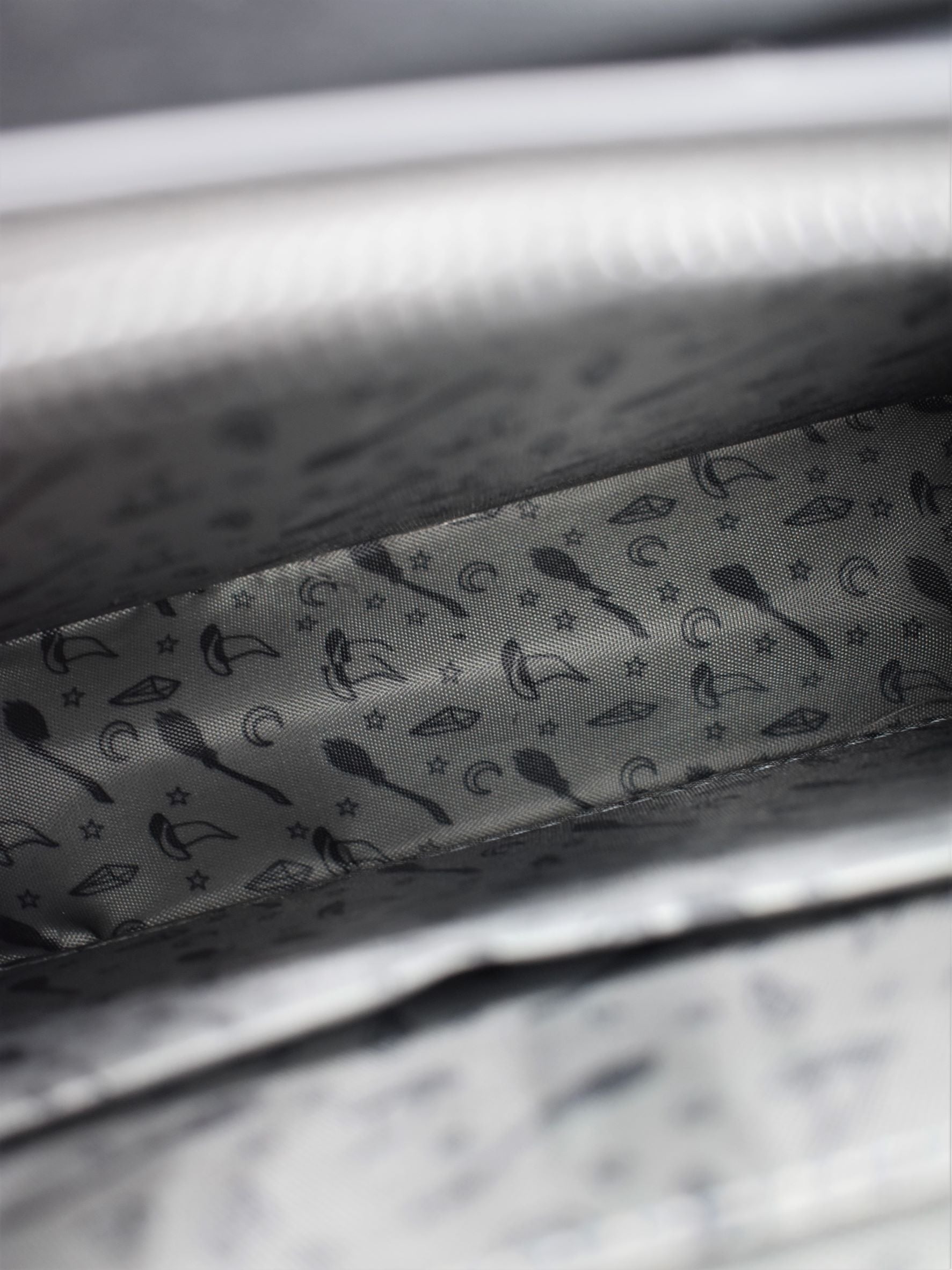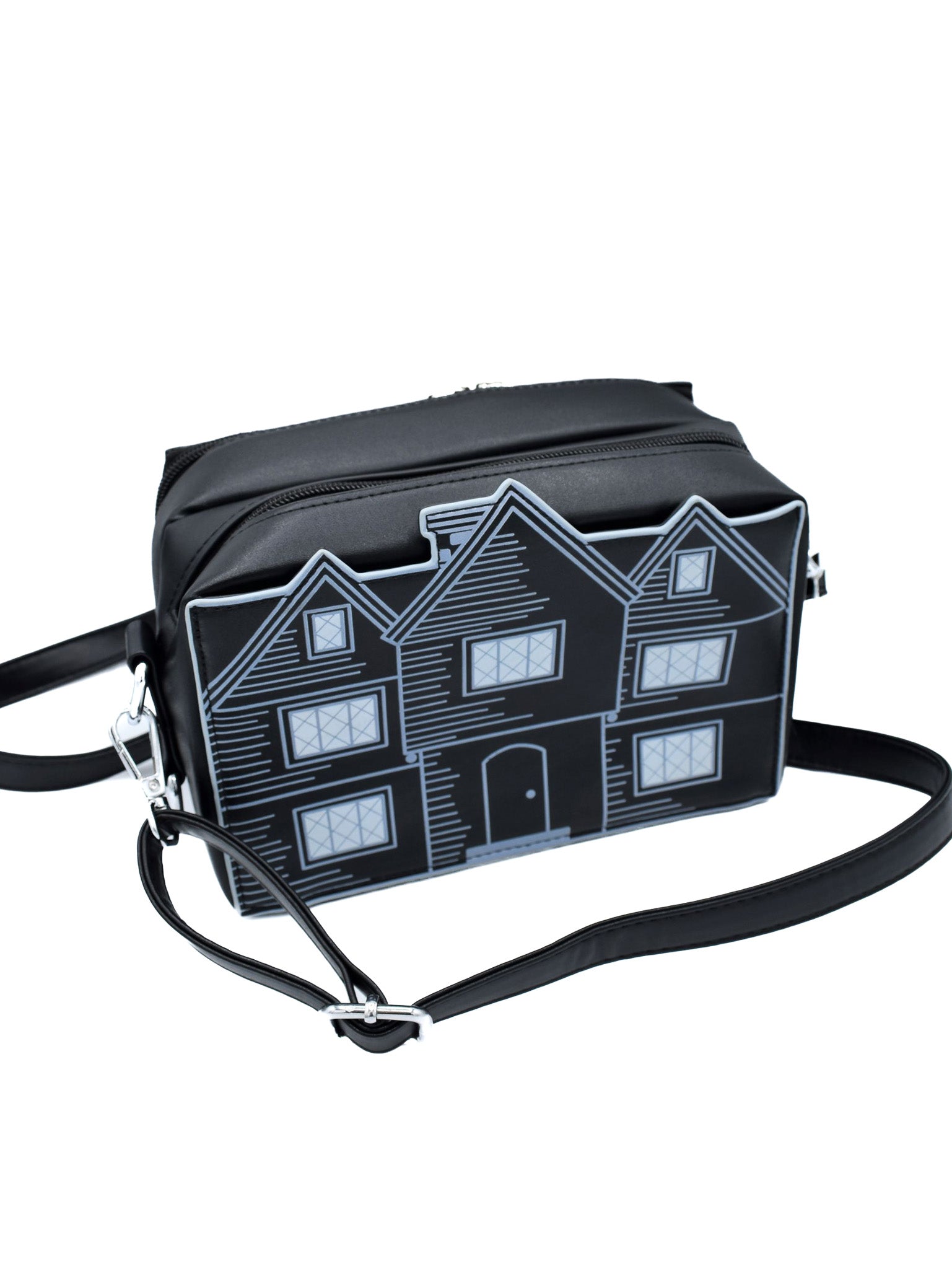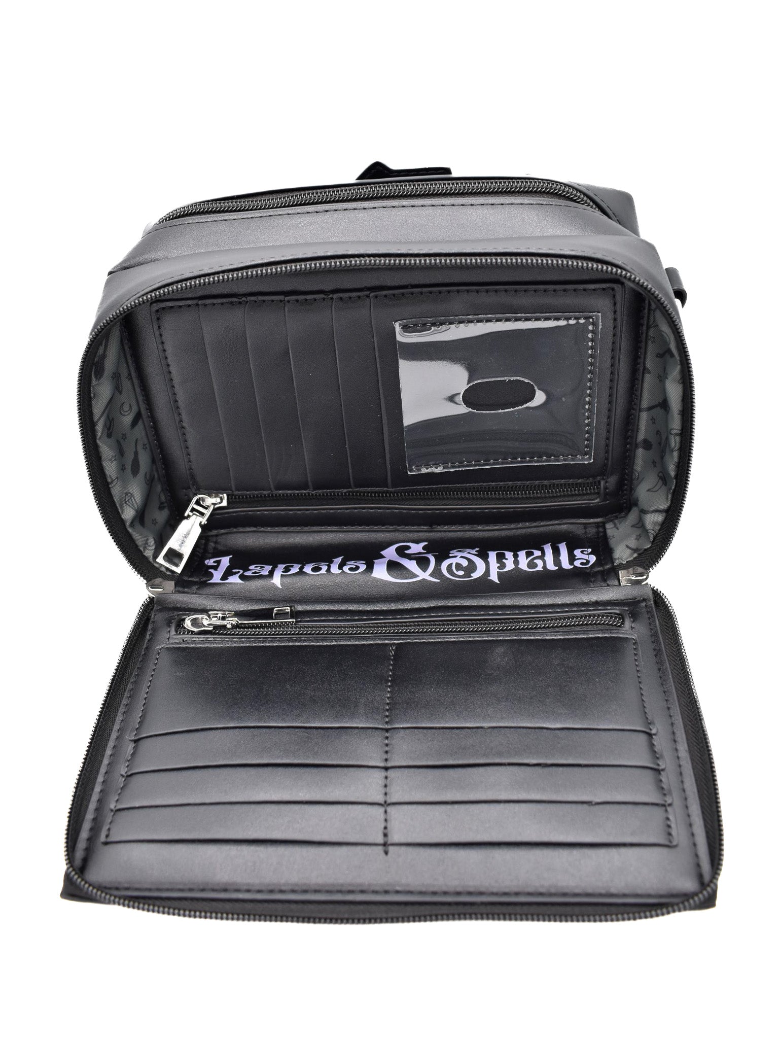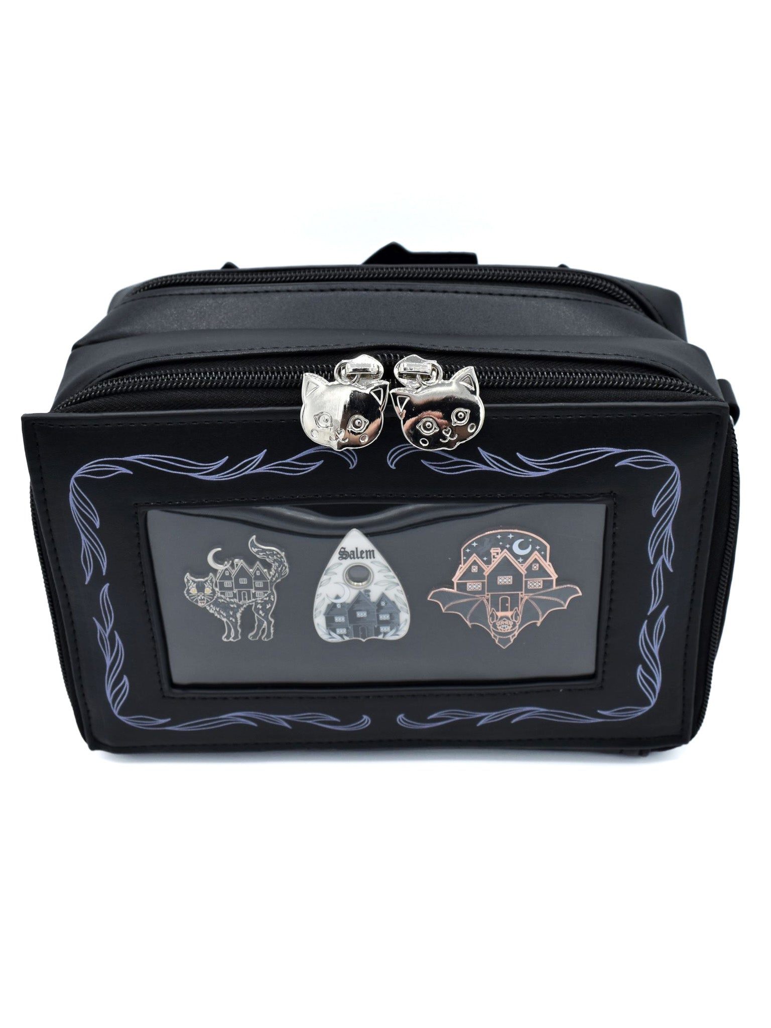 This amazing Witch House Ita bag is custom designed by Stina of Lapels & Spells / Laserbrain Patch Co, and features so many amazing functional details! Bag measures 8" wide, 5" tall, 4" deep. Removable strap is adjustable from 27" to 52", and attaches via swivel lobster clasps. Double d-ring attachment points on each side allow you to secure the strap, plus hang a key ring, water bottle holder, or other accessories on the outside of the bag. Two zippered sections: built-in wallet on one side, storage on the other. Wallet section includes ID holder, 12 credit card sized slots, and zippered pouch, plus a clear 5.5"x3" pin window surrounded by a leaf pattern with black pin insert and interior zippered closure. Storage side includes a magnetic snap closure exterior pouch behind the Witch House and interior pocket in the custom designed patterned lining. Zippers are adorned with three adorable kitty zipper pulls.