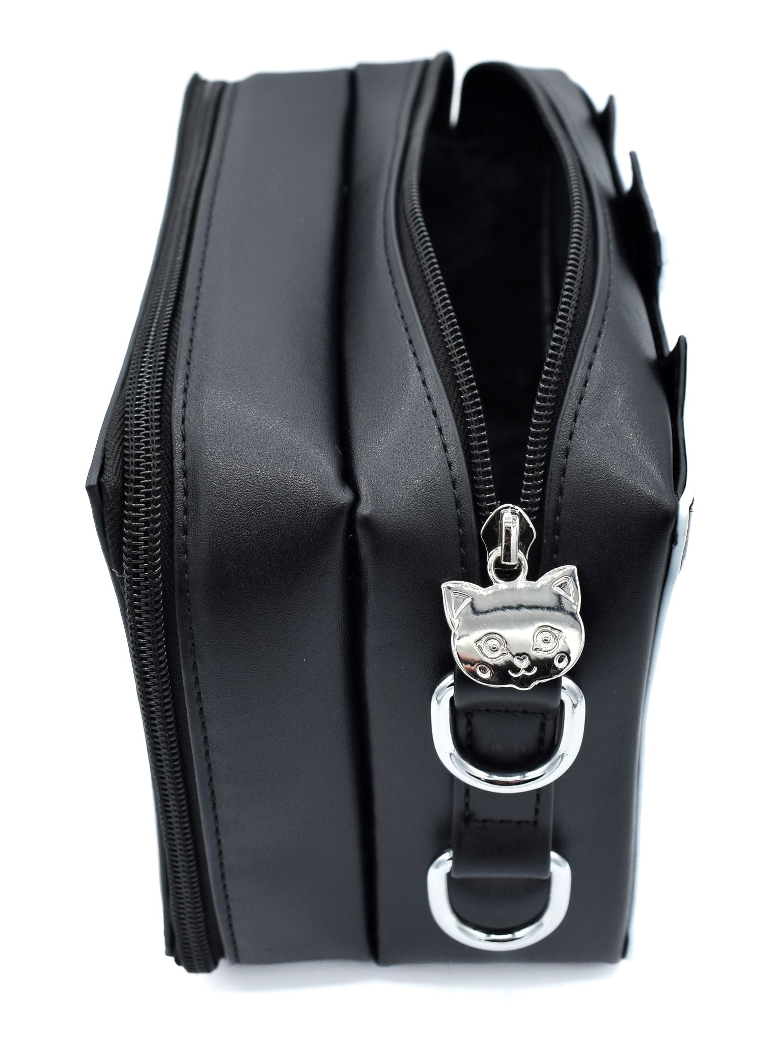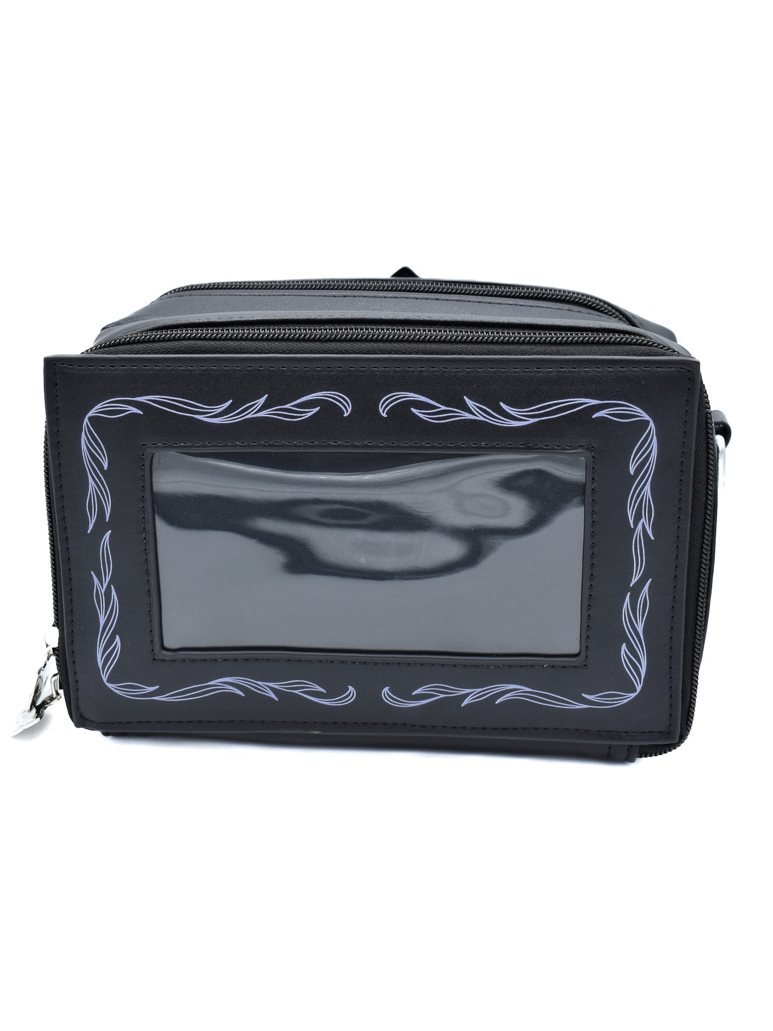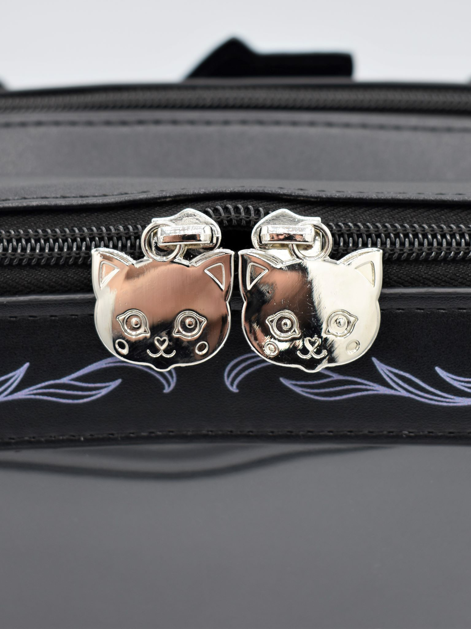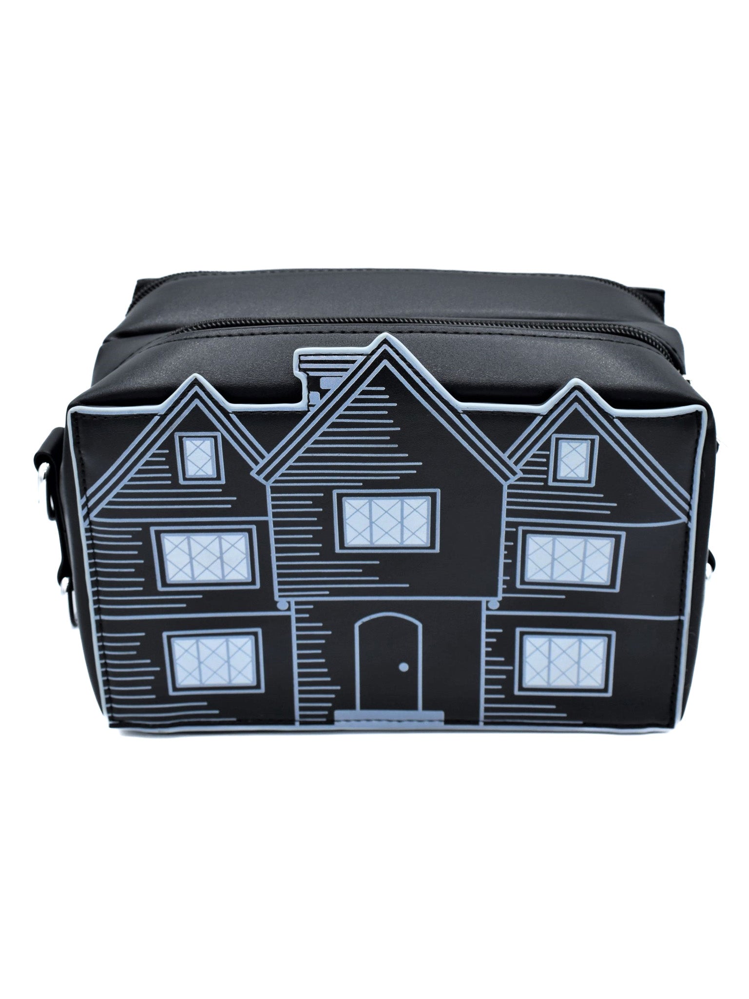 This amazing Witch House Ita bag is custom designed by Stina of Lapels & Spells / Laserbrain Patch Co, and features so many amazing functional details! Bag measures 8" wide, 5" tall, 4" deep. Removable strap is adjustable from 27" to 52", and attaches via swivel lobster clasps. Double d-ring attachment points on each side allow you to secure the strap, plus hang a key ring, water bottle holder, or other accessories on the outside of the bag. Two zippered sections: built-in wallet on one side, storage on the other. Wallet section includes ID holder, 12 credit card sized slots, and zippered pouch, plus a clear 5.5"x3" pin window surrounded by a leaf pattern with black pin insert and interior zippered closure. Storage side includes a magnetic snap closure exterior pouch behind the Witch House and interior pocket in the custom designed patterned lining. Zippers are adorned with three adorable kitty zipper pulls.