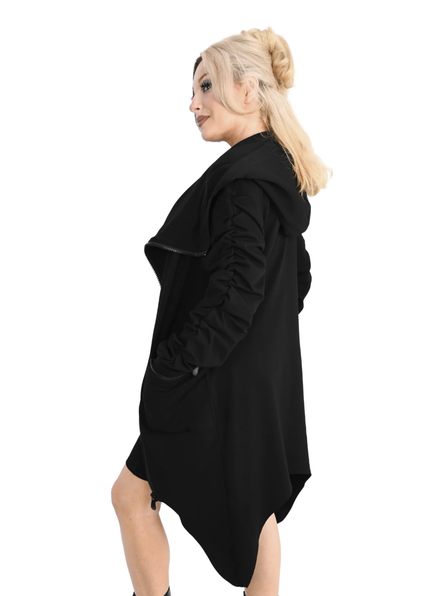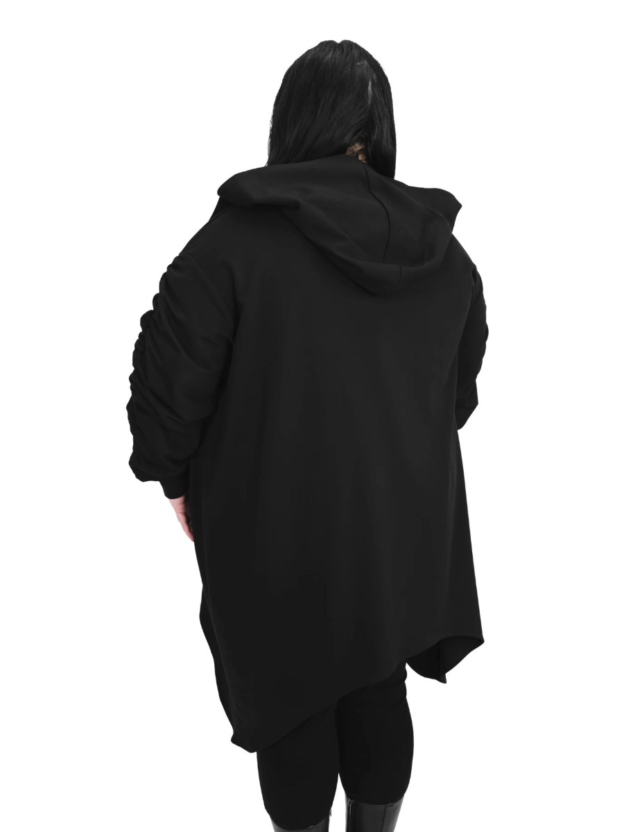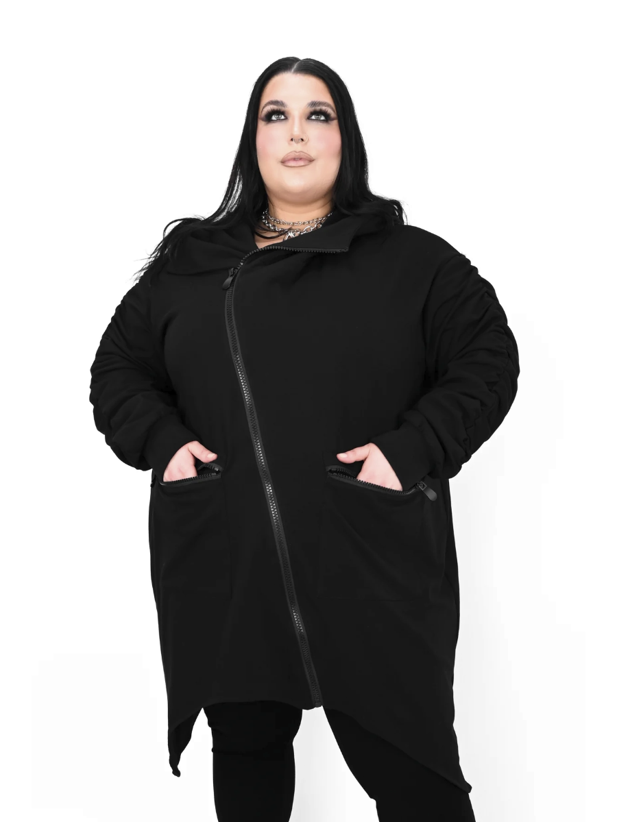 Asymmetrical bottom hem and diagonal zipper closure. Ruching on the sleeves, zipper pockets on each side and oversized hood.