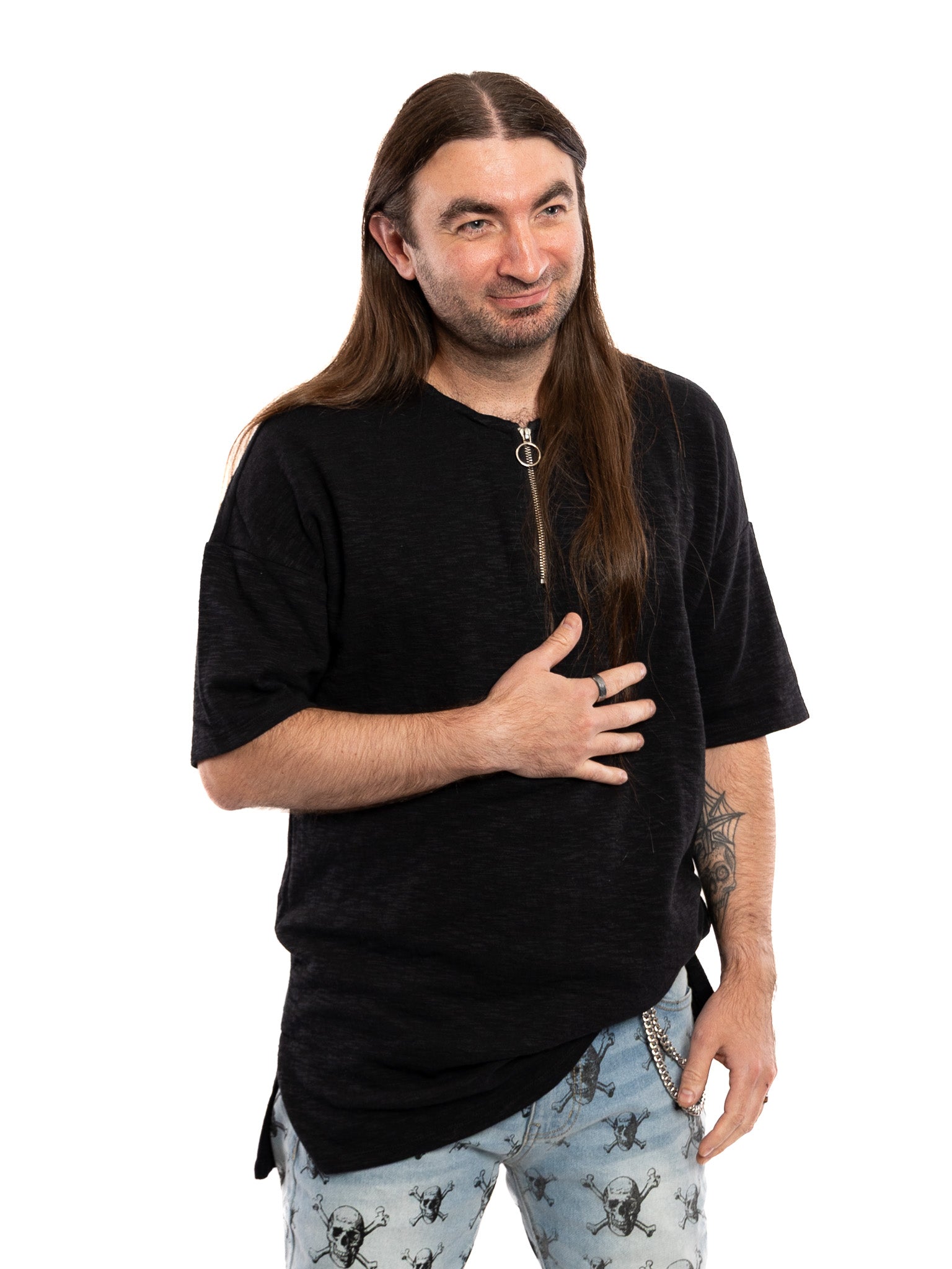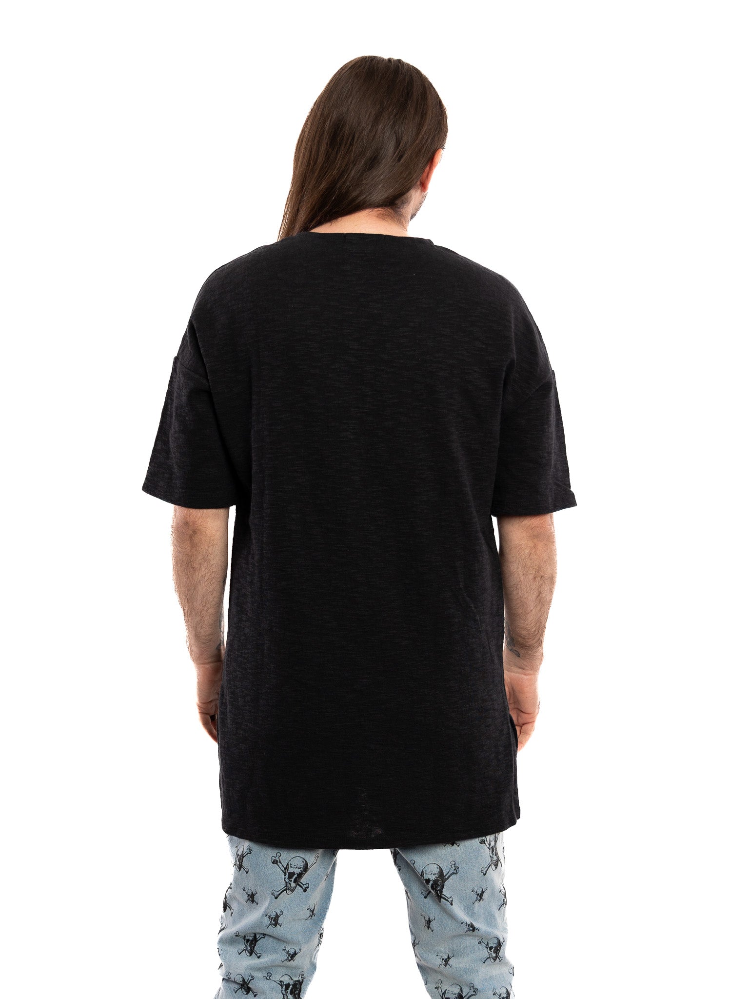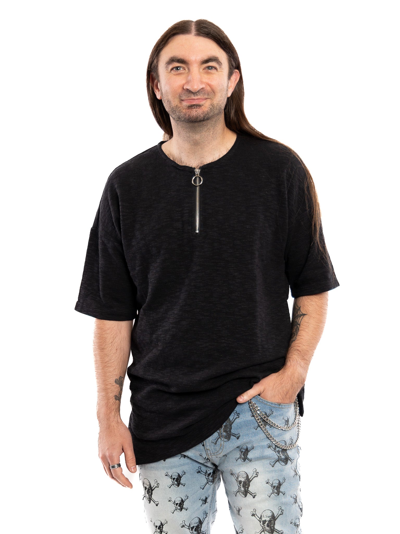 This collarless half zip tee features drop shoulders and and extended length with side vents. Heavy broken slub fabric. Metal zipper with ring pull. Oversized unisex fit.