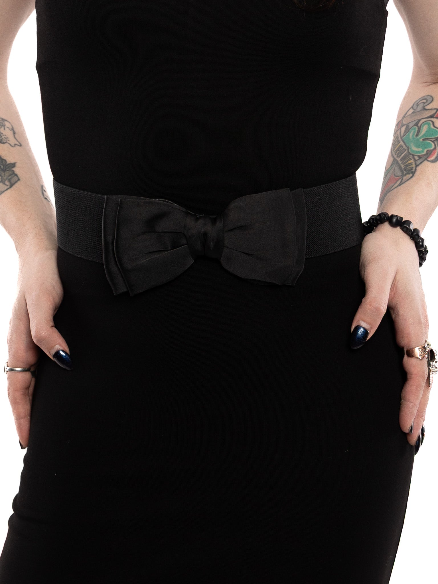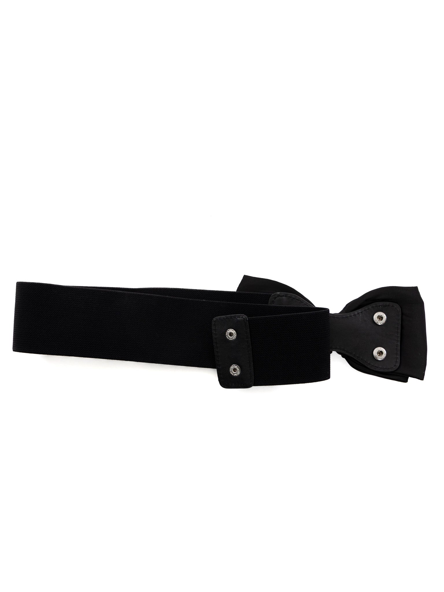 This simple black belt features a 2.5" wide woven elastic body and a simple 7"x 3.5" polyester bow.