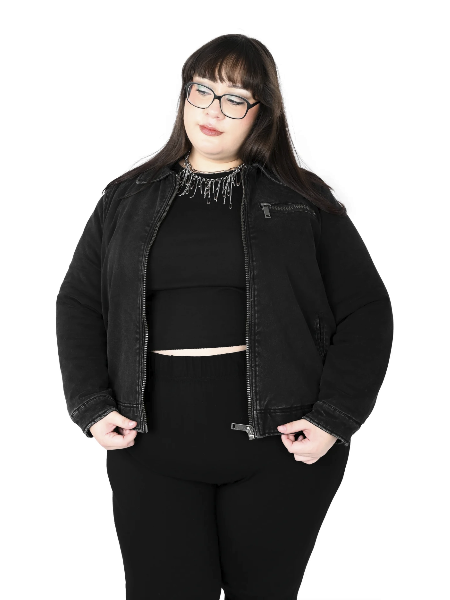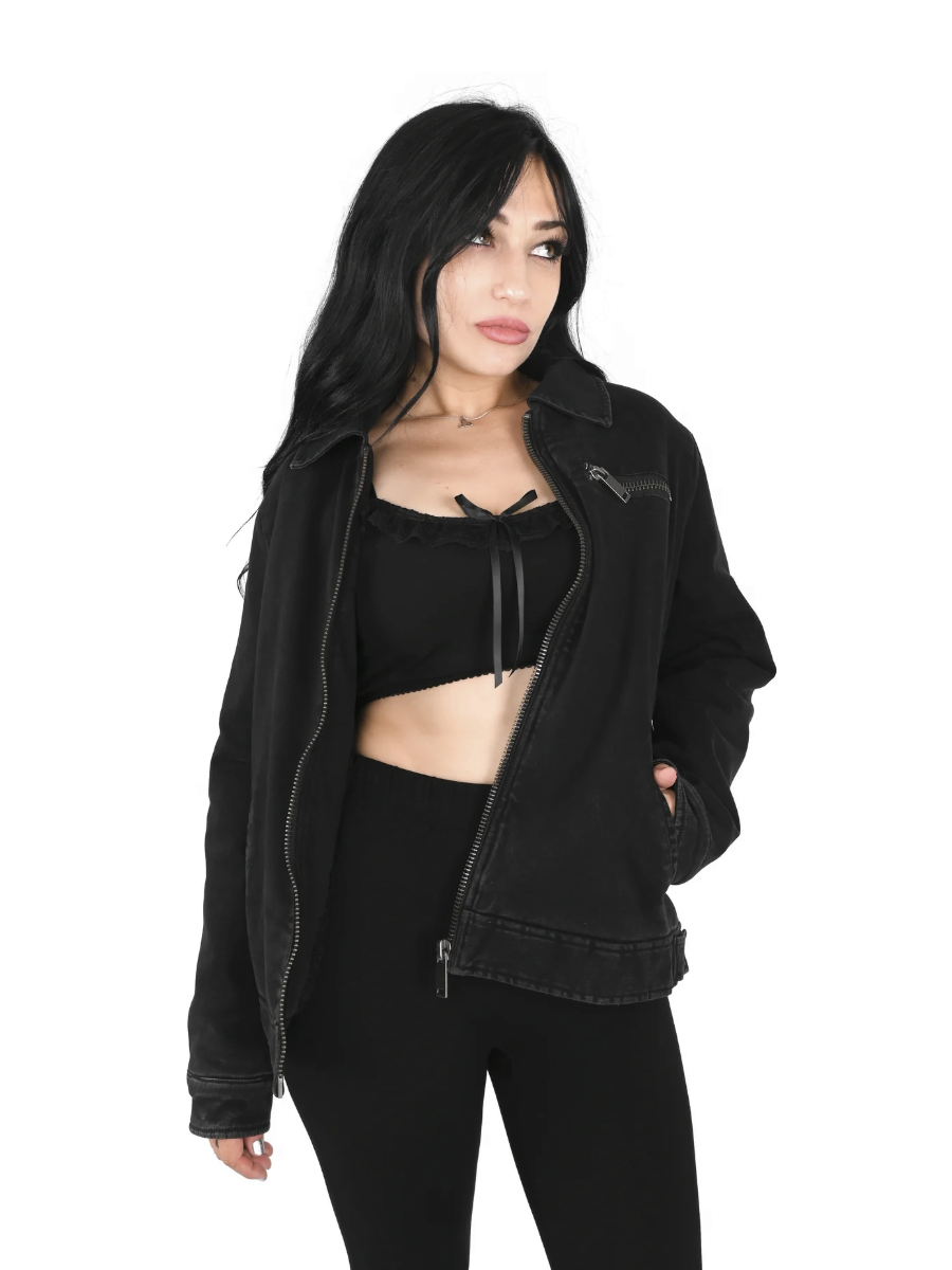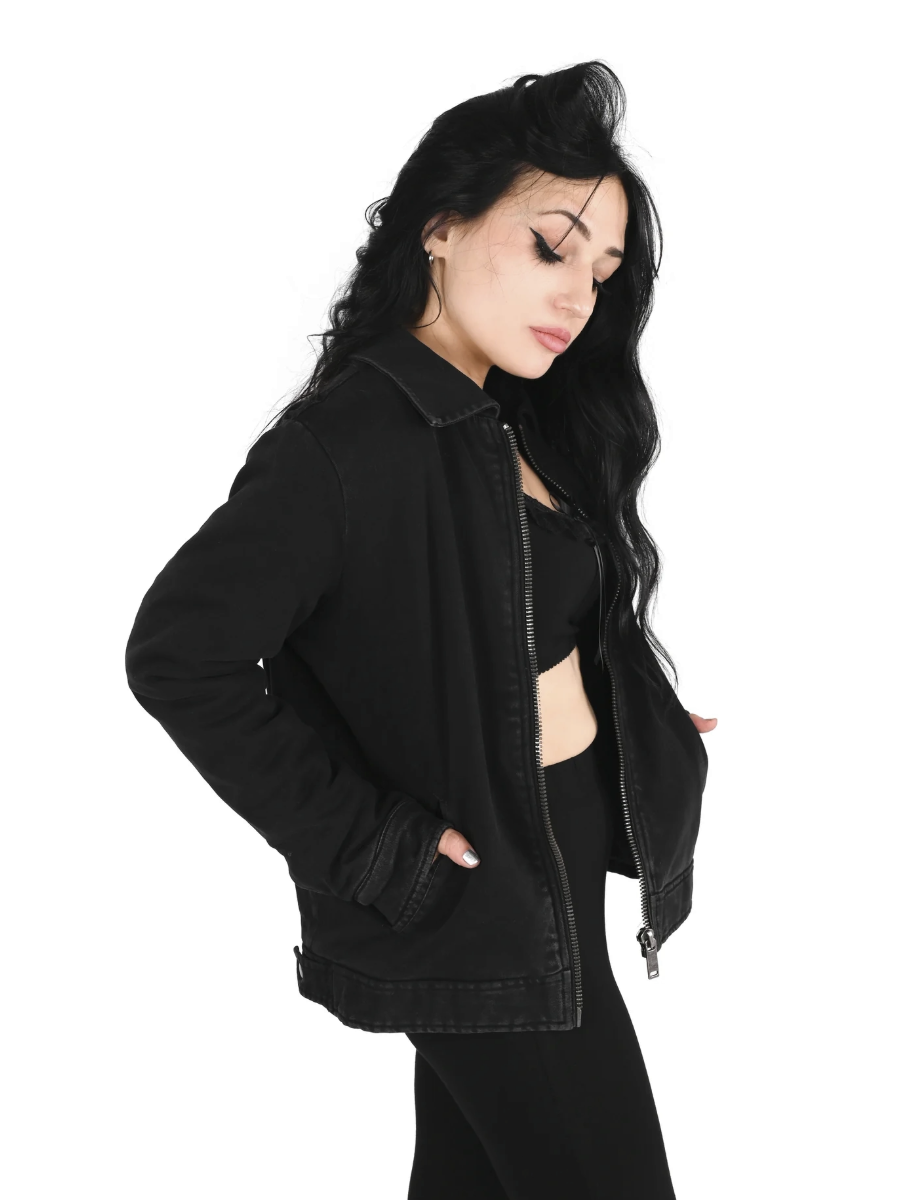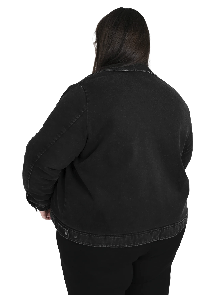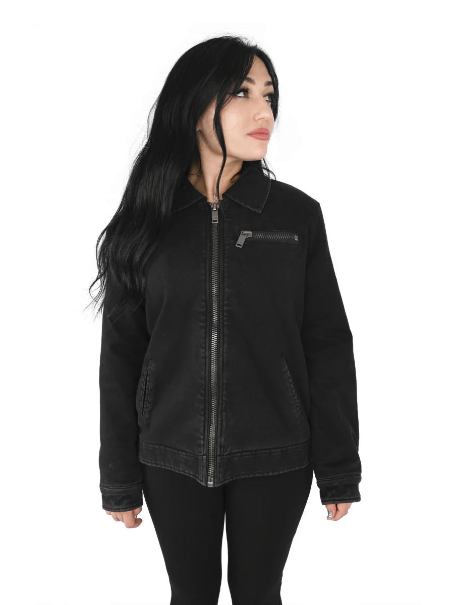 This work jacket is made out of a grey wash denim and lined in a super soft faux sherpa lining.