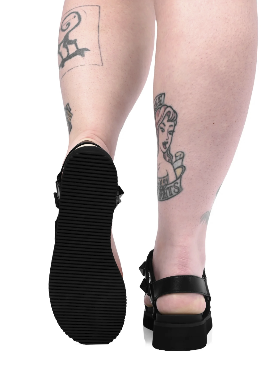 Black faux leather sandal with light weight foam soles and black pyramid studs.