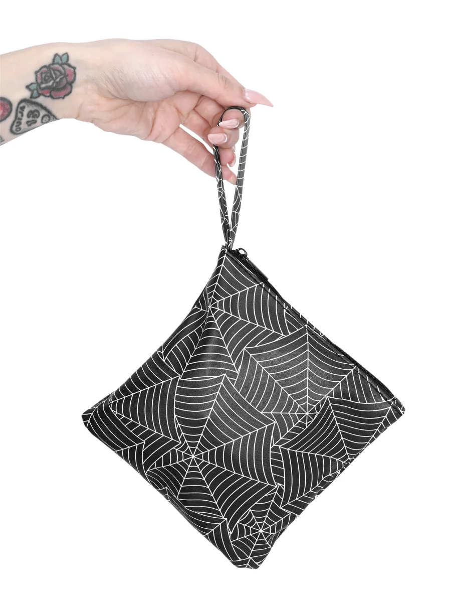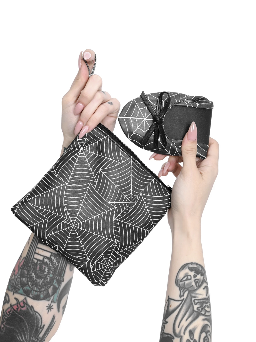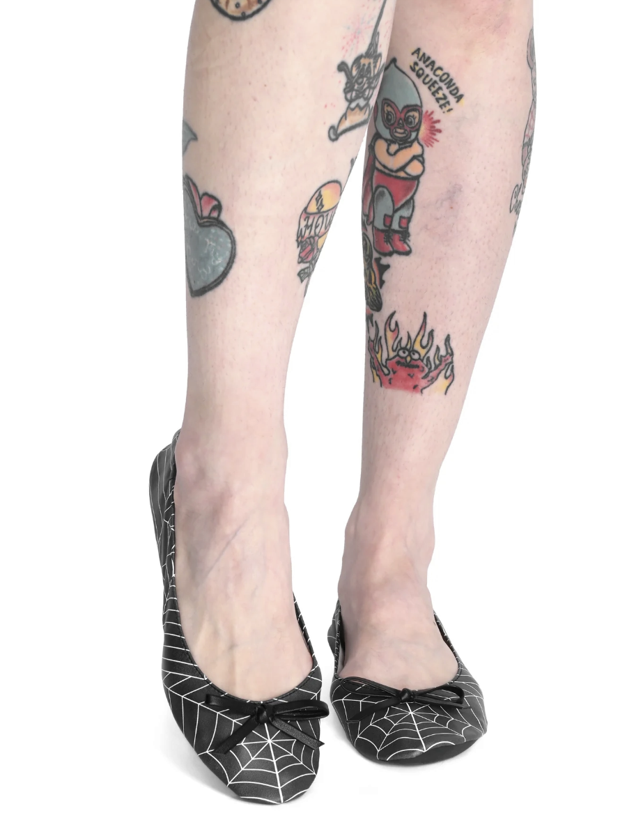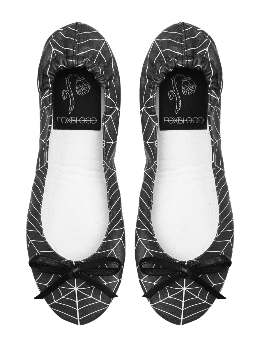 Black folding flats with an all over cobweb design, made to change out of uncomfortable shoes after a long day at a convention or even a night out at the goth club.