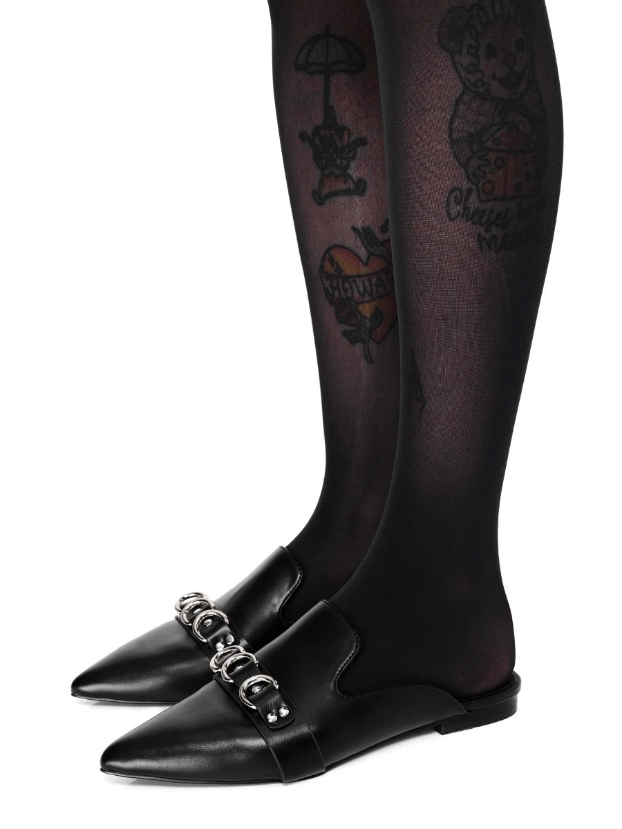 Slide on pointed toe mule with silver D-ring detail on front.