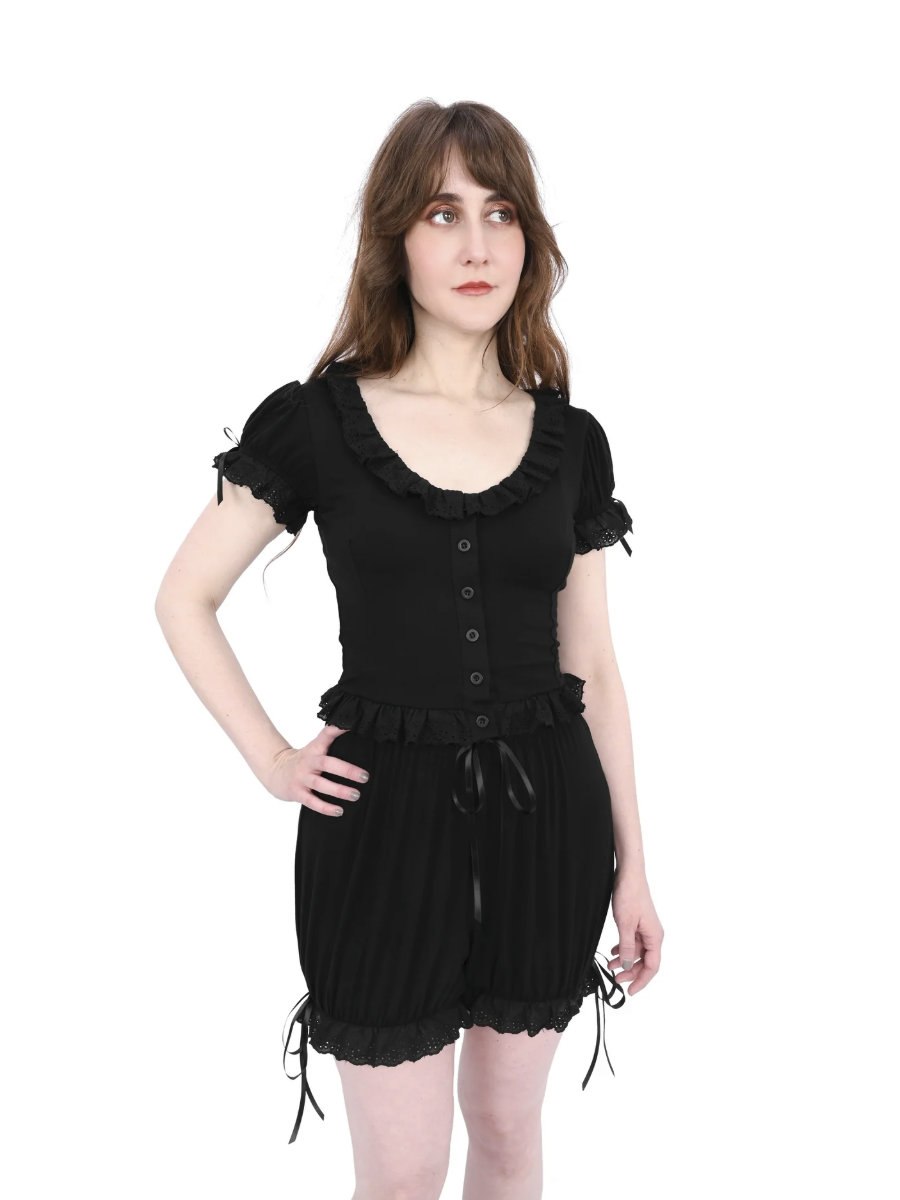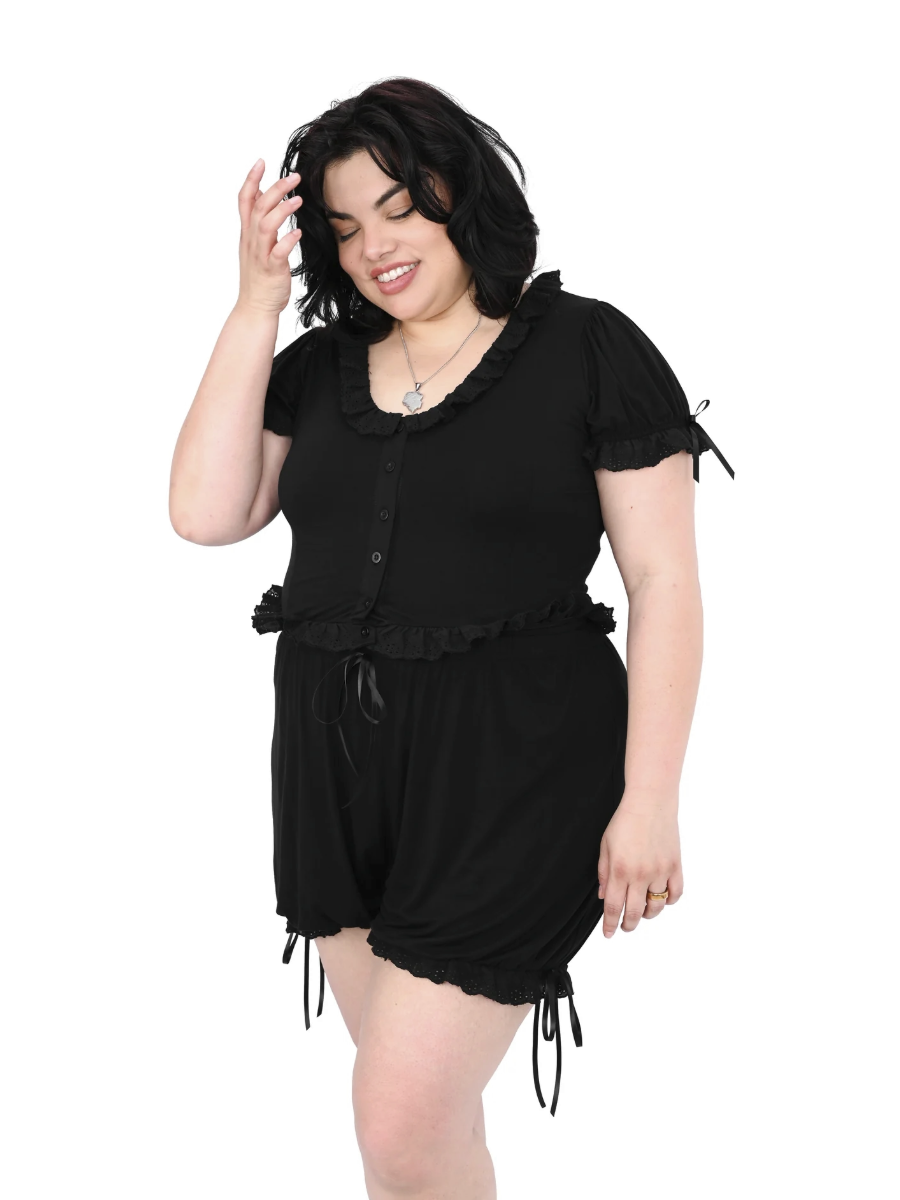 The top features a fully button up front little puff sleeves, and lace and ribbon details. The bottoms have a comfortable elastic waistband as well as lace and ribbon details.