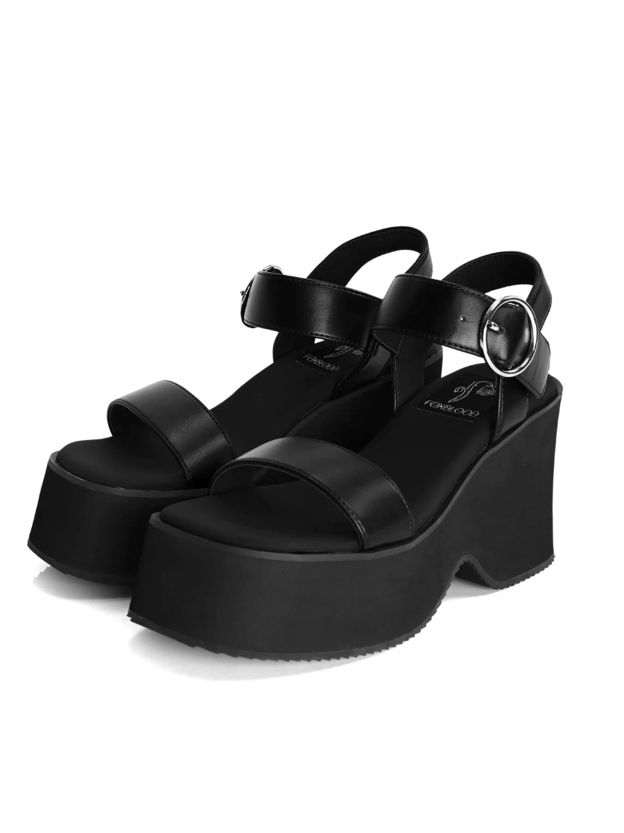 Black faux leather sandal with light weight foam platforms and adjustable side buckle.
