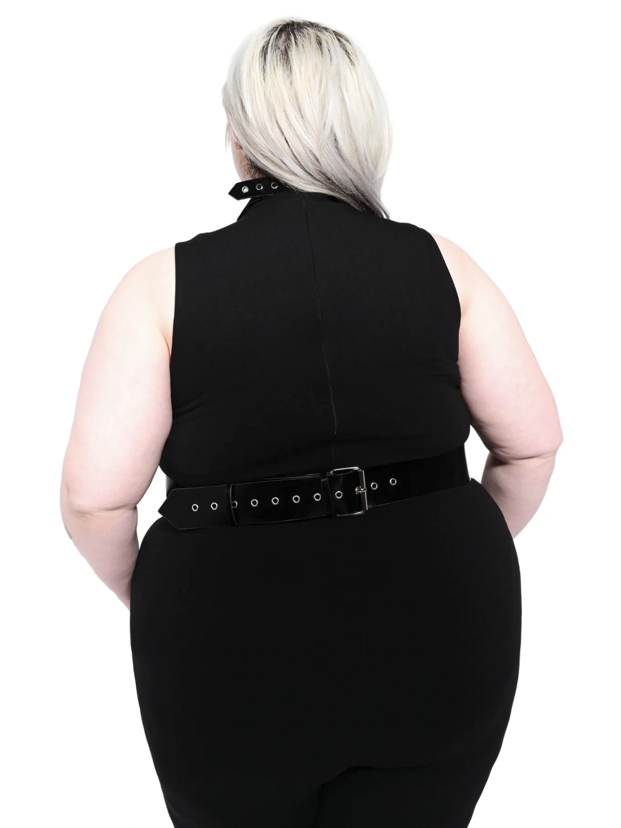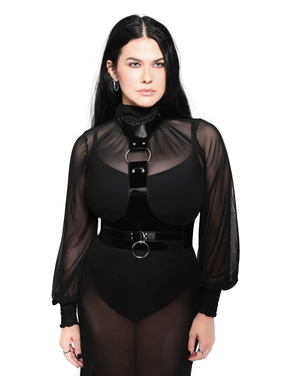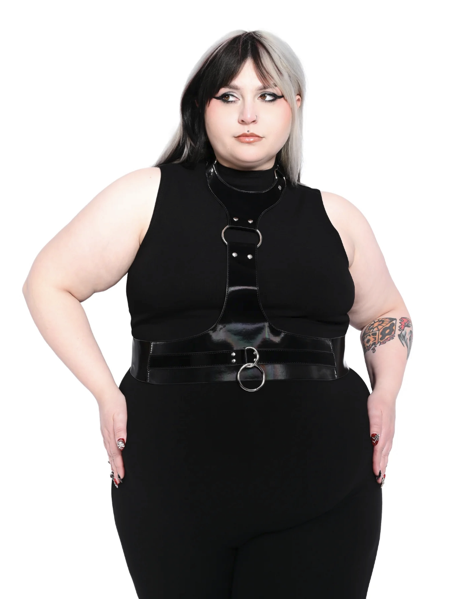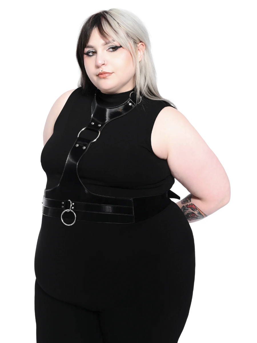 A sleek black shine harness made of a liquid velvet faux leather with silver metal hardware.