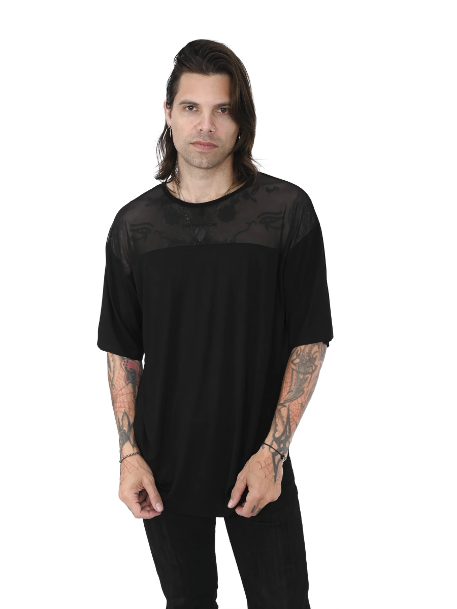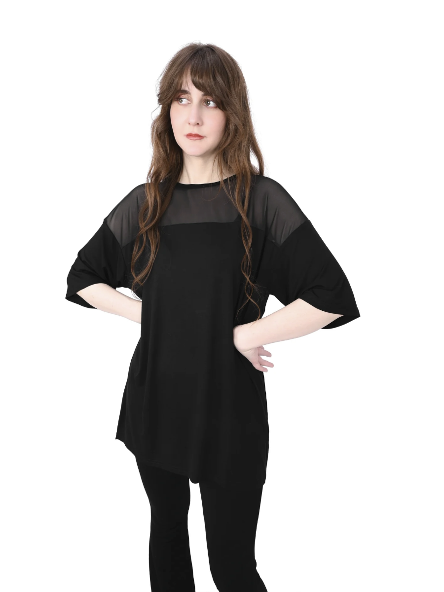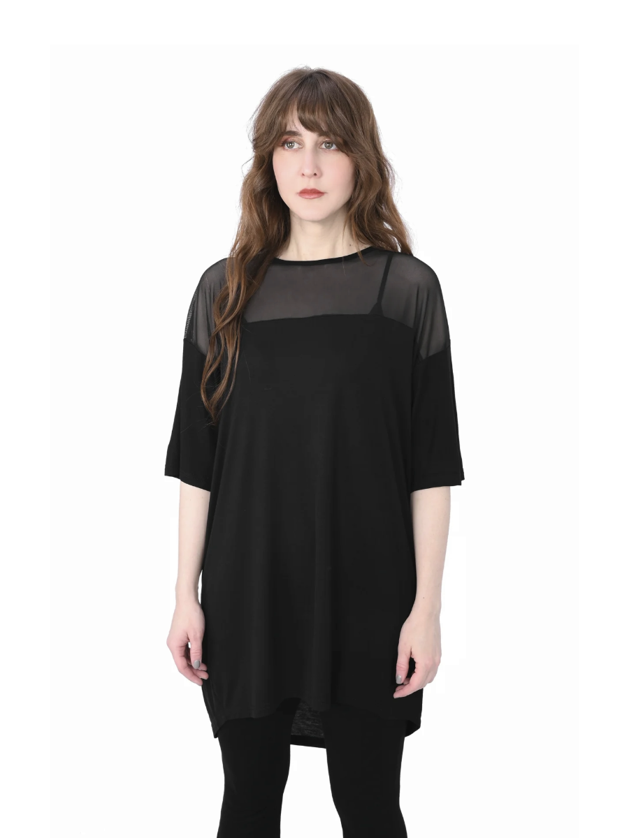 Oversized, unisex t-shirt tunic with a mesh panel on top.