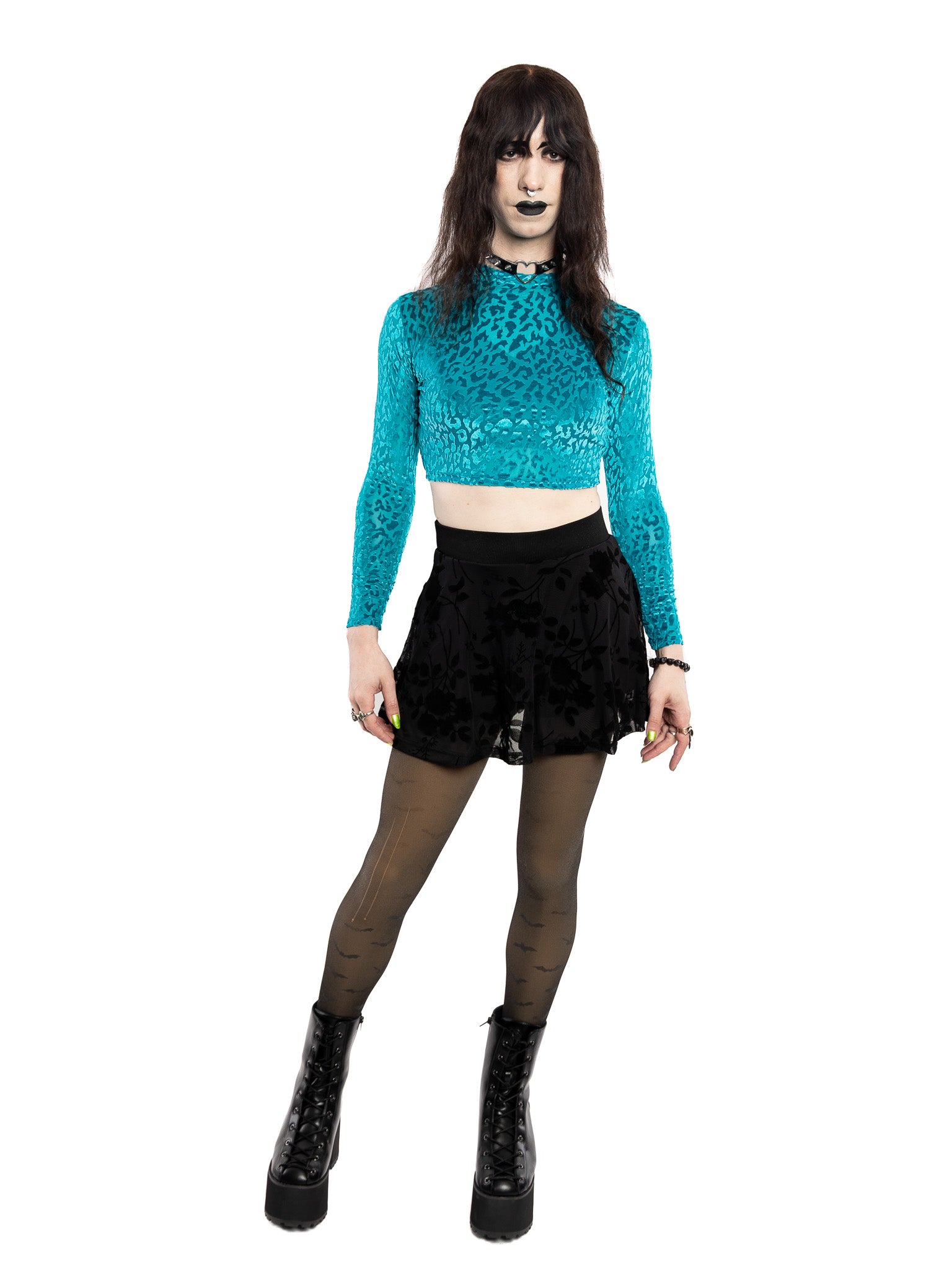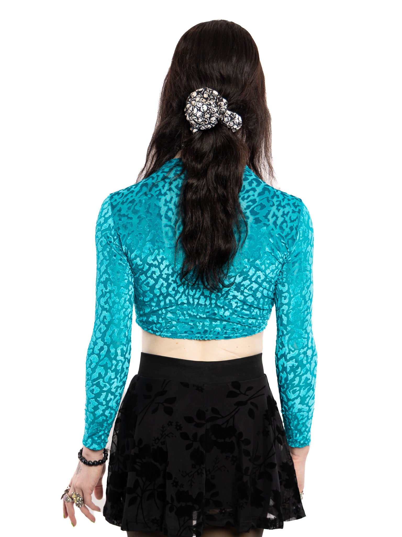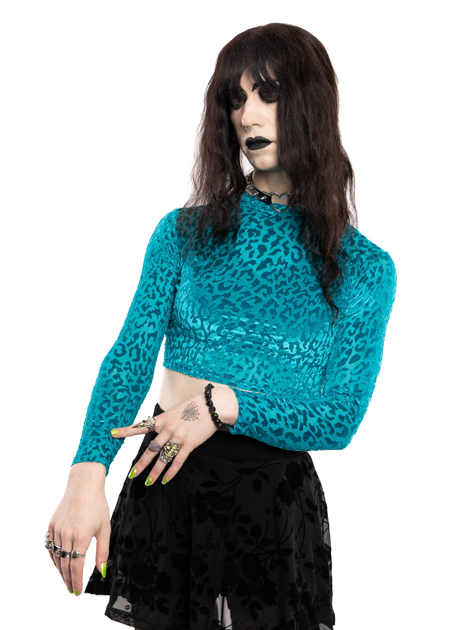 This is so Xtina circa 2000! Now you just need the lowest-waisted pants you own and some series chunky highlights. Or, layer under a band tee with mom jeans for a more modern look! Mock neck crop top with long sleeves in a velvety leopard print burnout mesh.