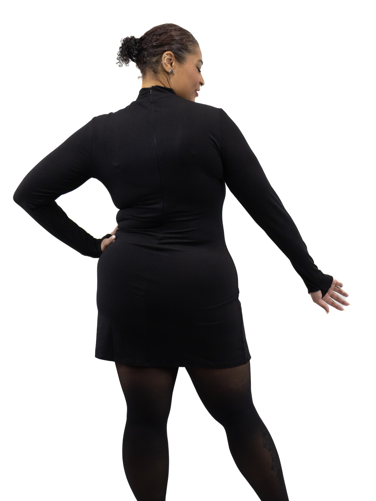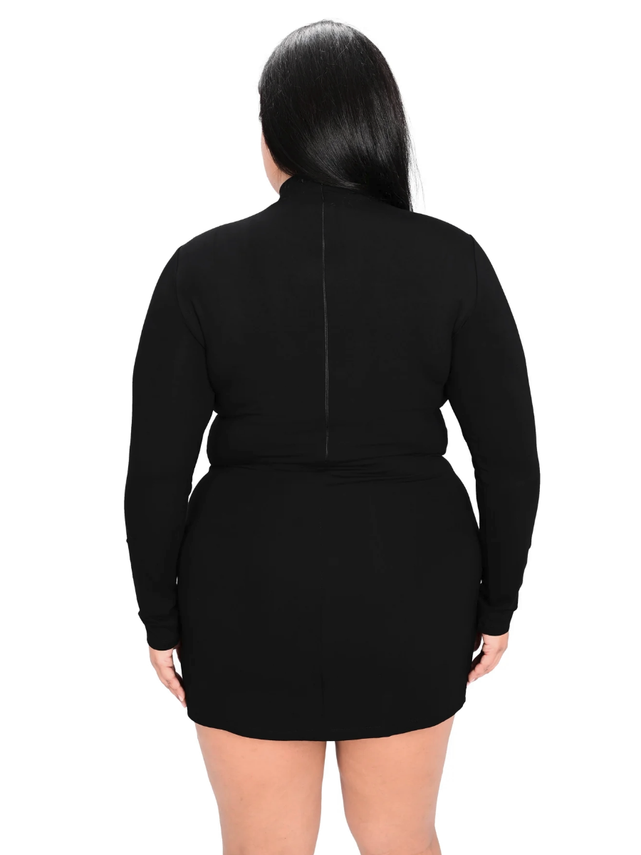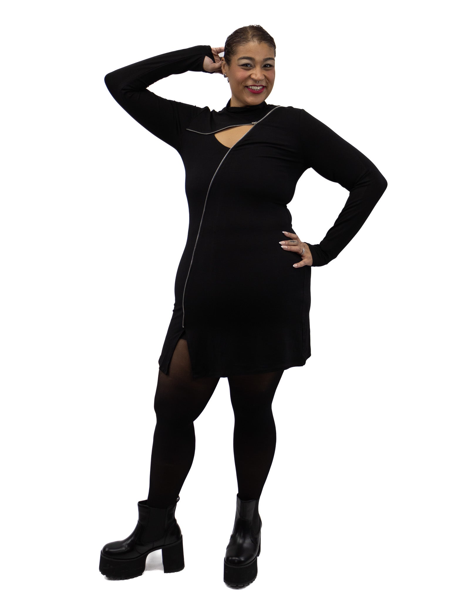 Long sleeve mini bodycon dress with keyhole and front zipper detail that extends from the shoulder to the opposite side of the skirt slit.