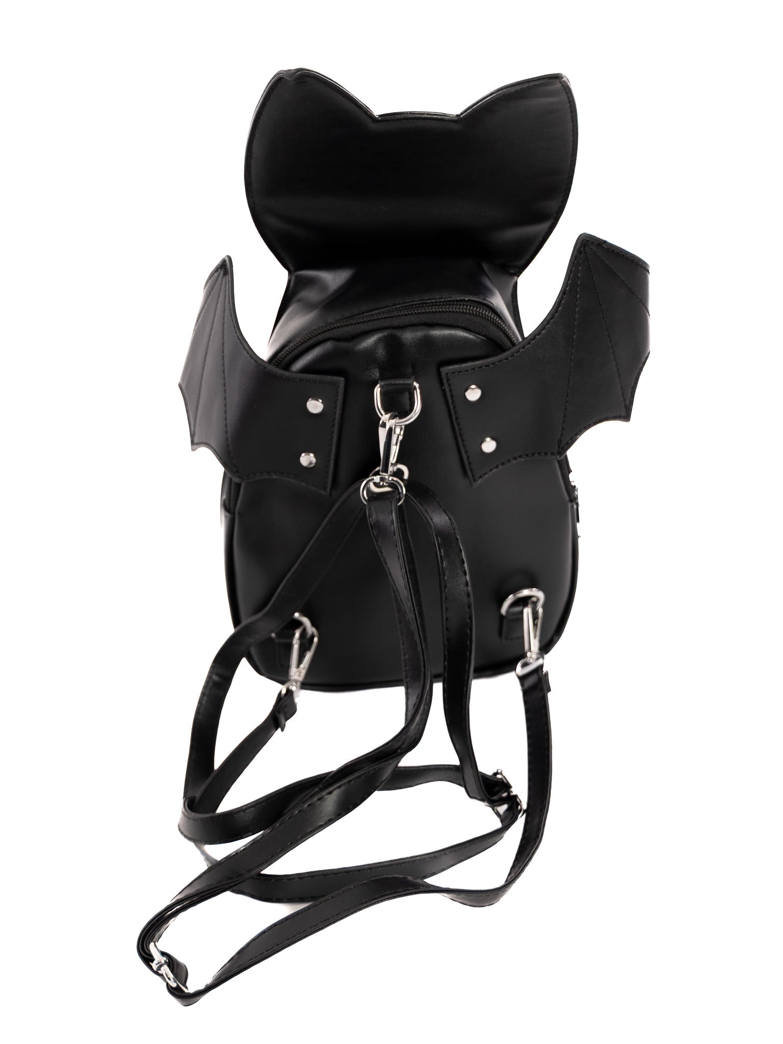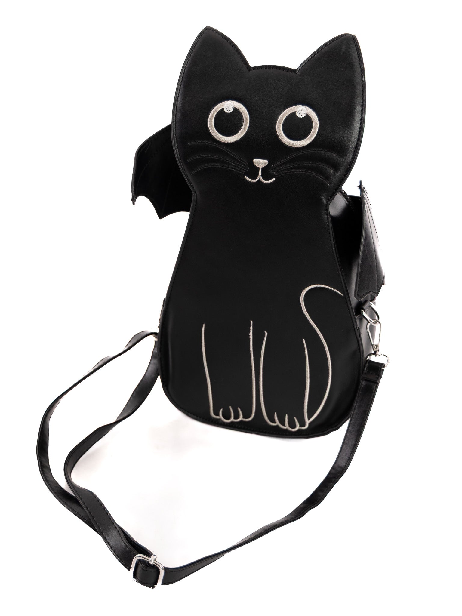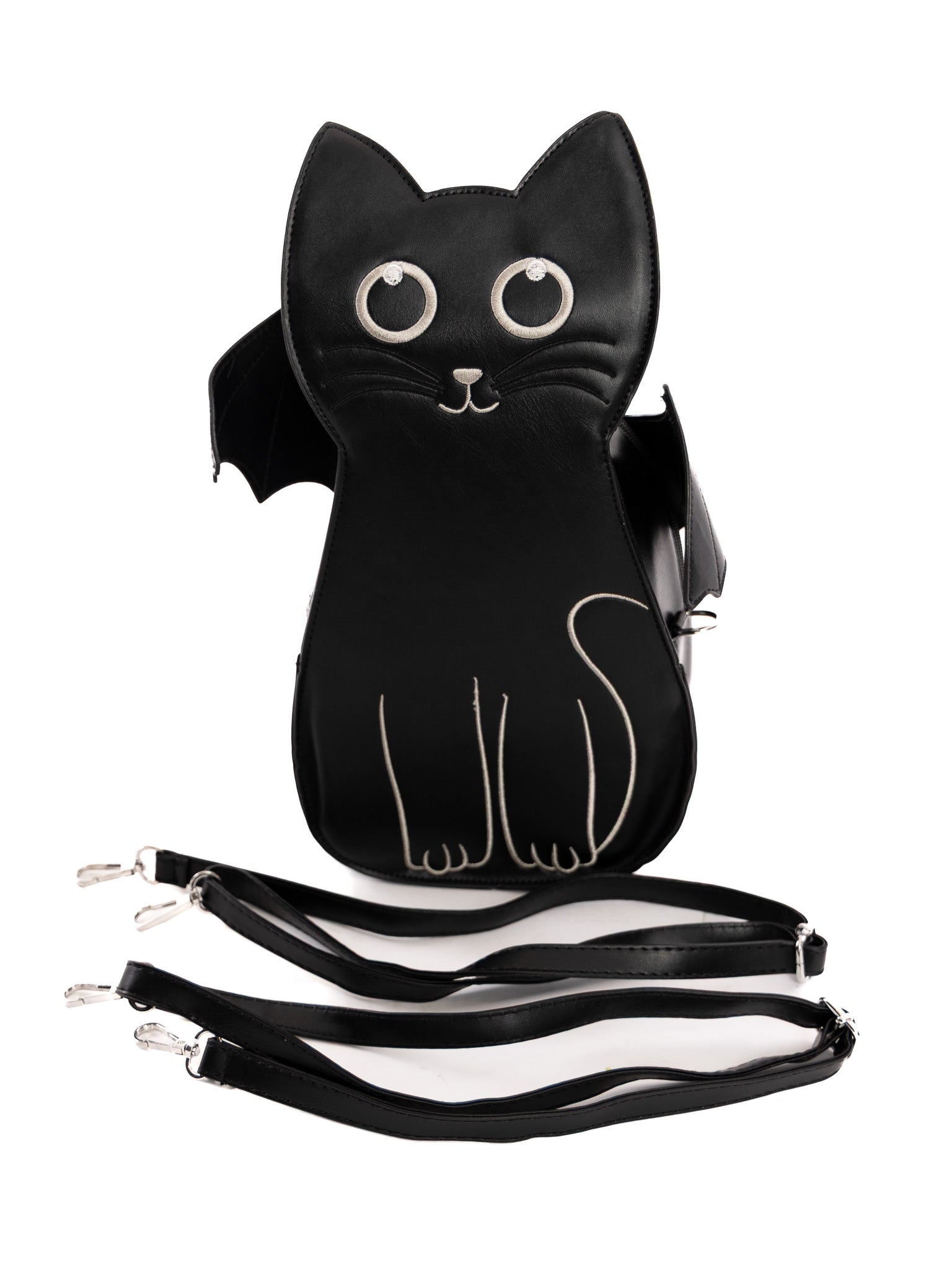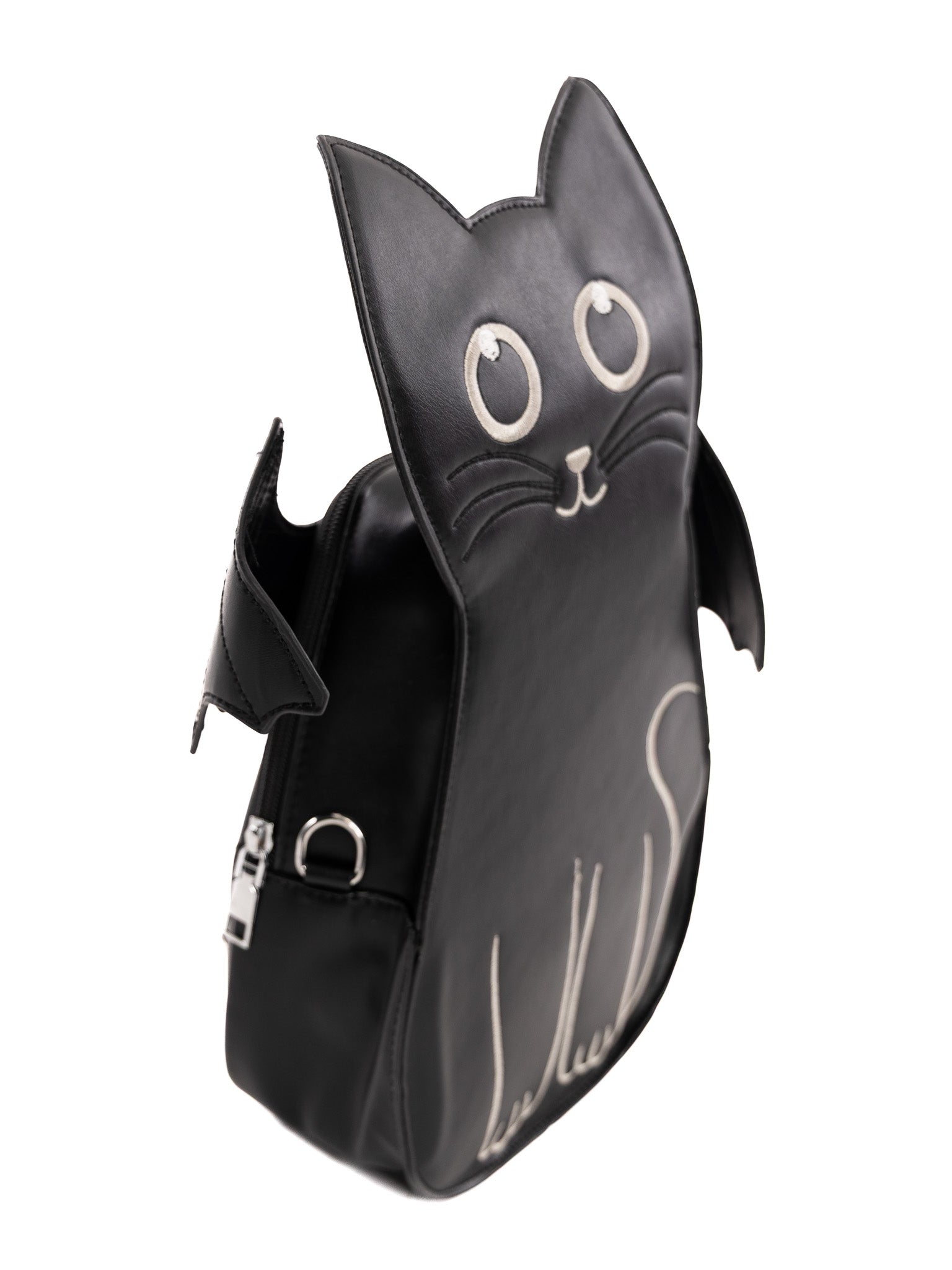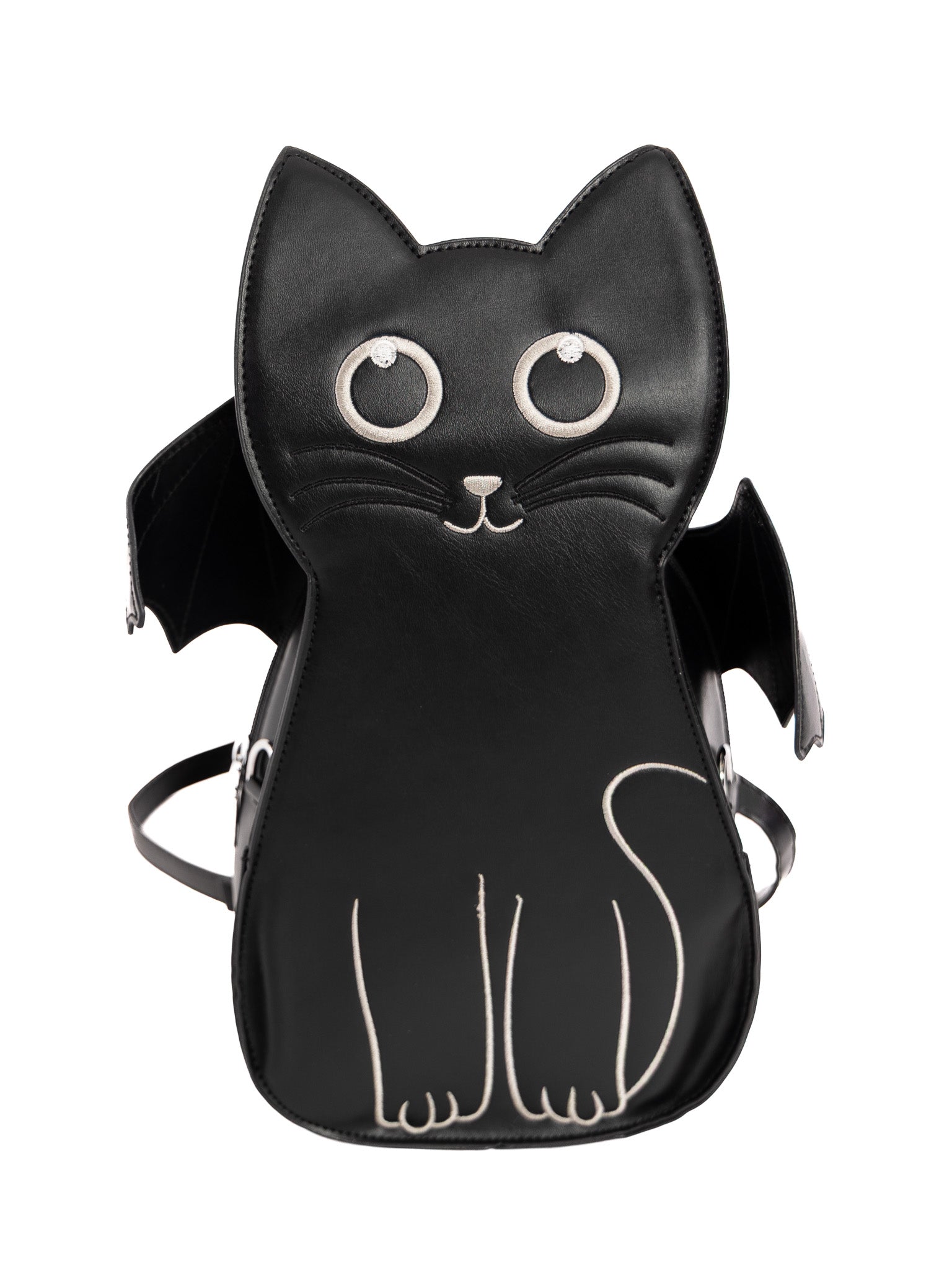 Look into his devious eyes and... feel a maternal instinct? This winged kitty has the cutest face, embroidered onto the PU leather body. Zipper on the back lets you fill him with all your necessities! Has one inner open pocket.