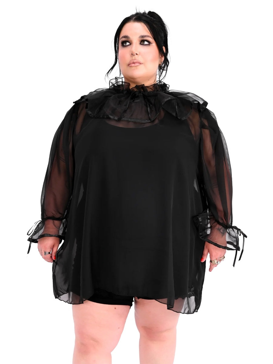 Chiffon babydoll tunic with a dramatic collar and cuffs.