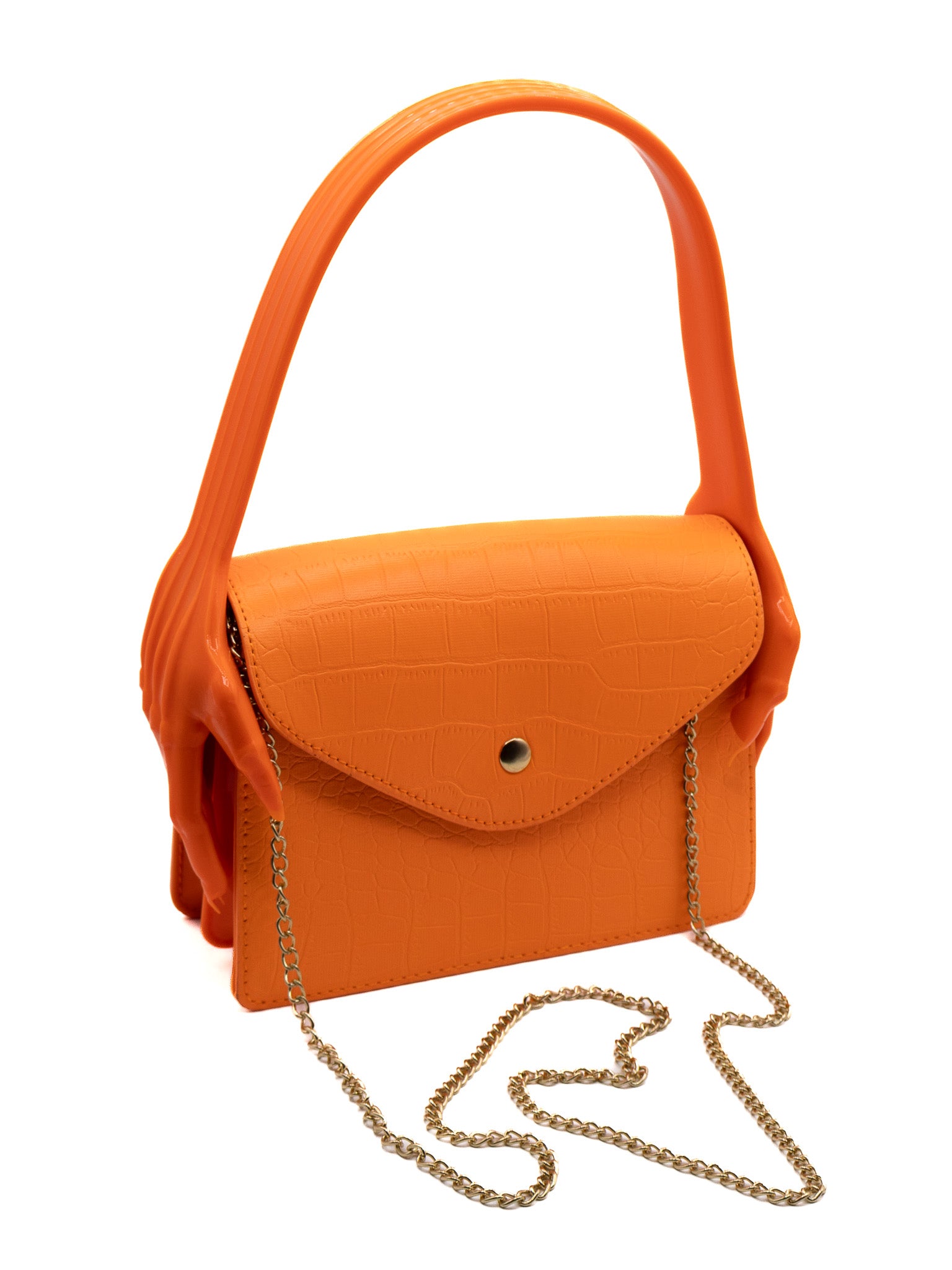 This bag takes Spooky Year Round to a whole new level! The faux crocodile outer is no match for the molded handle- pun intended! In the shape of two ghoulish hands clutching the sides of the bag, it's perfect for adding creepy flair!