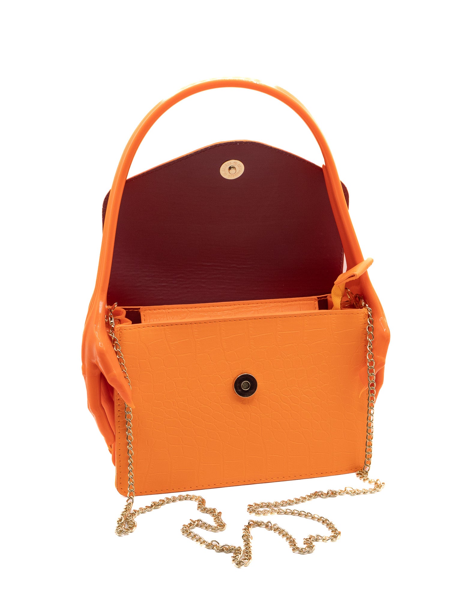 Includes removable shoulder chain, features gold colored hardware and burgundy lining.