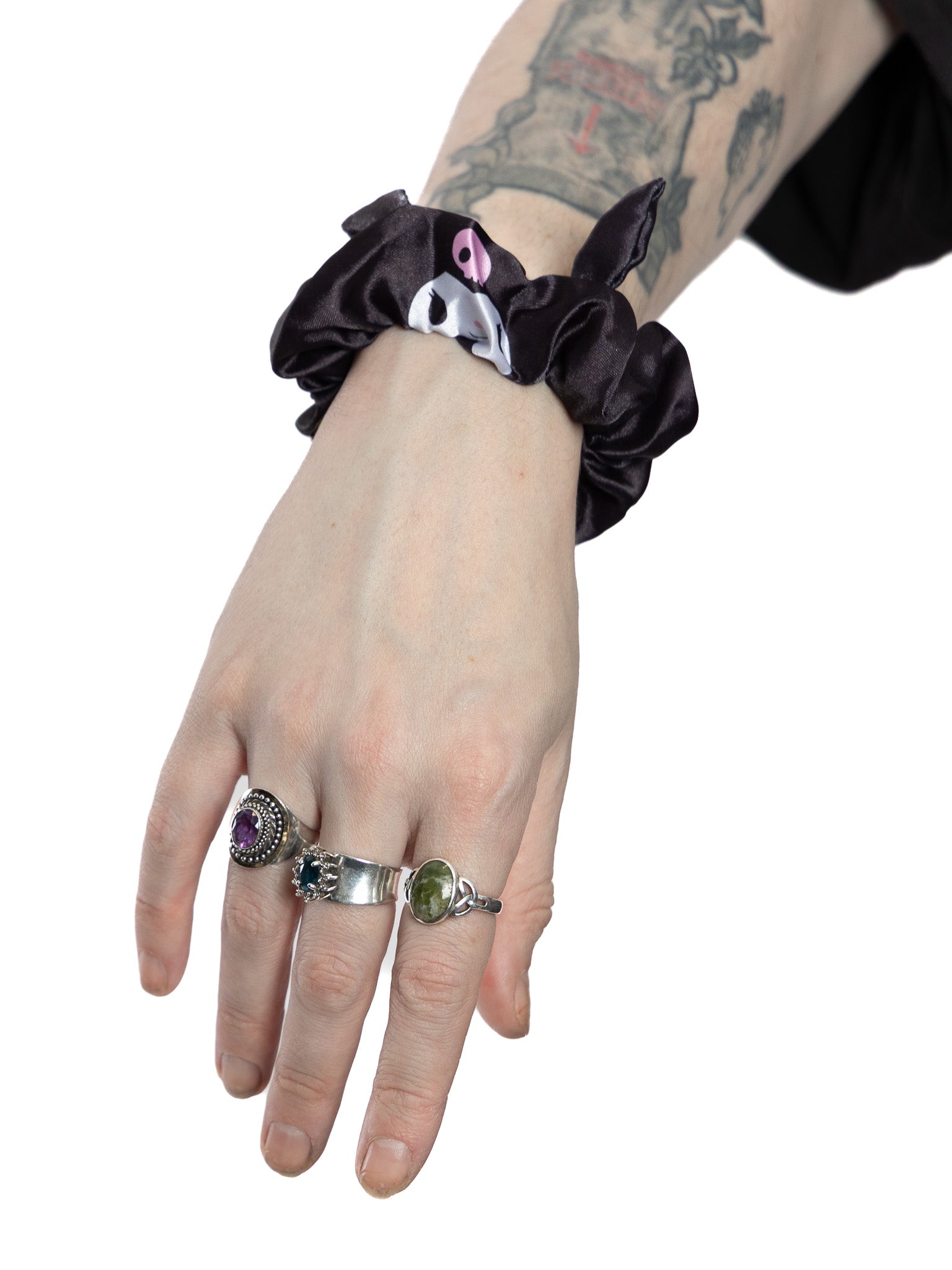 Black satiny scrunchie with printed face details and attached ears.