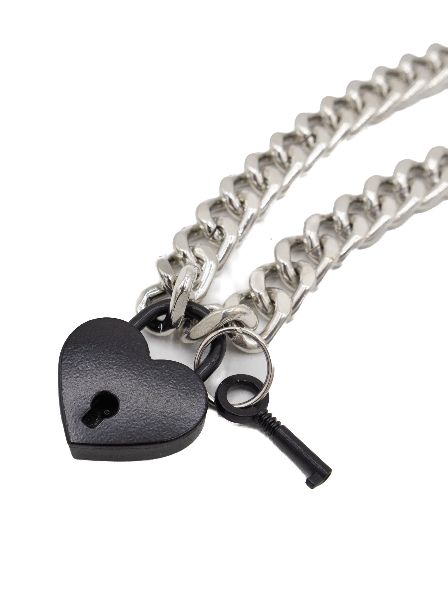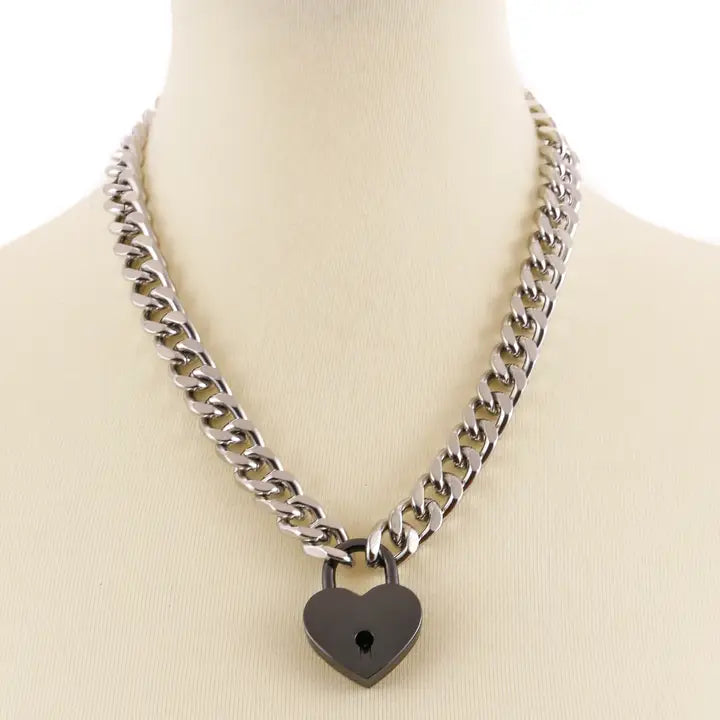 Keep your secrets close with this chunky chain necklace featuring a functioning and removable 1" black heart shaped padlock and a matching key.