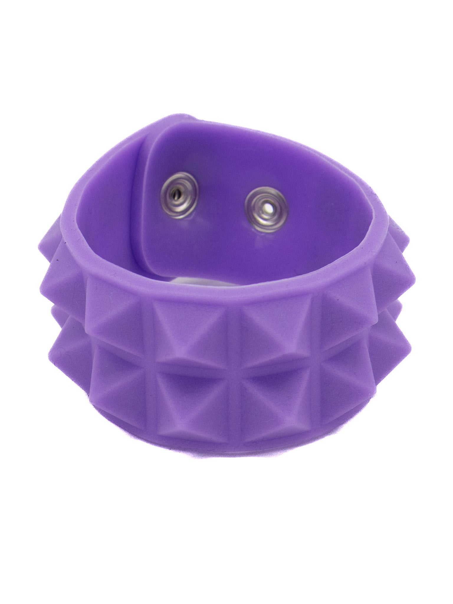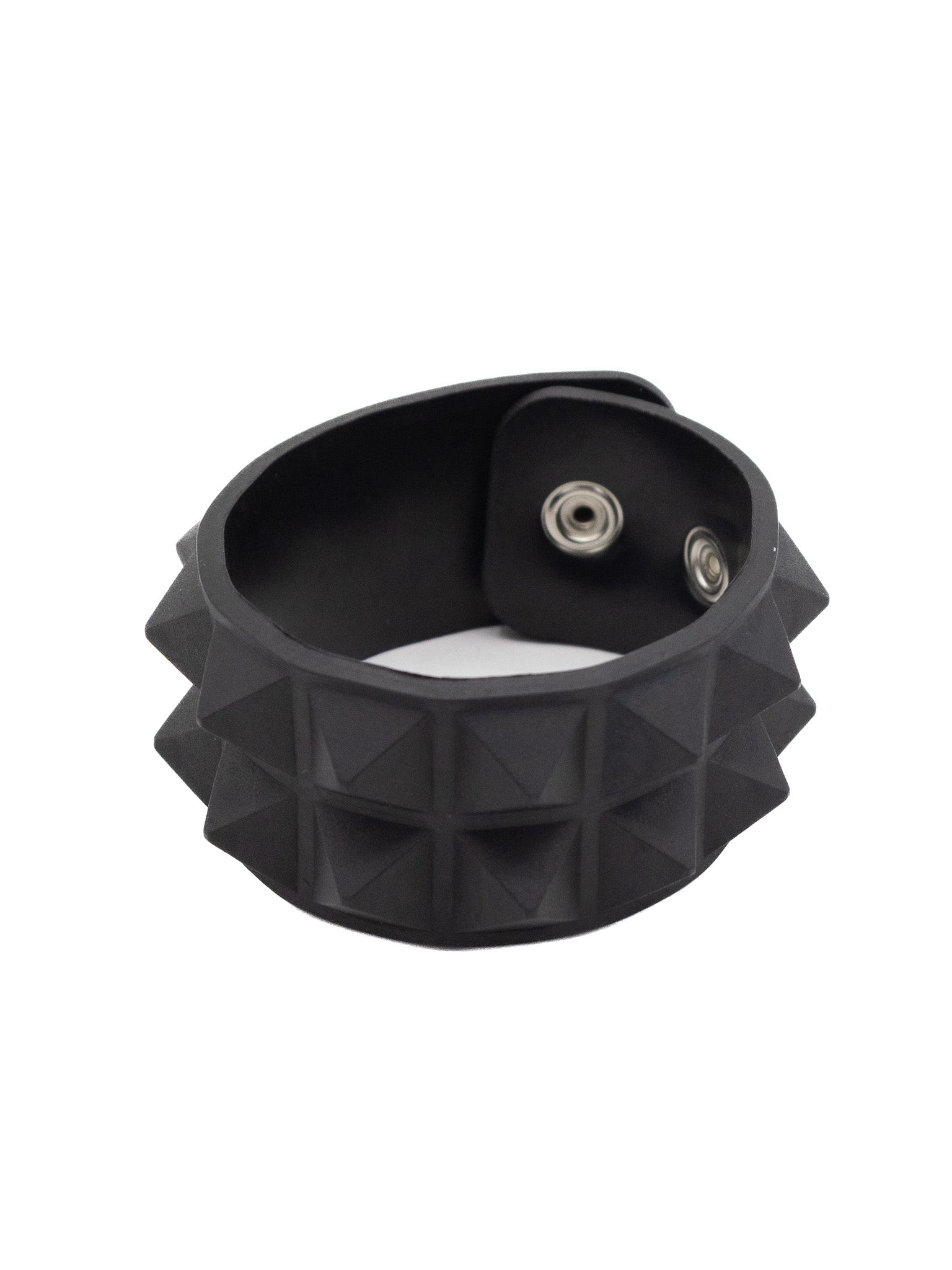 1 1/4" Rubber bracelet featuring a double row of molded pyramid studs. Comes in black, or glow in-the-dark pink, green, and purple.