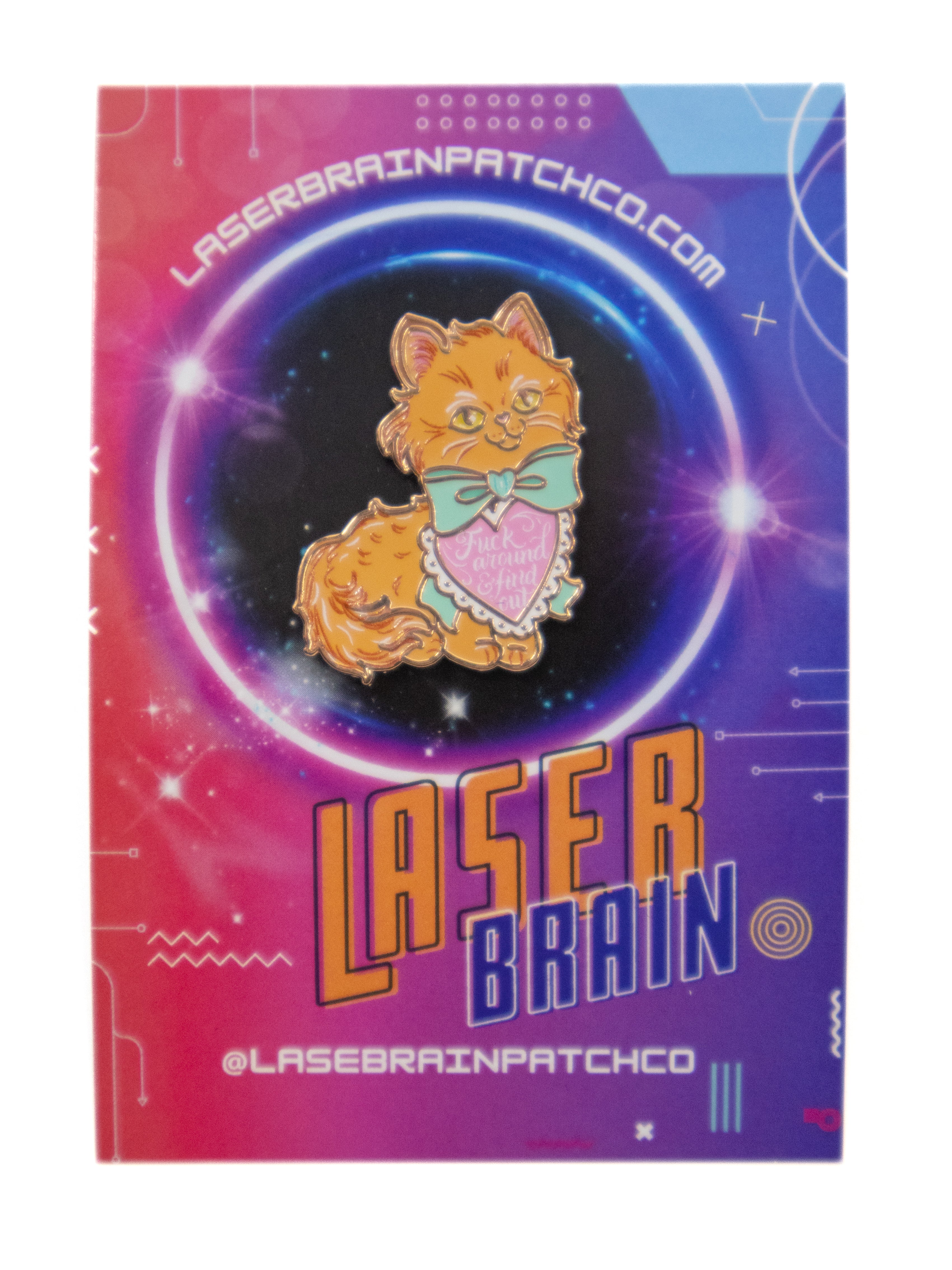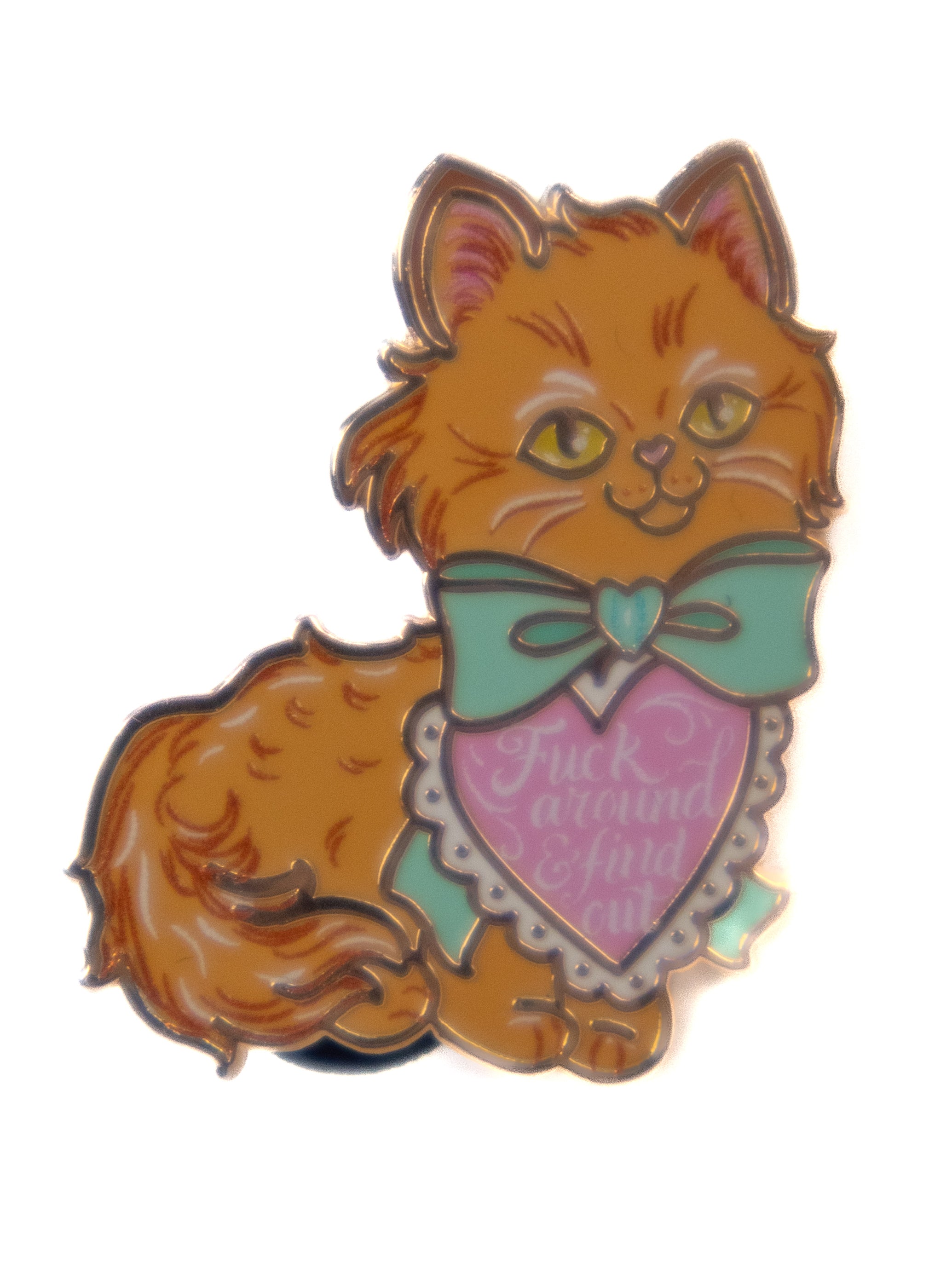 Silver metal pin with colored enamel. Two pin posts with rubber backs. Measures approximately 1" x 1.5". Gray variant has green eyes, a white bow, and a frilly red heart that reads "I'll See You In Hell." Brown variant has teal eyes, a pink bow, and a frilly blue glitter heart that reads "Fuck." White variant has green eyes, a pink bow, and a frilly pink glitter heart that reads "I Really Do Hate Children." Orange variant has yellow eyes, a teal bow, and a frilly pink heart that reads "Fuck Around & Find Out."