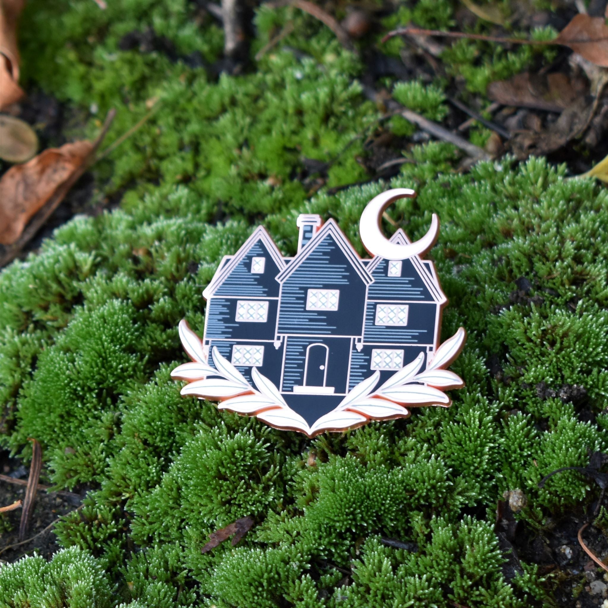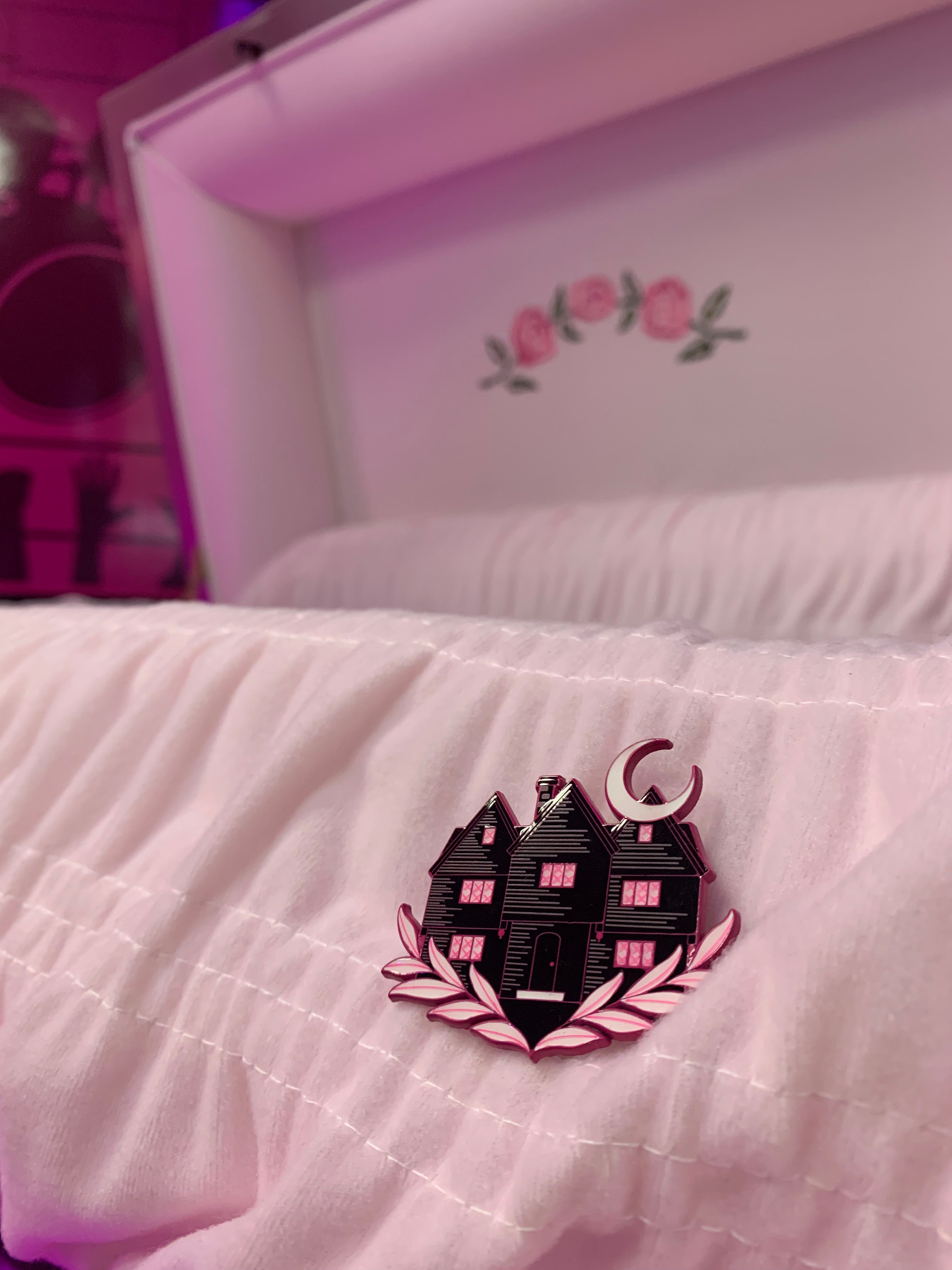 This incredible Witch House lapel pin was made by the amazing Laser Brain Patch Co. aka Lapels & Spells! The Witch House, also known as the Jonathan Corwin House, is located in our hometown of Salem, MA and it near and dear to our heart. Although it was home to one of the judges in the famous Salem Witch Trials, it has become a symbol of the gothic subculture, as well as those of a pagan belief system. The house is now a museum and the only standing structure in Salem with a real connection to the trials. Even though the house has a dark history, we take comfort in knowing that we can learn from the past and even take a little evil joy in the fact that we, as women who might well have been accused ourselves in 1692 can now safely stand on the grounds of, and inside this house and know that simply by doing so, we are going against the ideals of persecution that once held true inside those walls.