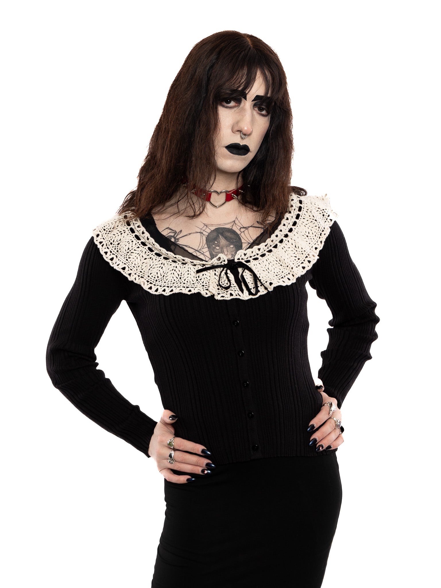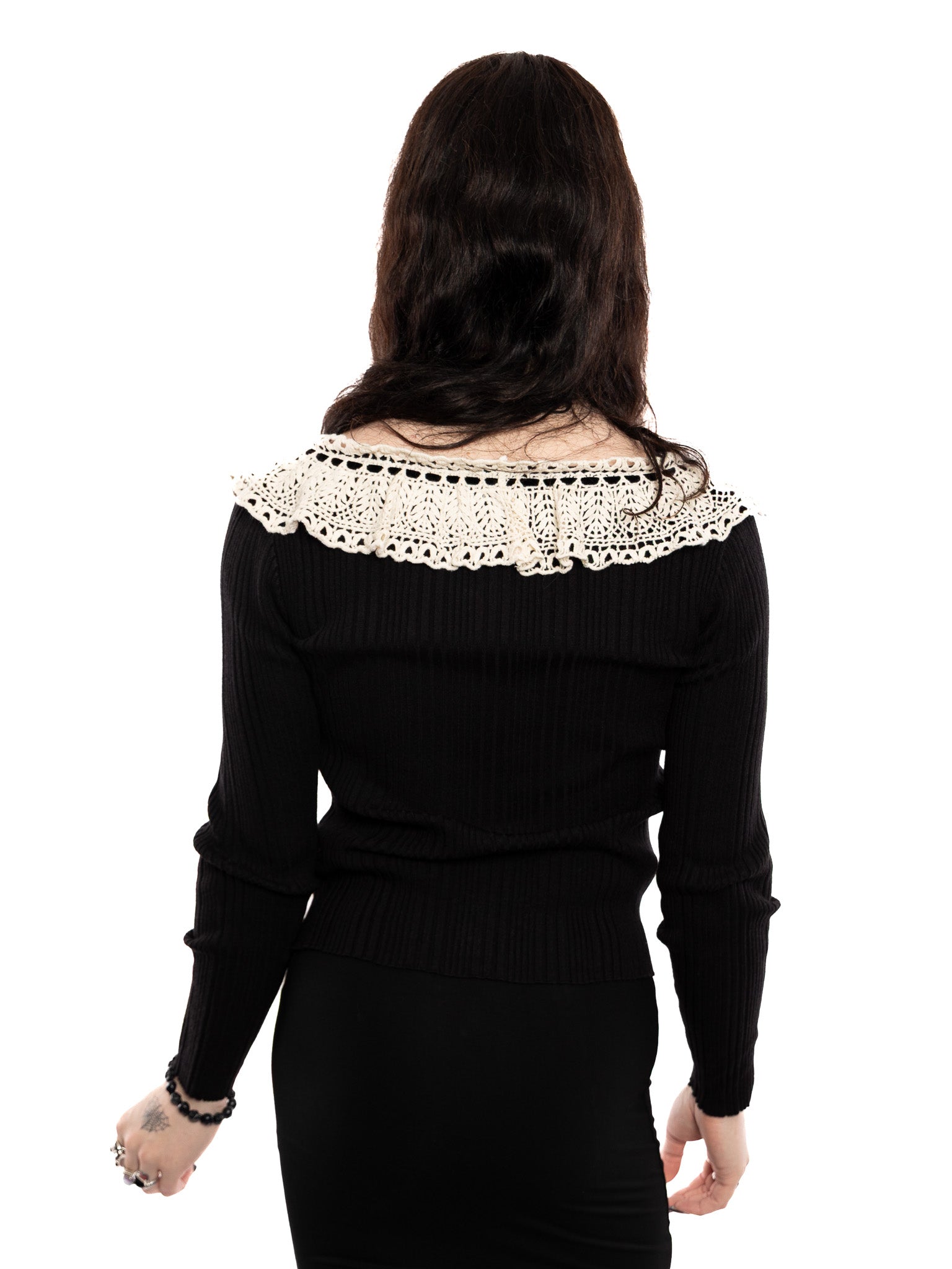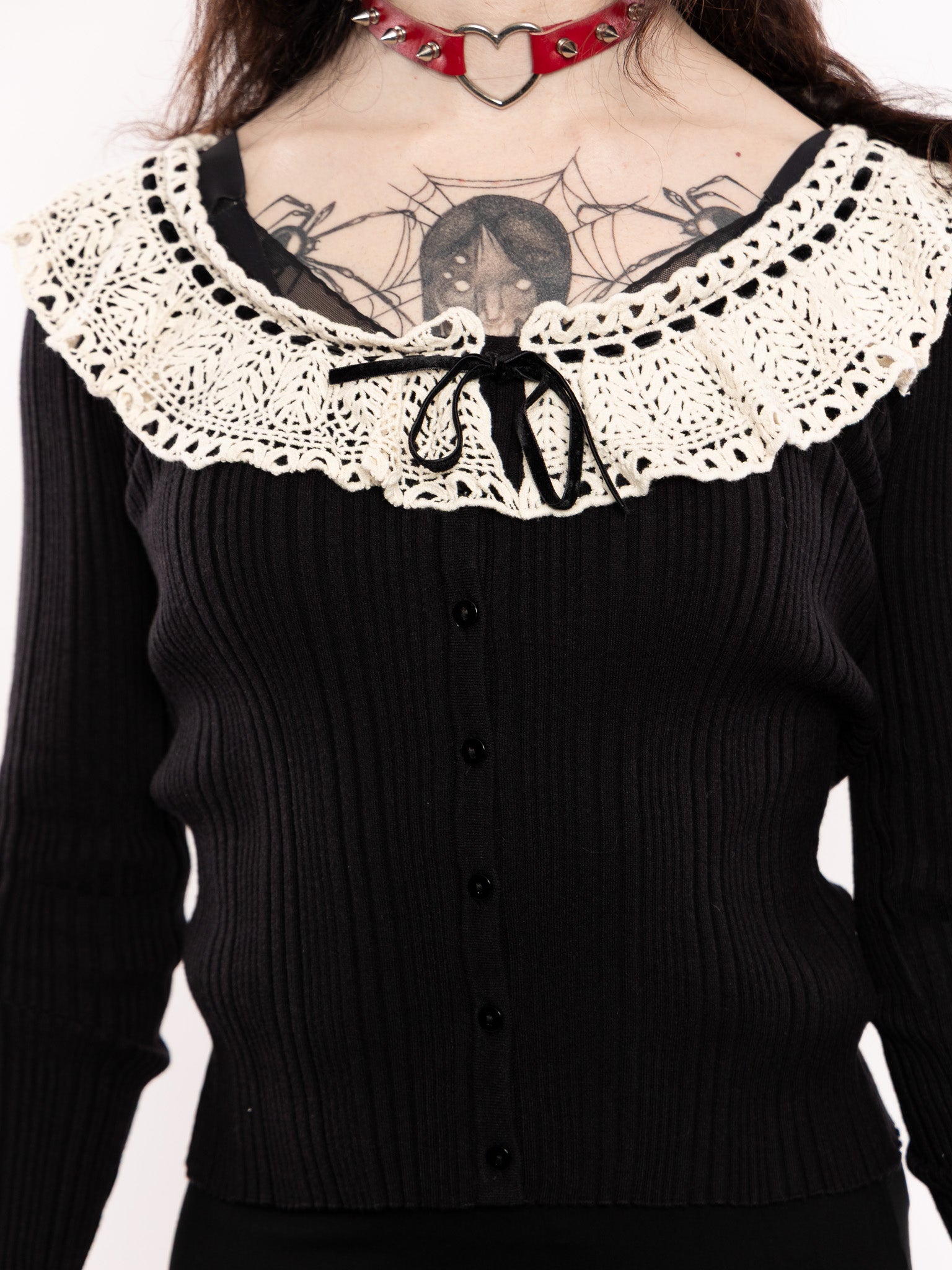 A long sleeve solid knit top with a button down front featuring a lace yoke detail on its wide neckline and a self-tie. Fabric is a lightweight ribbed knit with lots of stretch.