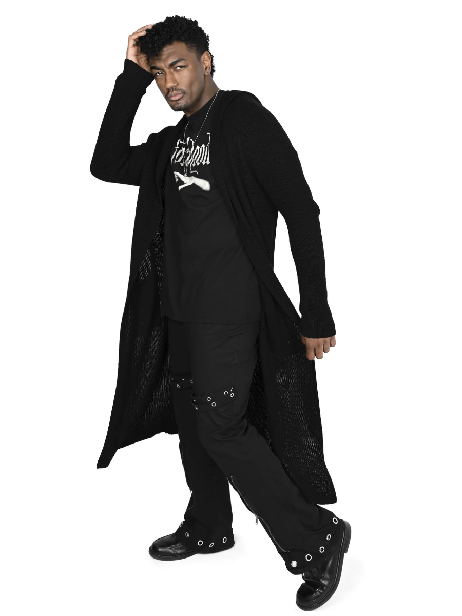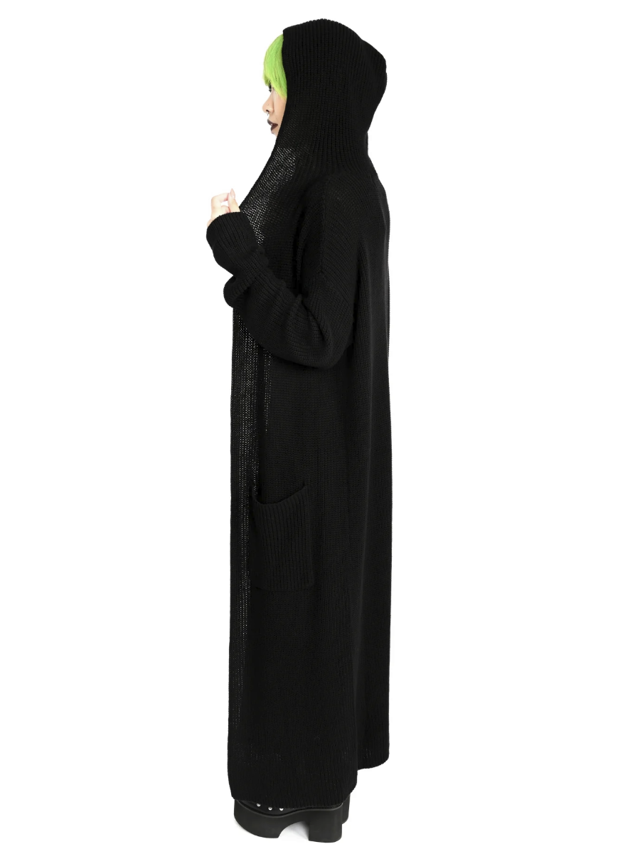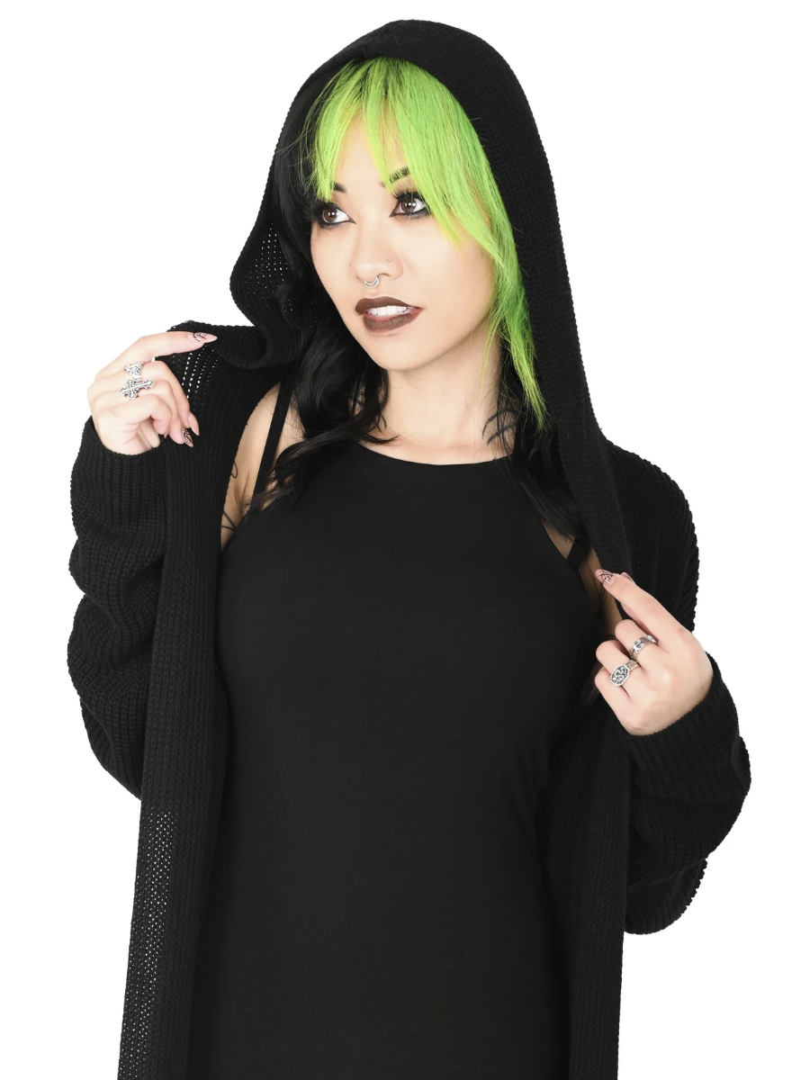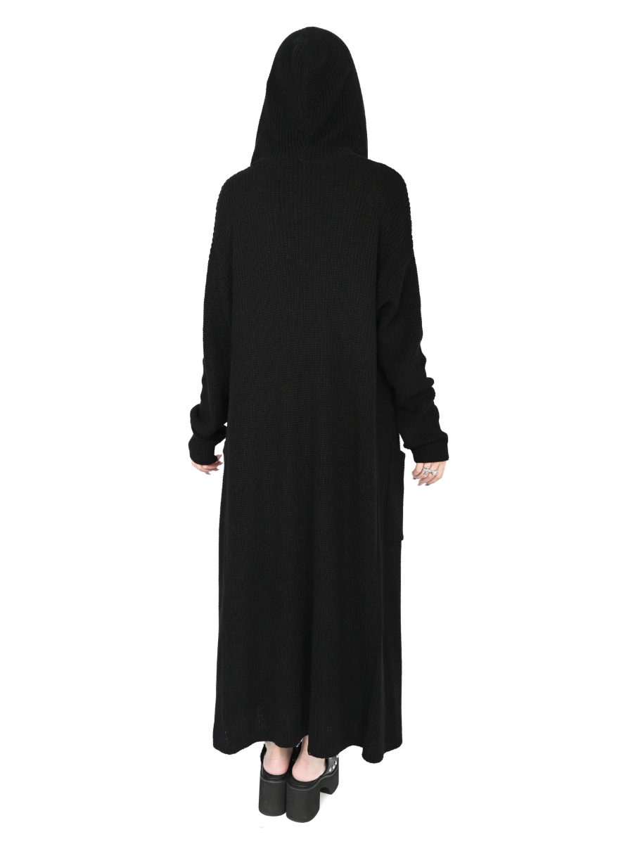 Soft, ribbed-knit cardigan duster with oversized hood and front pockets.