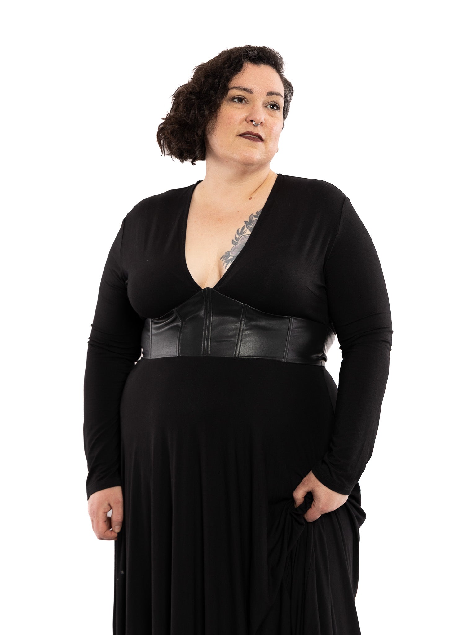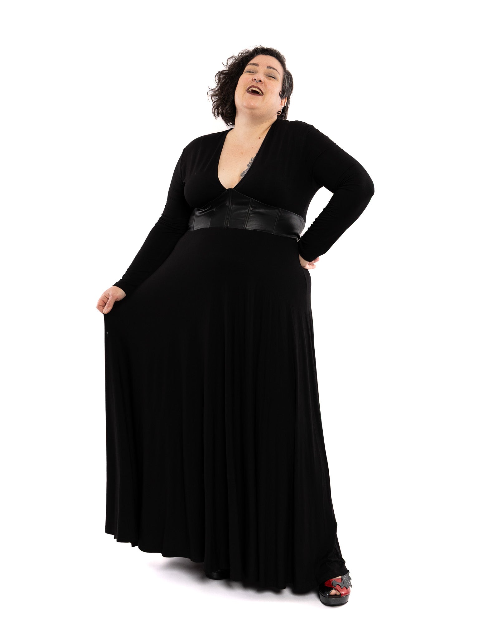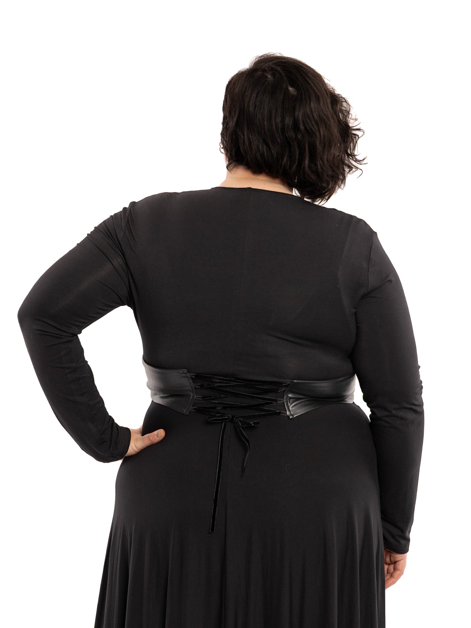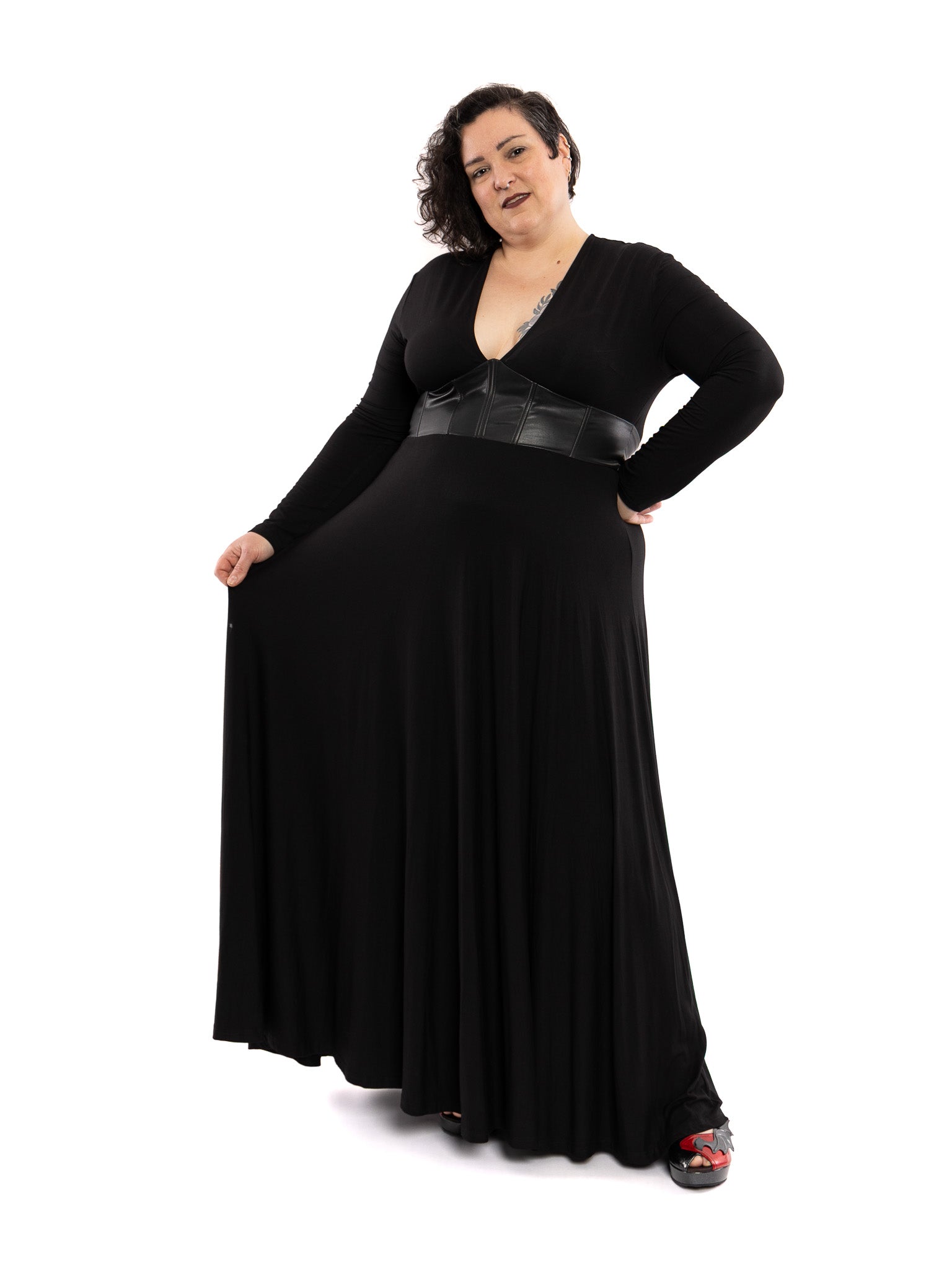 This maxi dress is made of super soft and stretchy jersey with a vegan leather boned corset style waist. It features a lace up back waist to cinch in your curves and bring out the Mistress of the Dark in all!