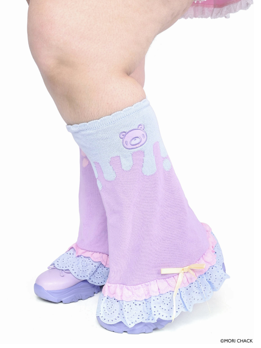 These split color legwarmers feature Gloomy Bear appliques on the side and drip details knit all around the top! Two layers of ruffled lace at the bottom and a dainty ribbon make these a perfect pair with the matching Pastel Drip Skirt! An elastic cord at the top offers extra adjustability and will keep the legwarmers from slipping down.