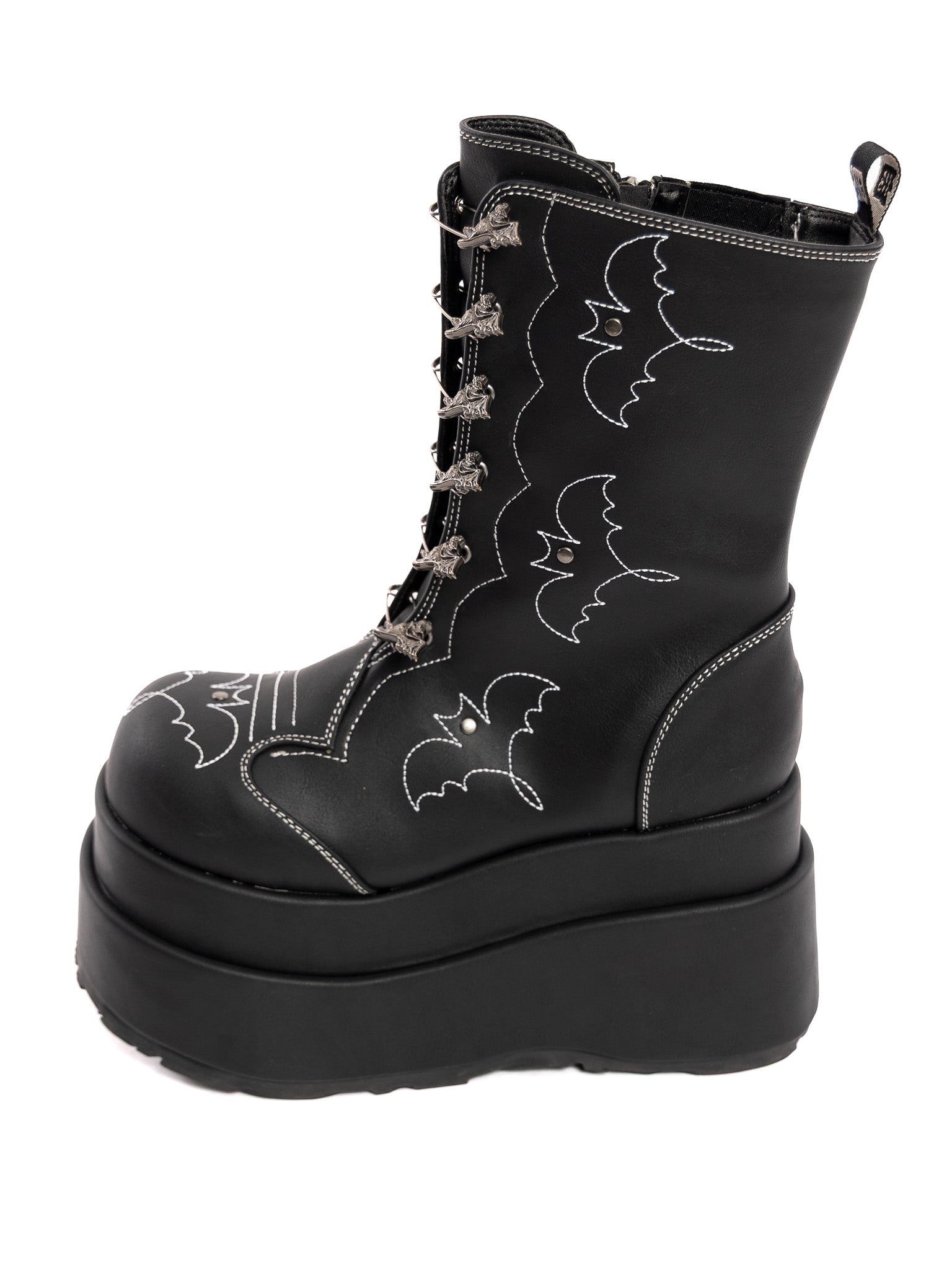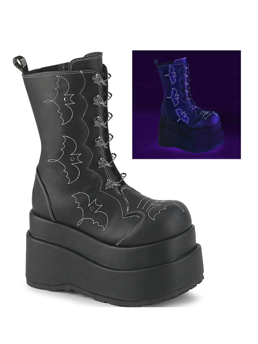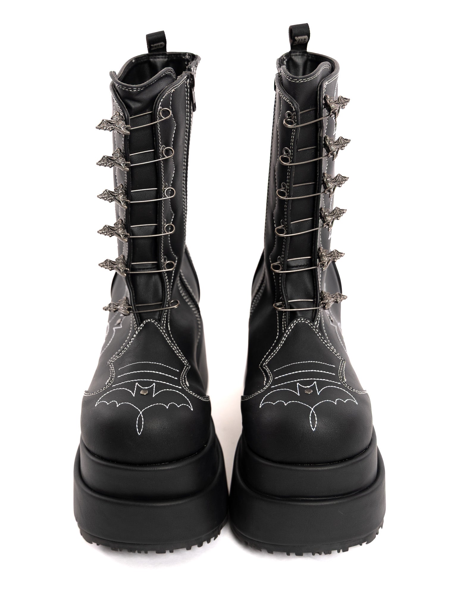 Step into the spotlight with the Batford mid-calf boot—built for bold statements. The 4 1/2" tiered platform gives you height without sacrificing attitude, while the functional bat safety pin at the center adds a rebellious touch. Contrast stitching in a Western-Gothic bat motif wraps around the boot for subtle detailing, and the inner side gusset with a metal zip makes slipping in and out effortless. Plus, the bat stitches glows in the dark! Crafted in sleek black vegan leather, these boots blend vintage punk vibes with modern wearability. Perfect for stomping through the city or stealing the show at night.