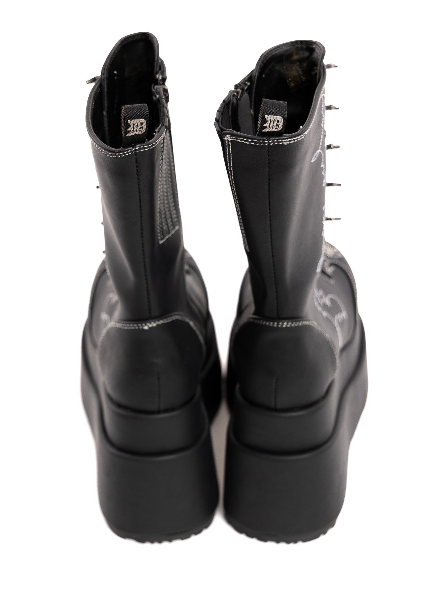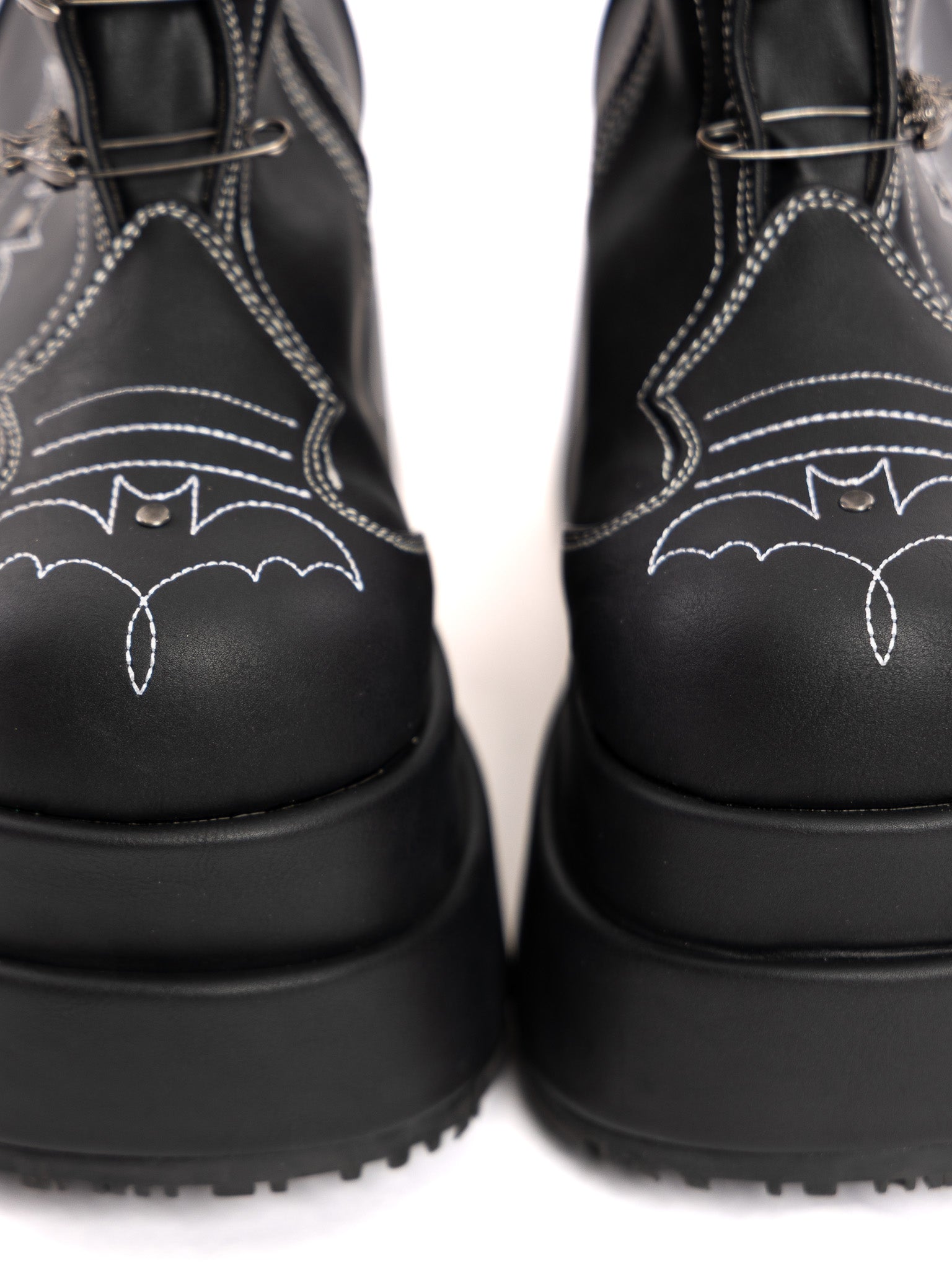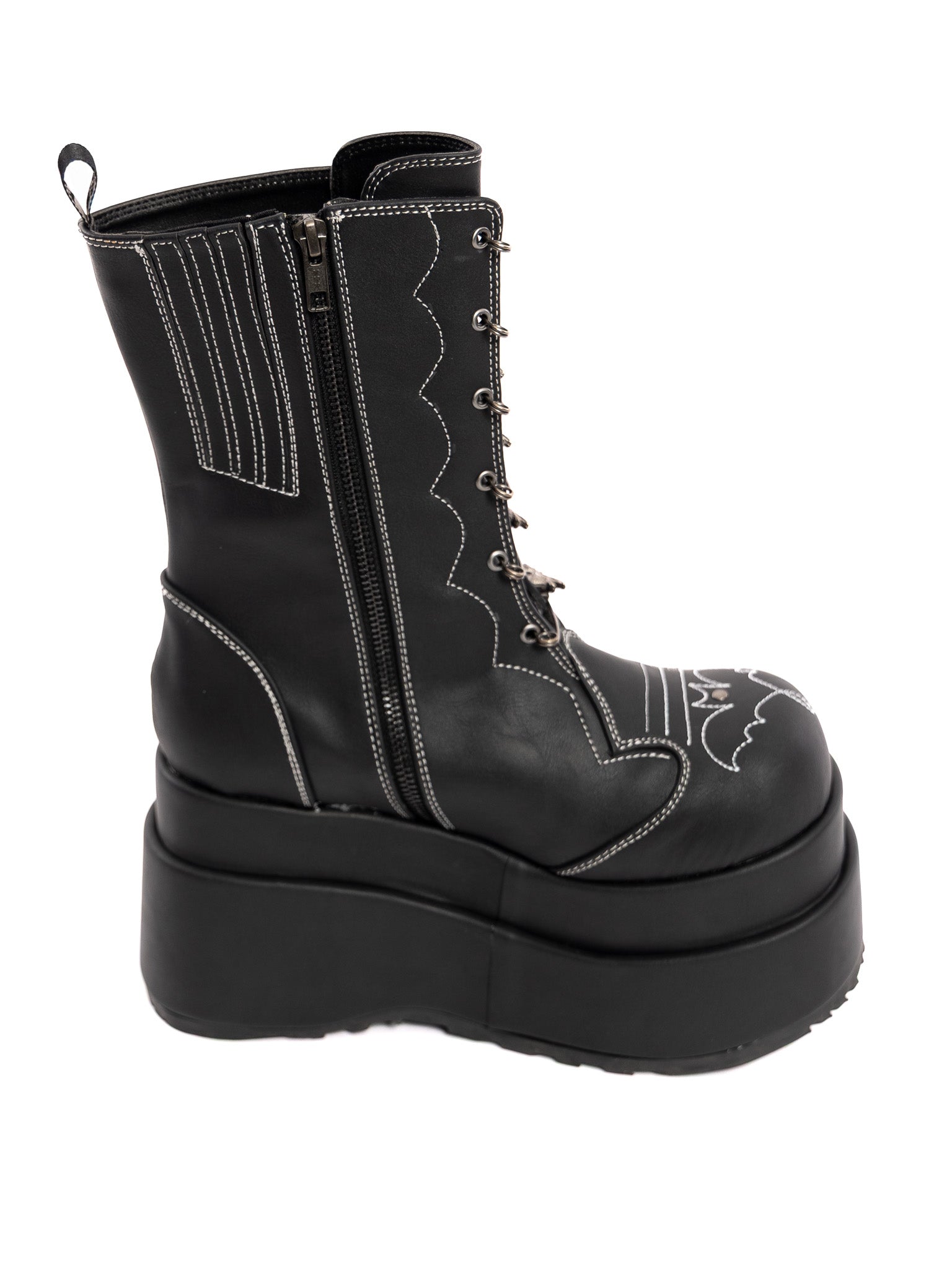 Step into the spotlight with the Batford mid-calf boot—built for bold statements. The 4 1/2" tiered platform gives you height without sacrificing attitude, while the functional bat safety pin at the center adds a rebellious touch. Contrast stitching in a Western-Gothic bat motif wraps around the boot for subtle detailing, and the inner side gusset with a metal zip makes slipping in and out effortless. Plus, the bat stitches glows in the dark! Crafted in sleek black vegan leather, these boots blend vintage punk vibes with modern wearability. Perfect for stomping through the city or stealing the show at night.