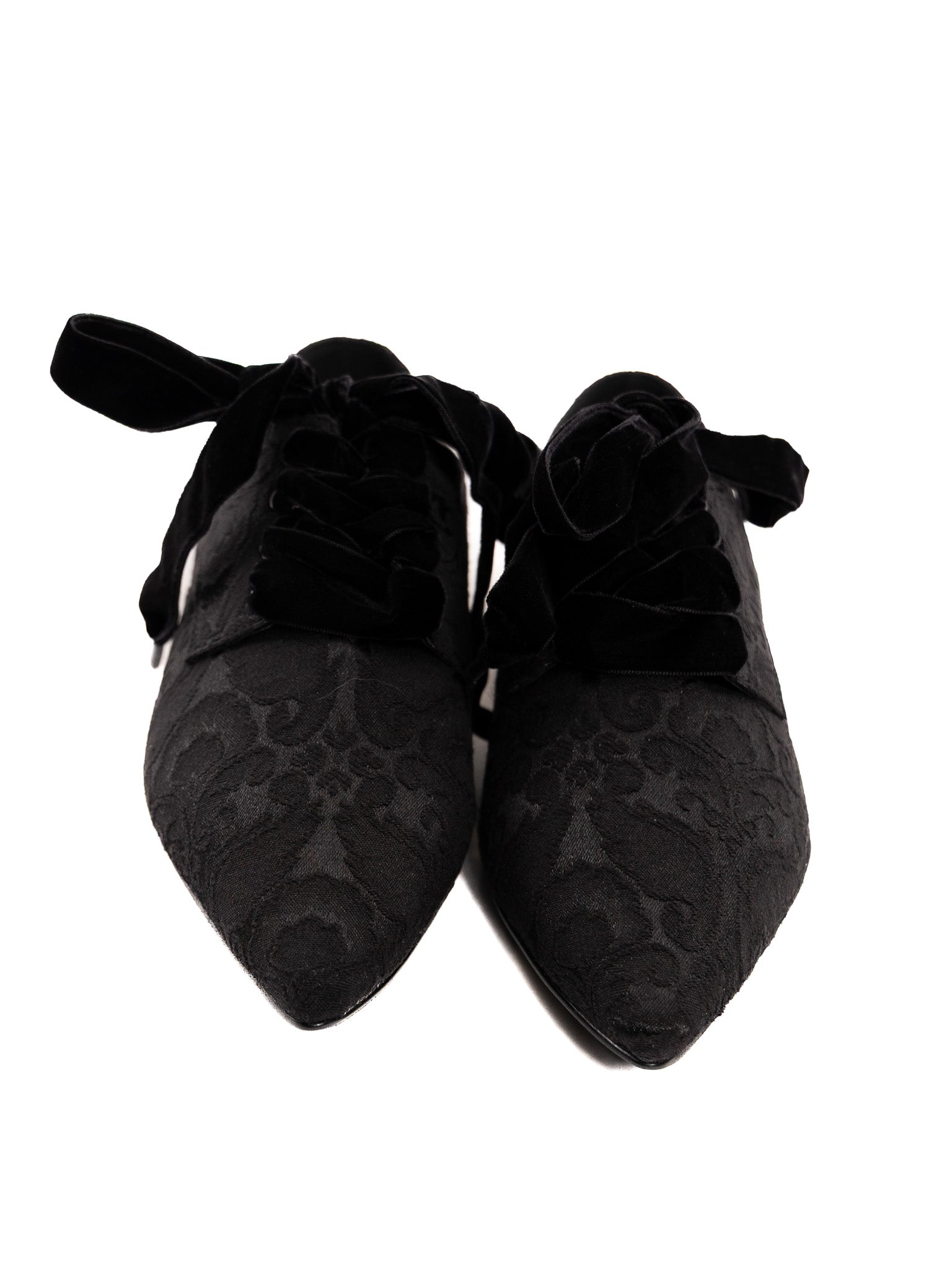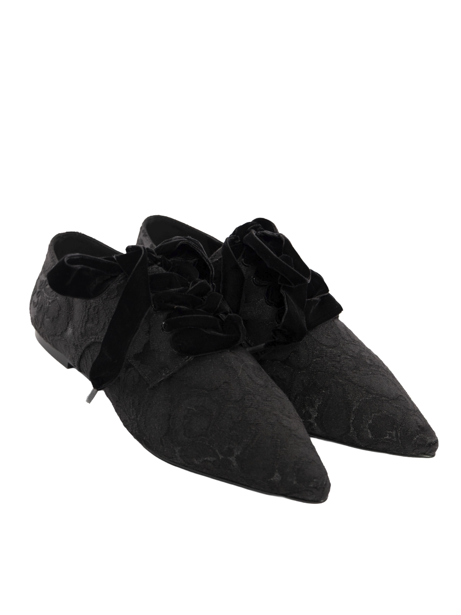 This bold piece combines sleek black cotton brocade with rich velvet laces for a textured twist, all finished on a sturdy black rubber outsole that keeps you grounded. Perfectly edgy yet unexpectedly soft, it’s designed to make your look pop with a hint of mystery and plenty of flair.