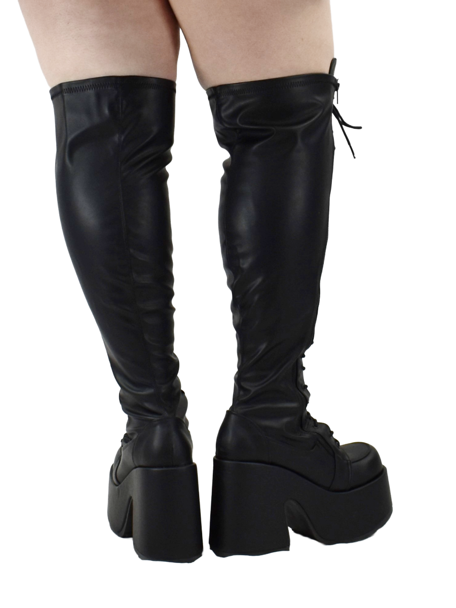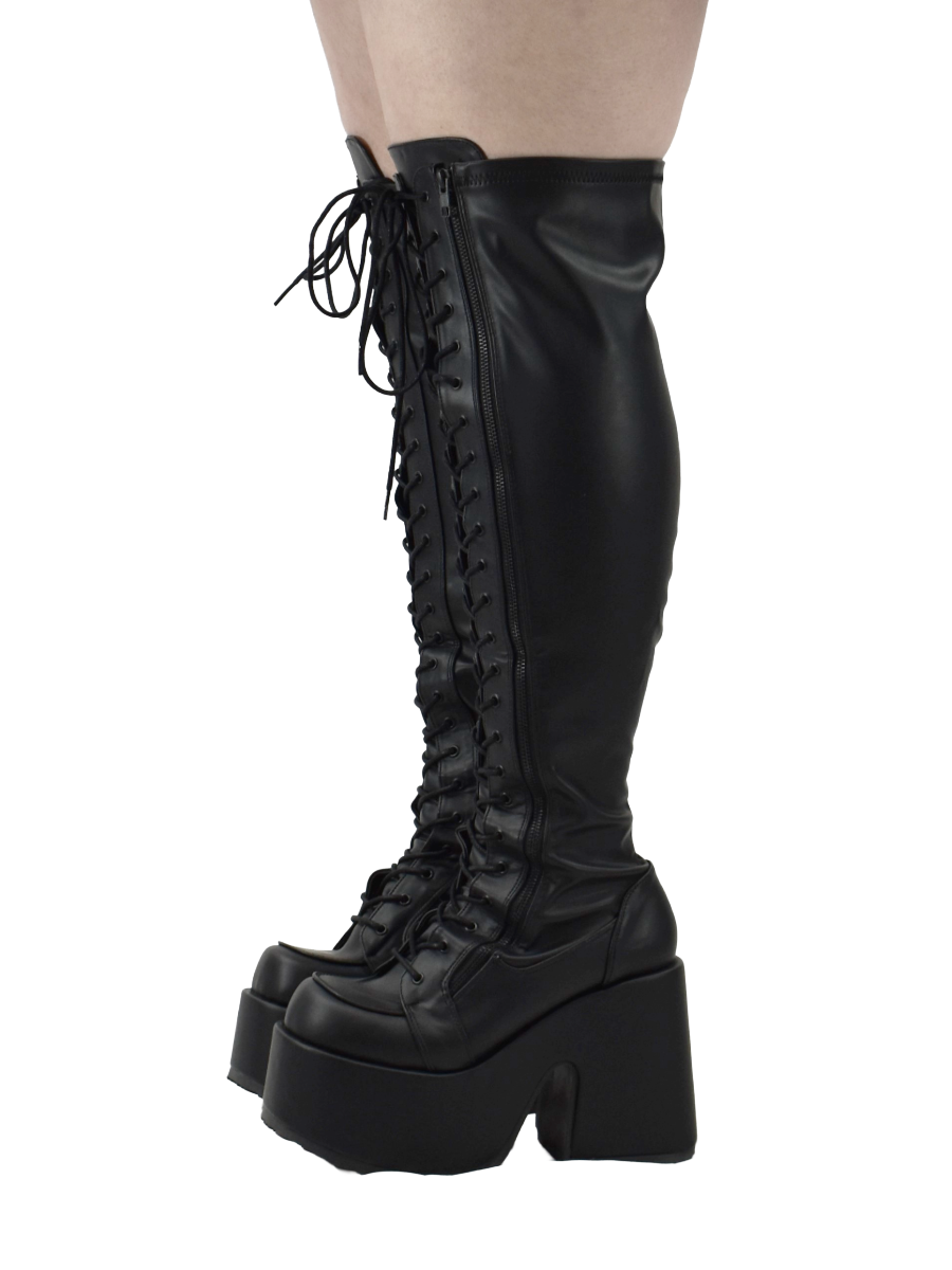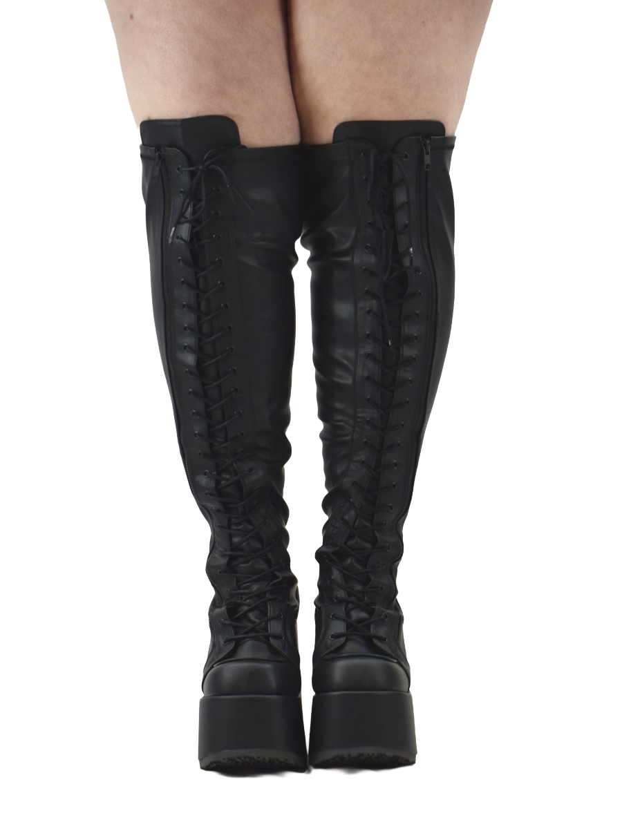 5" Chunky Heel, 3" Platform Lace-Up Stretch Thigh-High Boot, Full Length Outside Metal Zipper