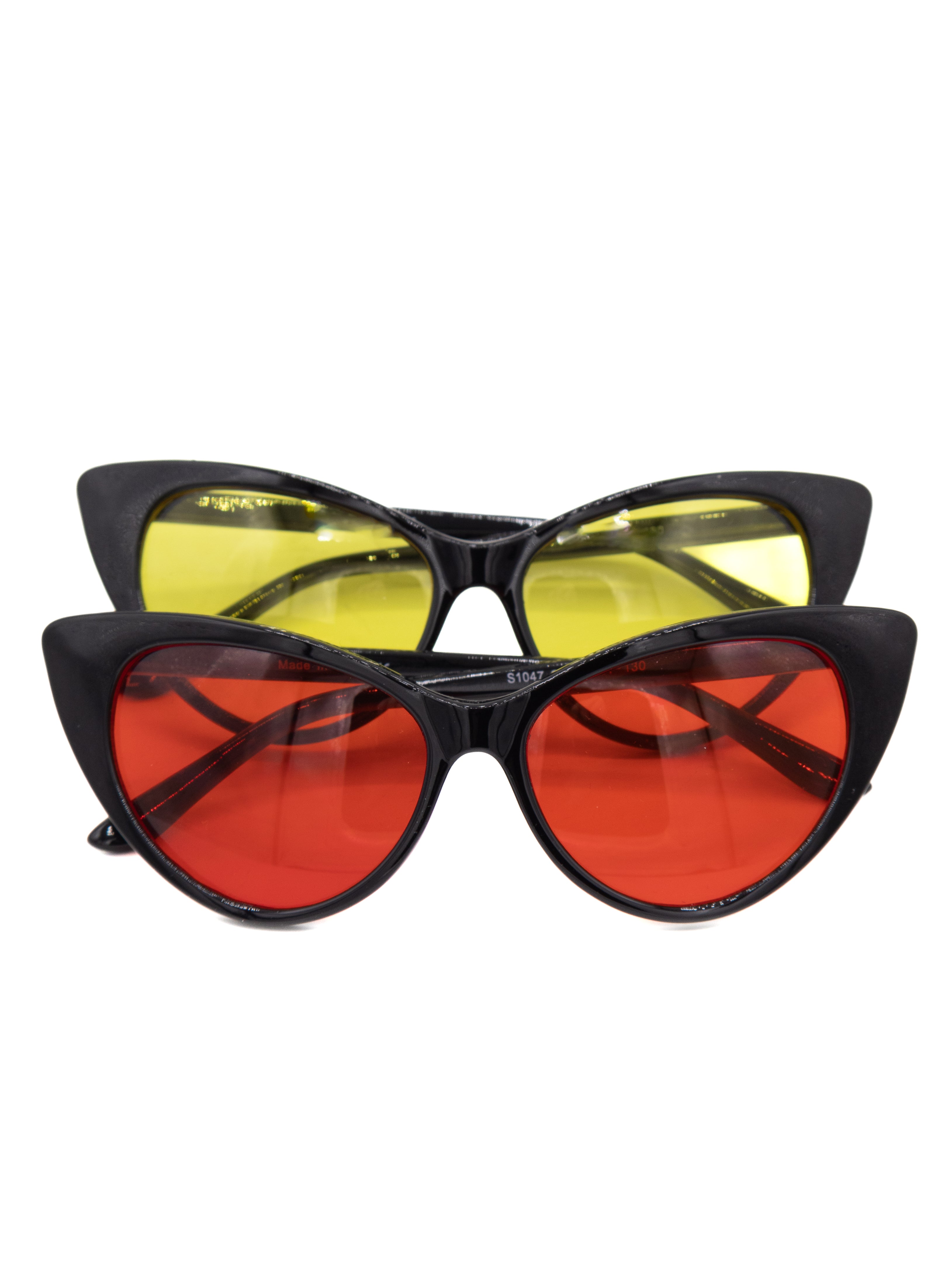These black cat-eye sunnies are a classic shape, featuring yellow or red tinted lenses for a statement.