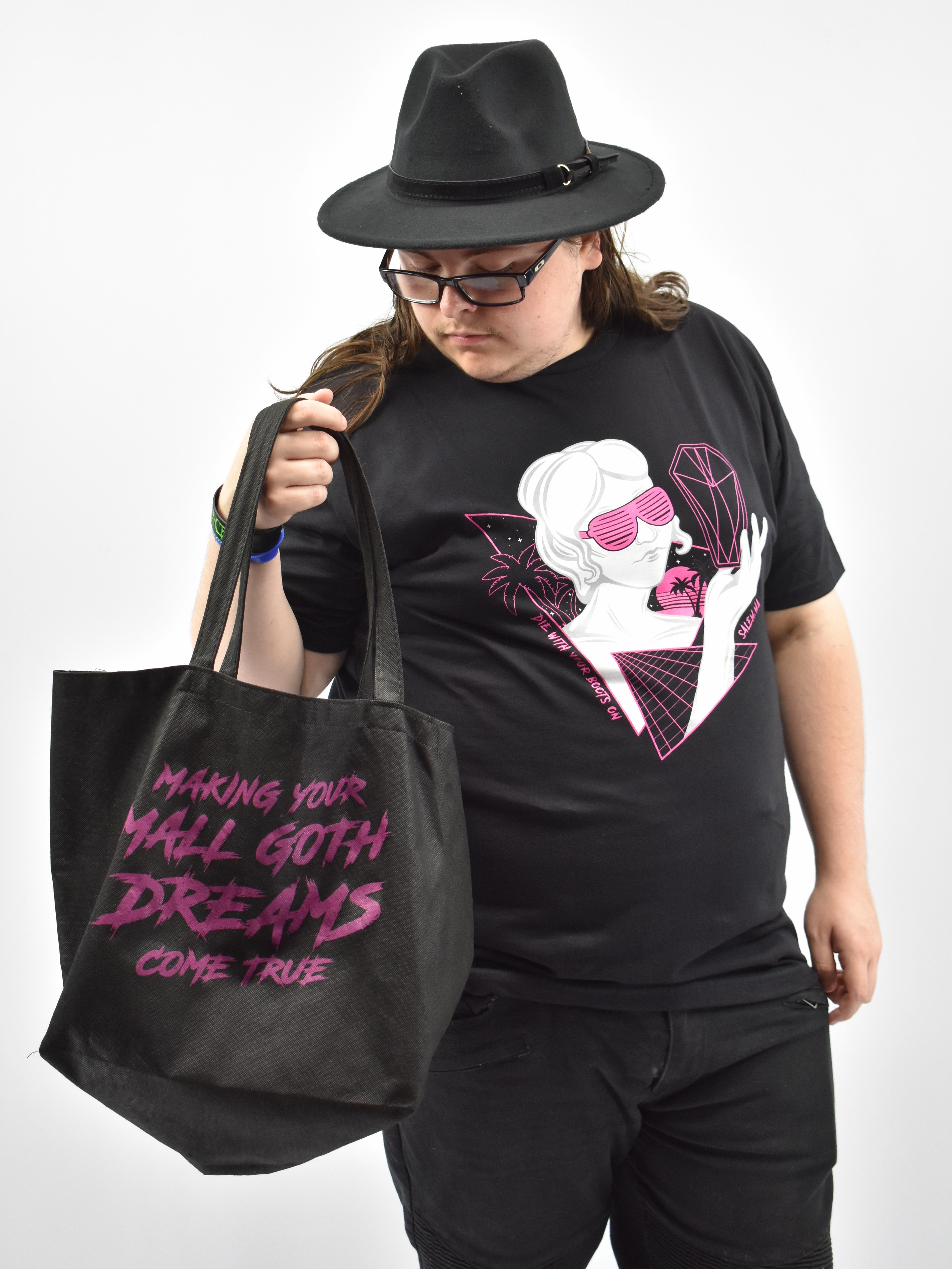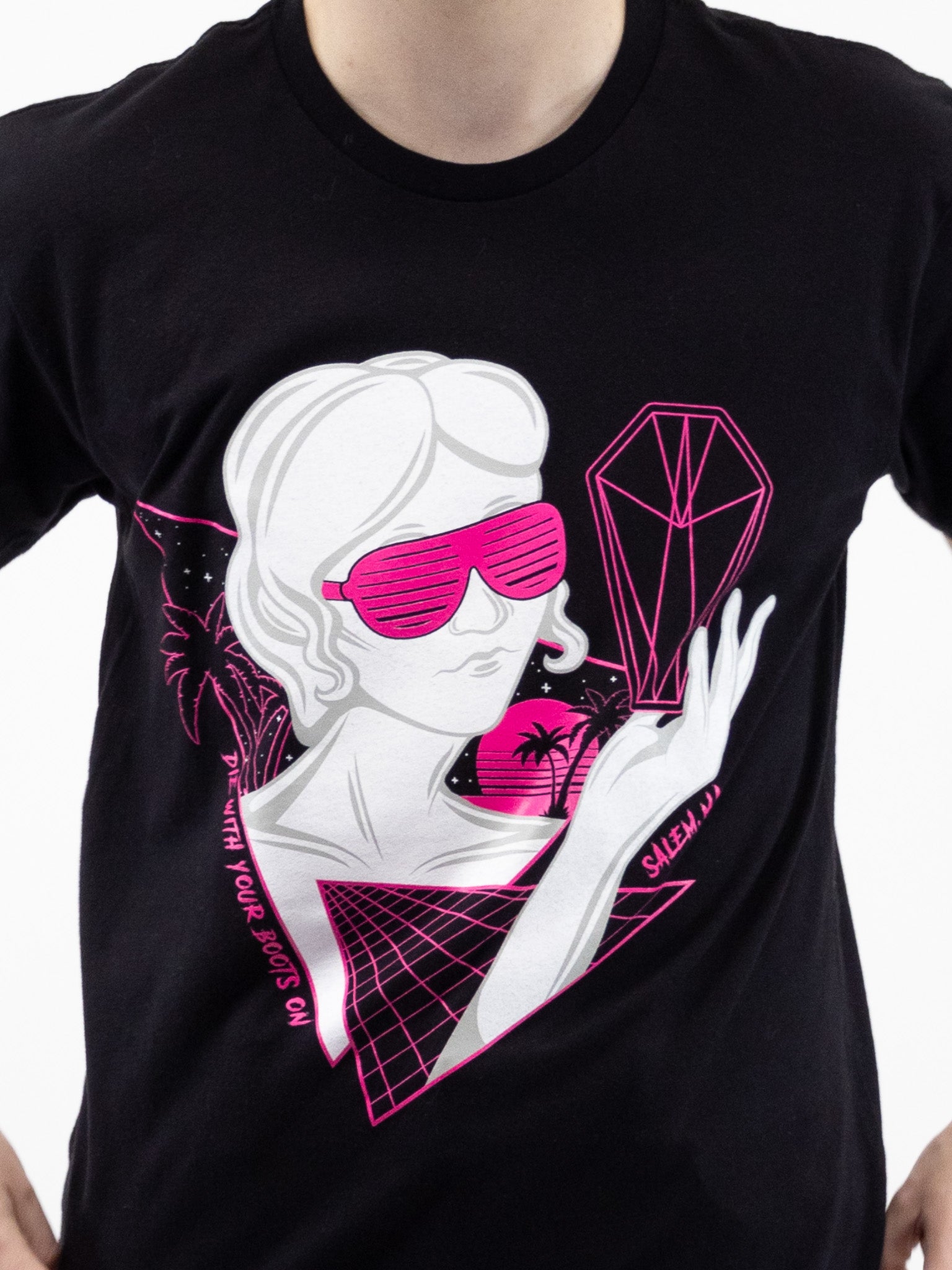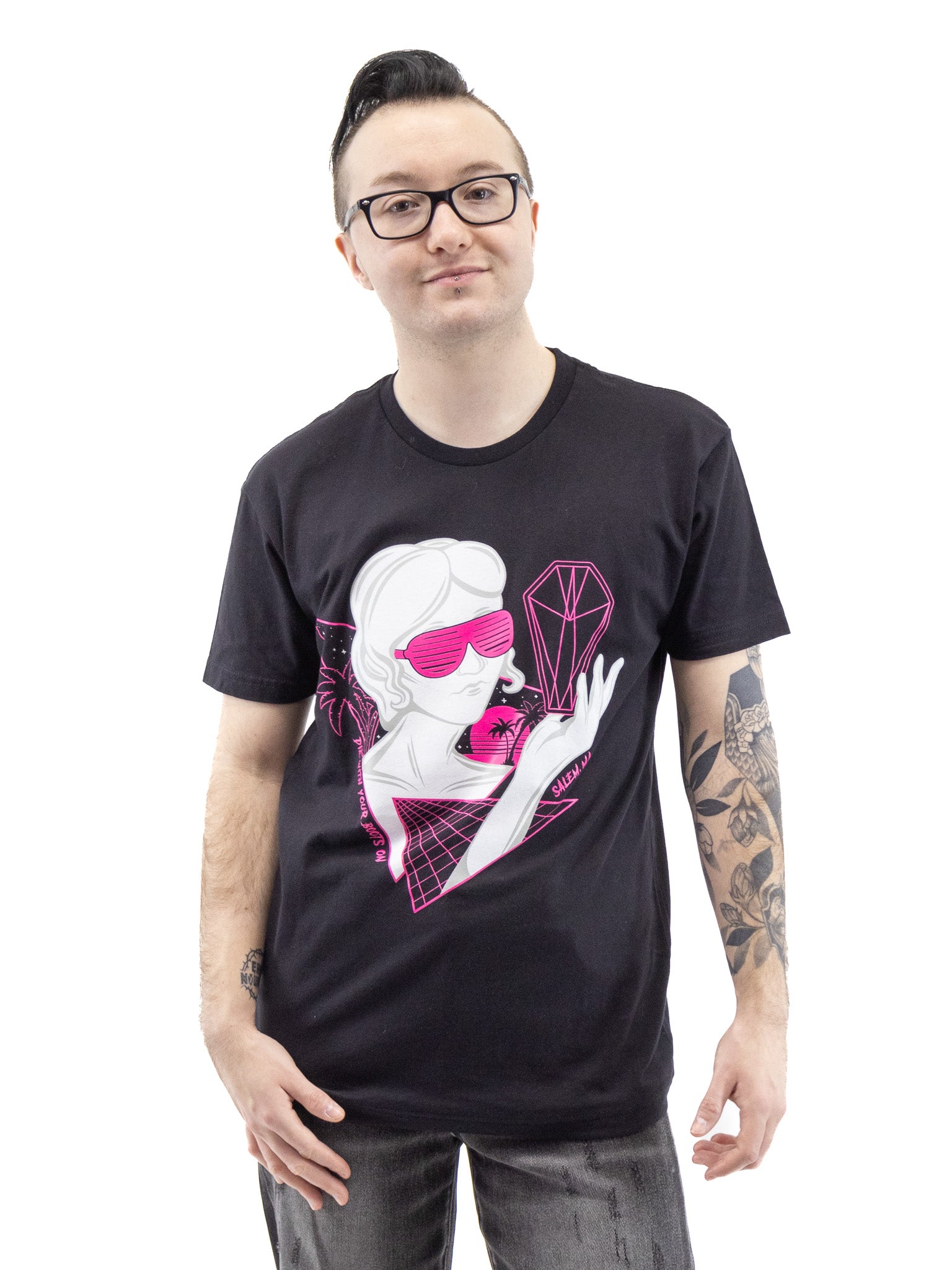 Neon Classical: it's vaporwave, dead mall, and just a dash of Caesar's Palace thrown in. A DWYBO exclusive design by Bats in the Belfry Crafts. Printed by Lucky House Mfg here in Salem. Unisex sizing.