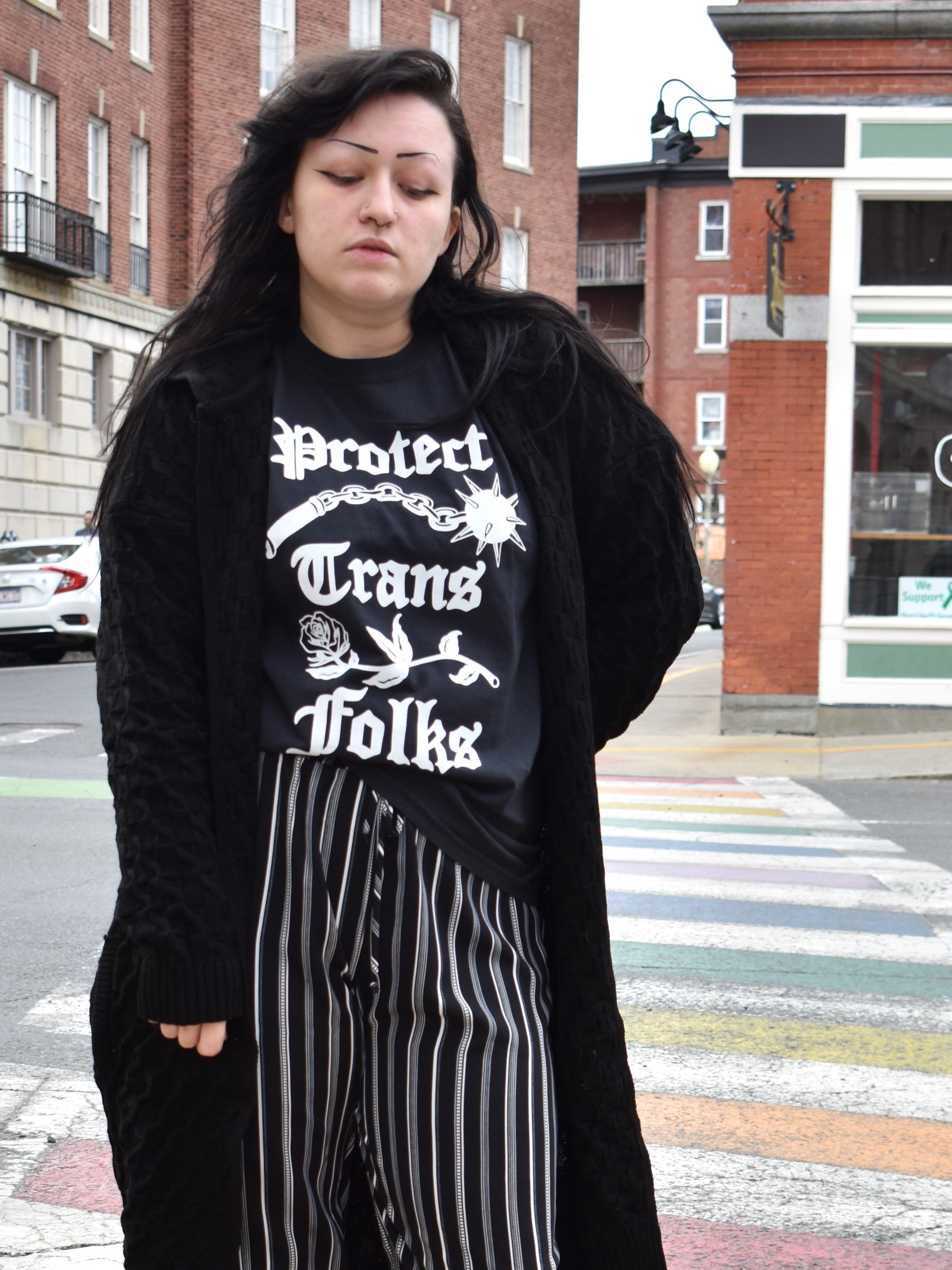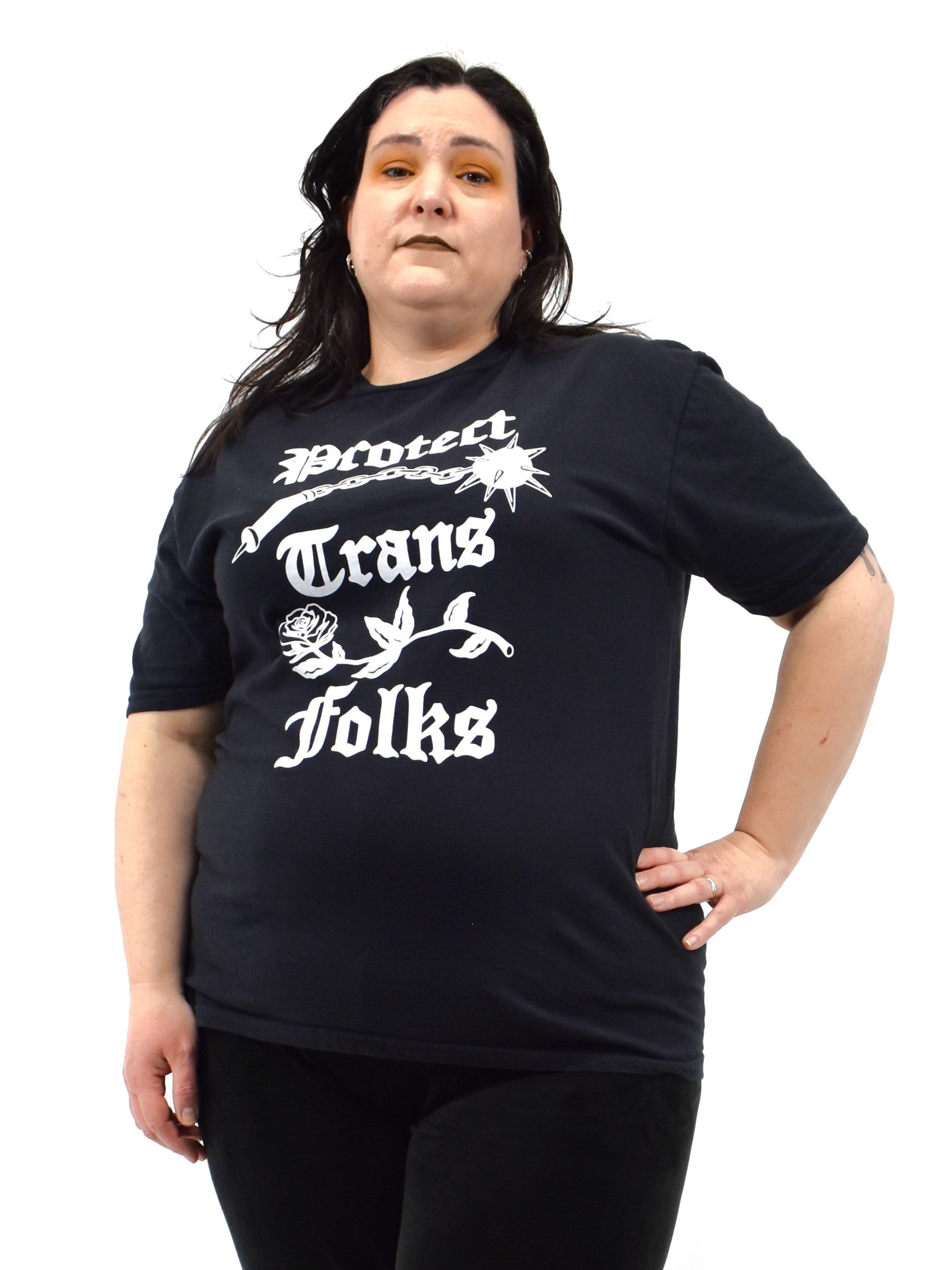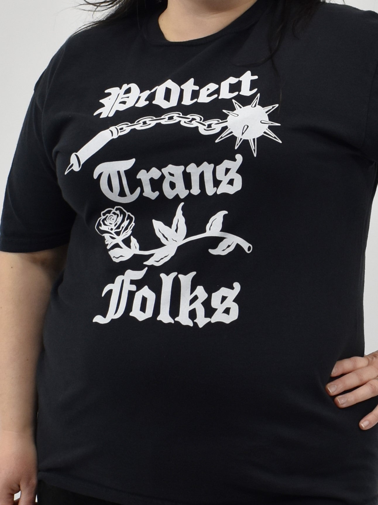 A black short sleeve shirt with the statement “Protect Trans Folks” with a rose and flail between the letters, all in a white gothic font.