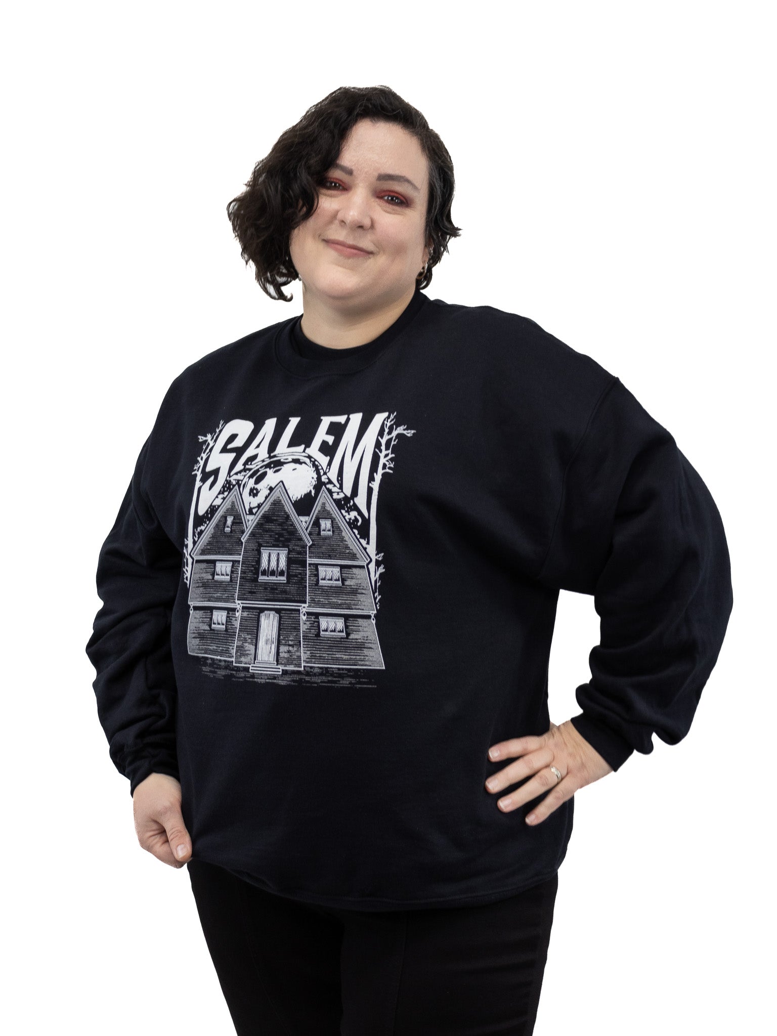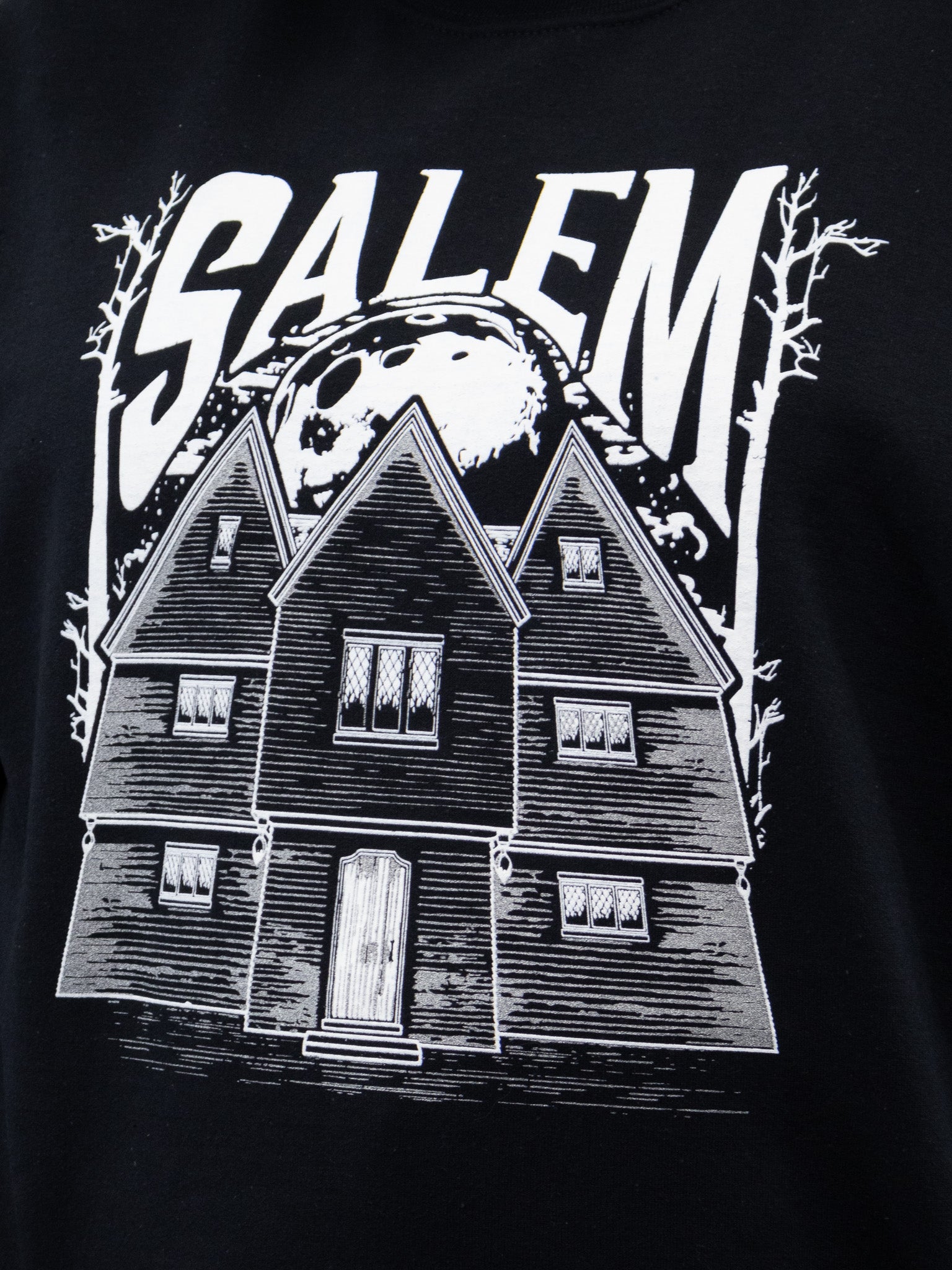 An icon of Salem: the Witch House! Art by Tiffany of Bats in the Belfry Crafts, printed in white and metallic silver ink.
