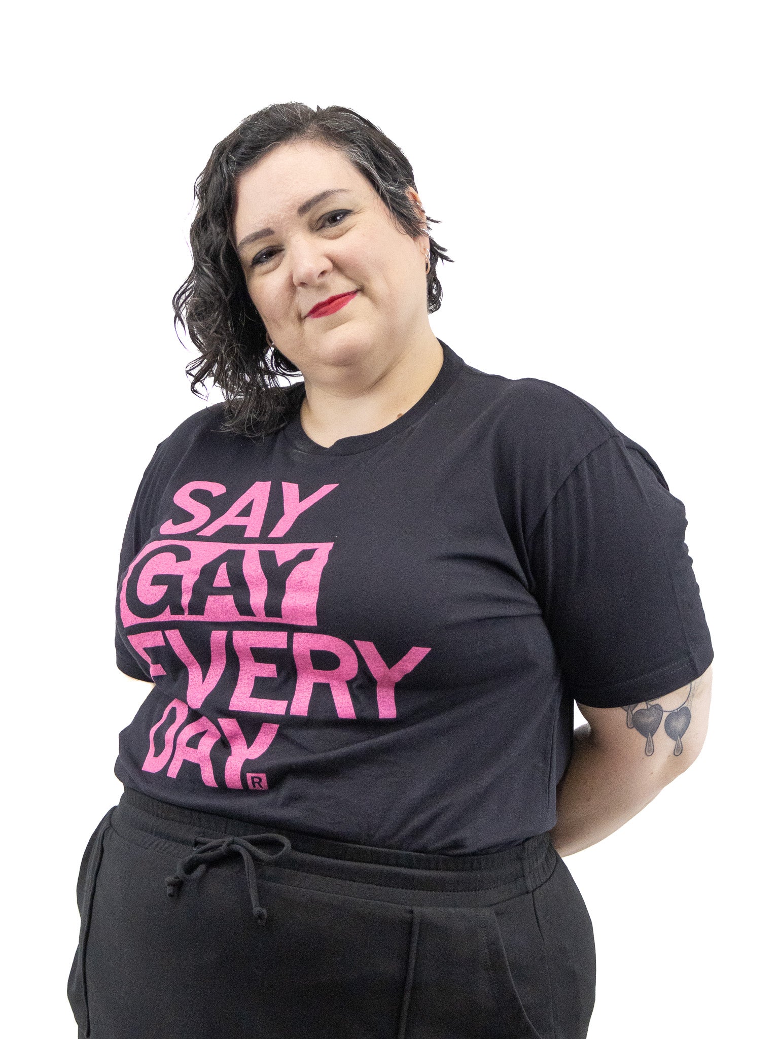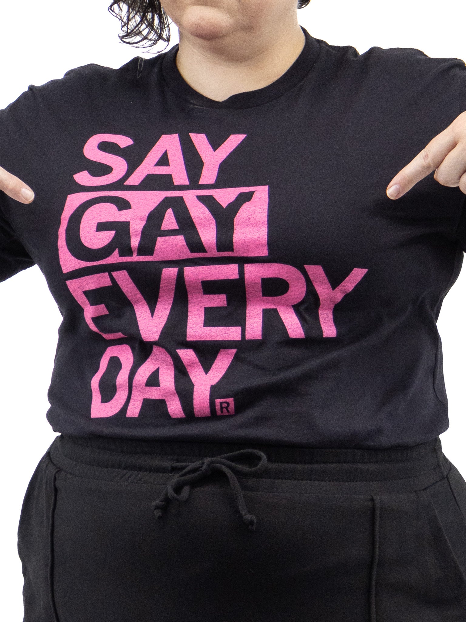 Say gay every day. Aura pink screen print on a black t-shirt (100% combed ringspun cotton). Cut and sewn sweatshop free. Designed and printed by union labor at Raygun. Unisex sizing.