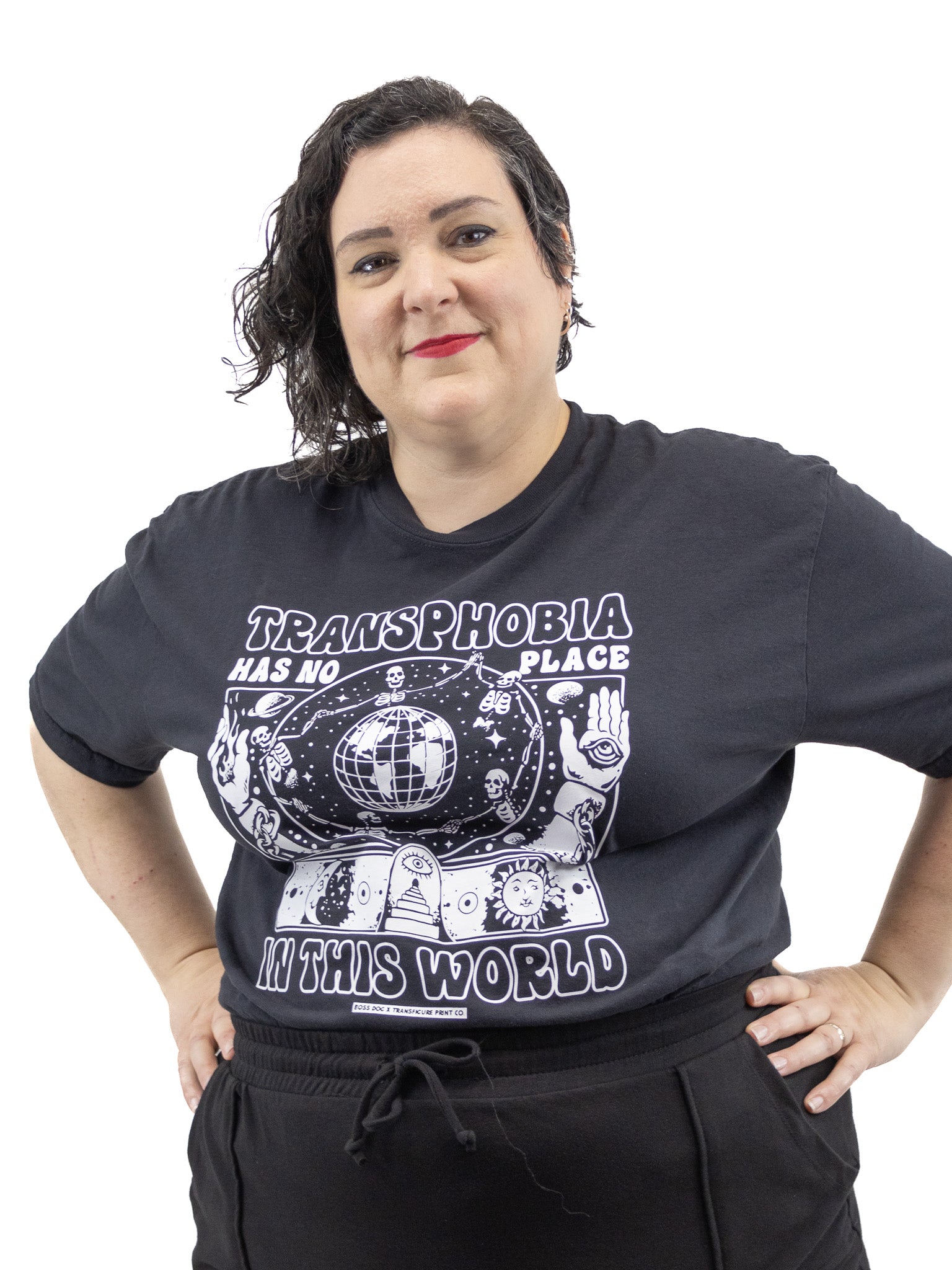 The design reads “Transphobia has no place in this world” and has two hands with broken chains attached, between the hands is a globe with five skeletons dancing around it holding hands. Other design elements floating around the skeletons include tiny worlds and stars as well as a sun and moon.