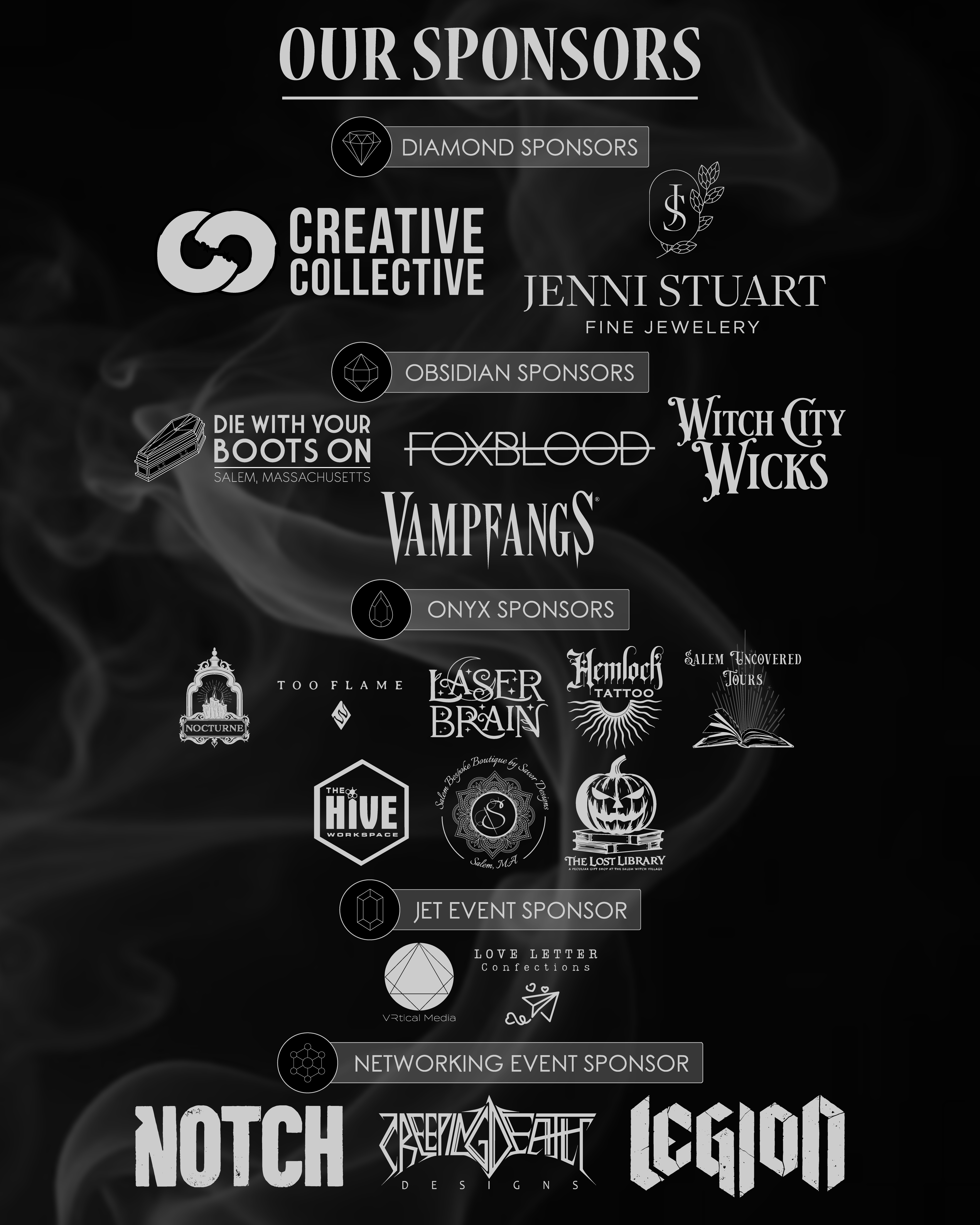 Onyx Sponsors: Hive, Hemlock,Salem Uncovered, Laserbrain Patch Co/Grim North Tattoo, Nocturne, Too Flame,The Lost Library, Salem Bespoke Boutique