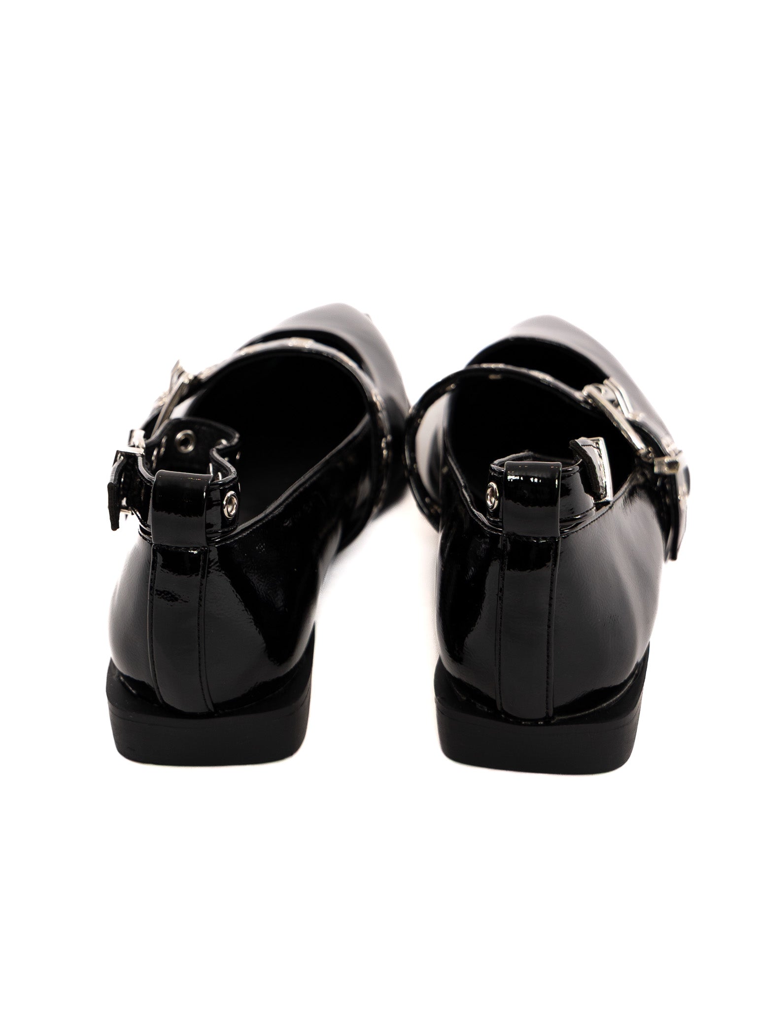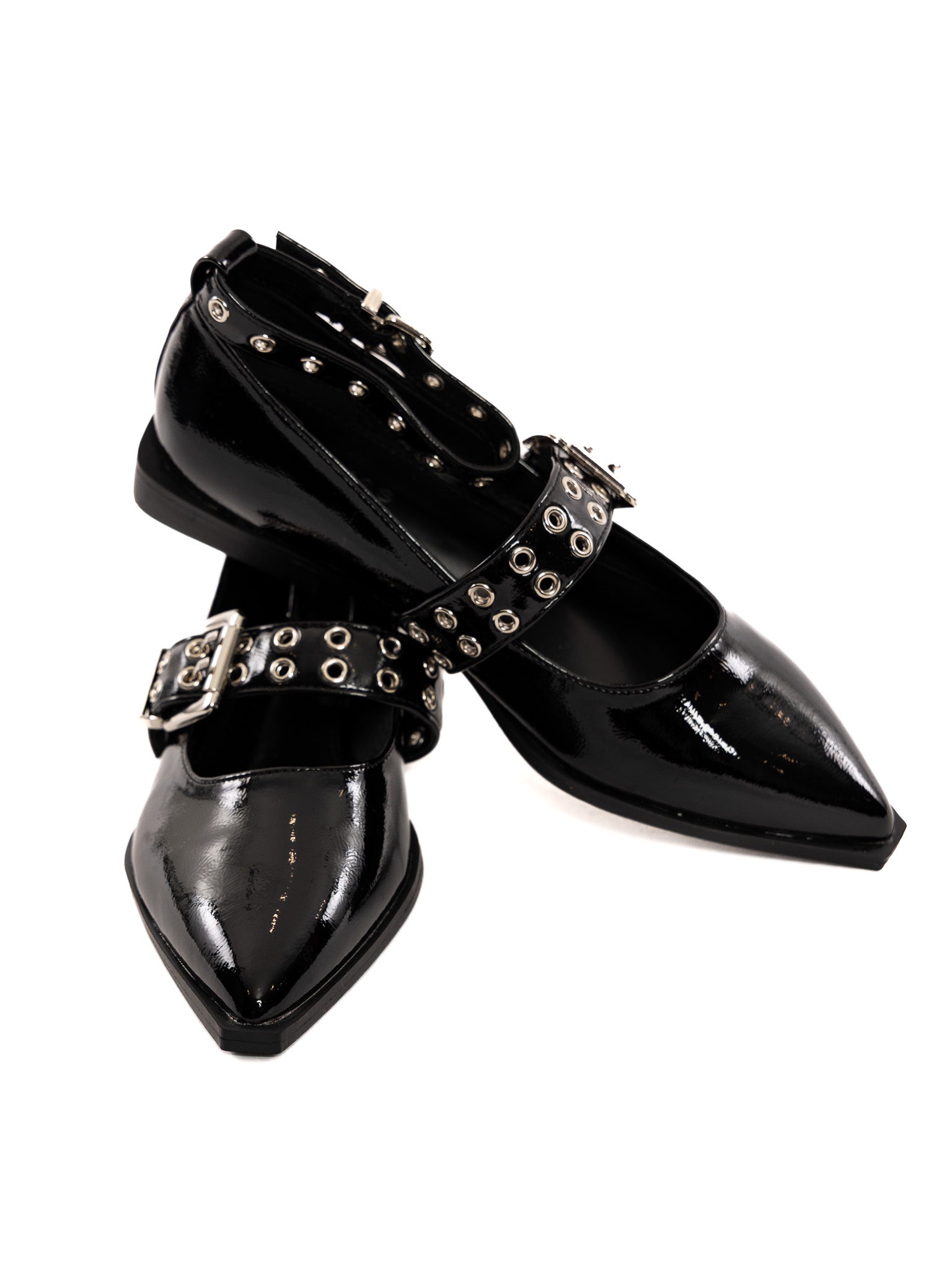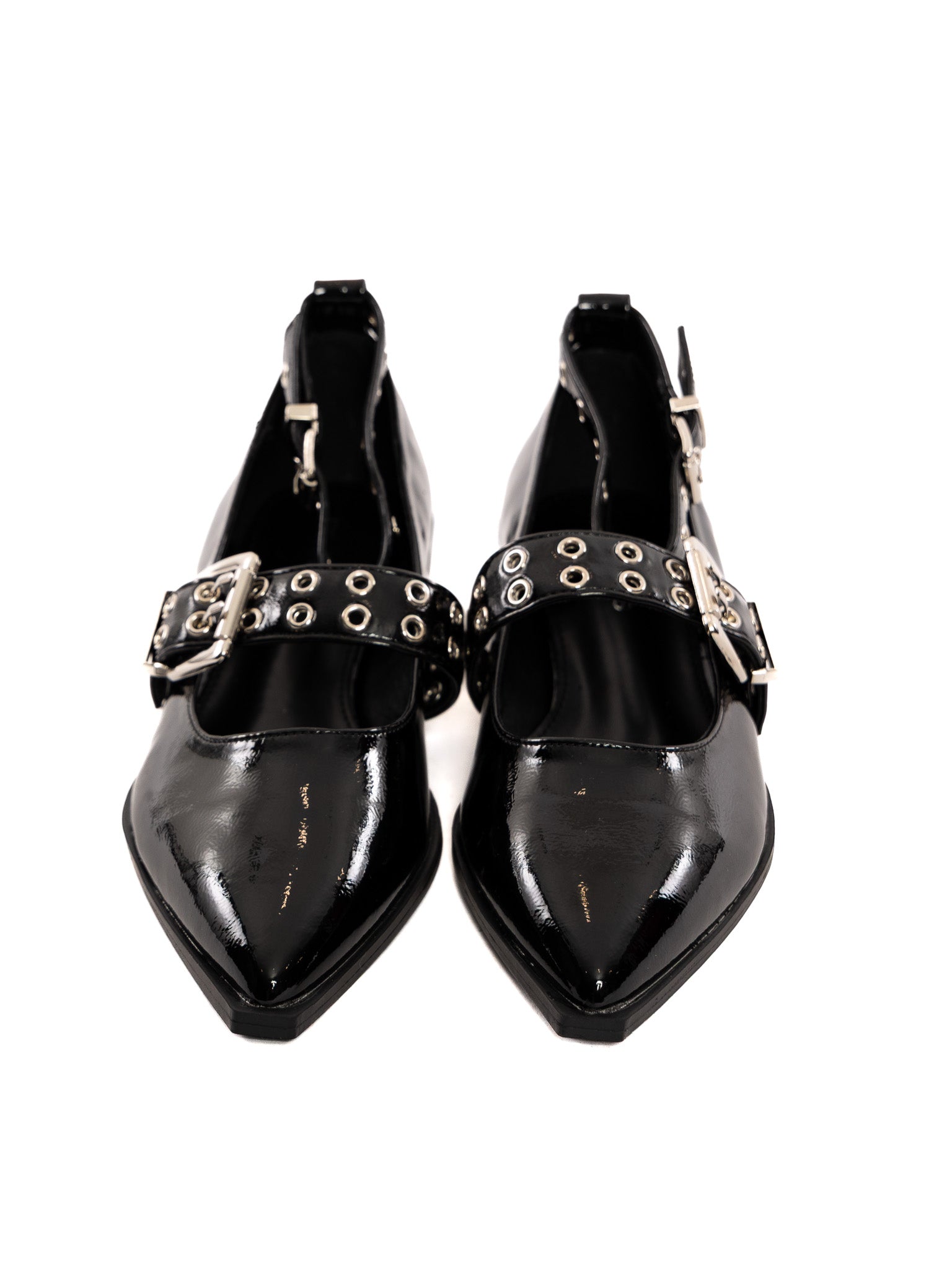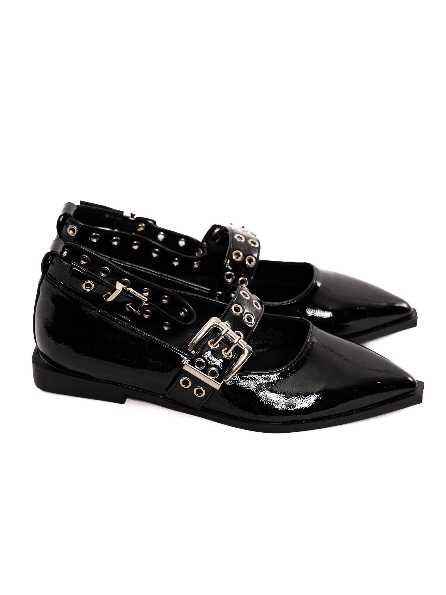 A shiny, punky, pointy toe flat, perfect for dressing up or dressing down. Adjustable foot & ankle straps and a square heel.