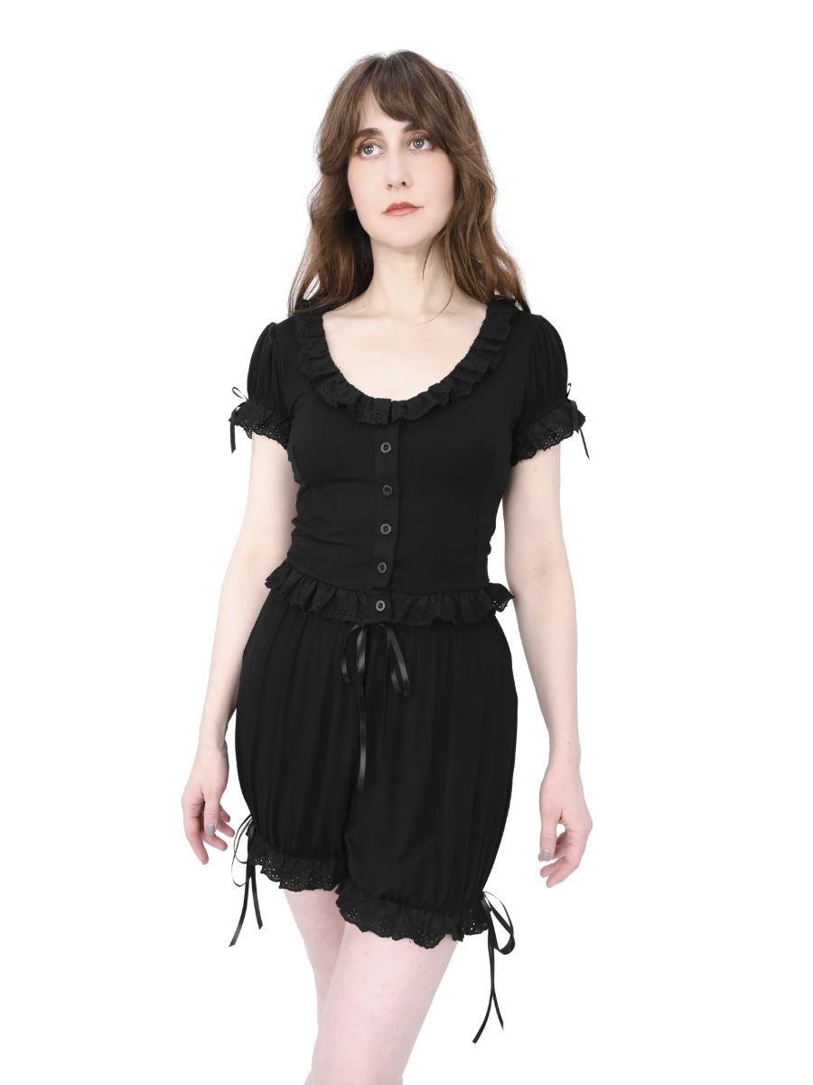 The top features a fully button up front little puff sleeves, and lace and ribbon details. The bottoms have a comfortable elastic waistband as well as lace and ribbon details.